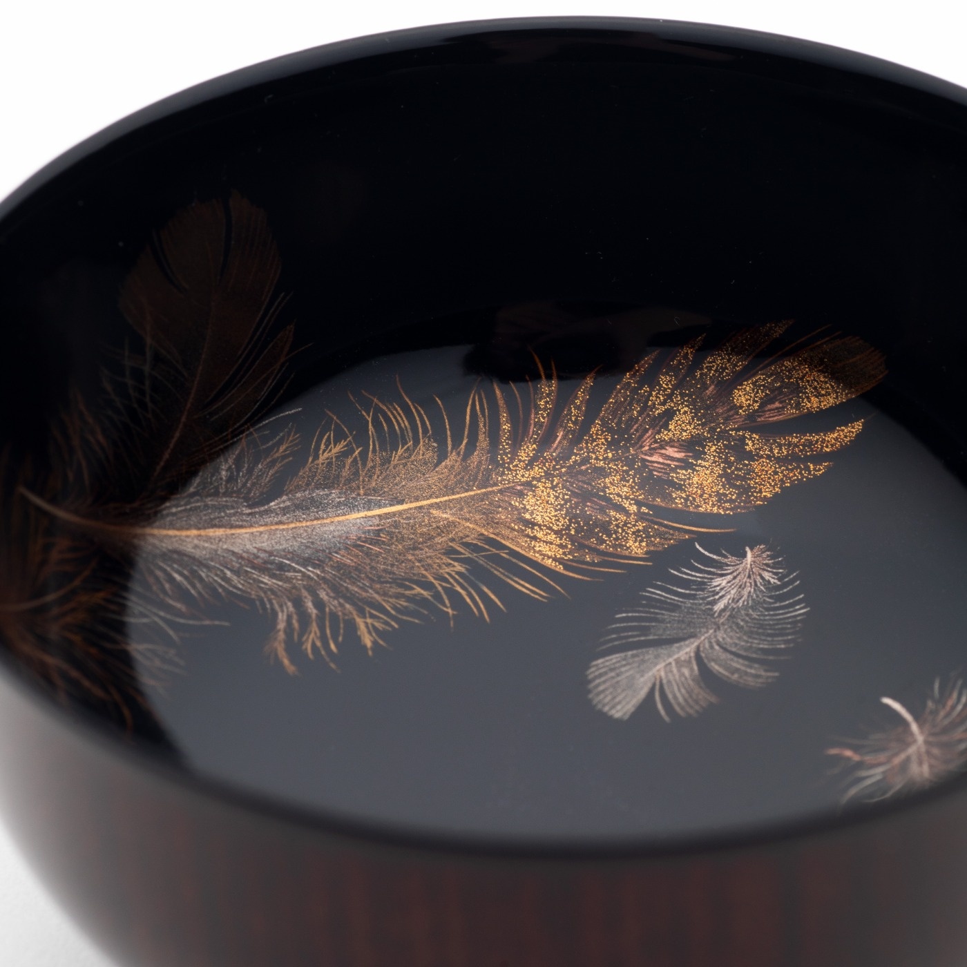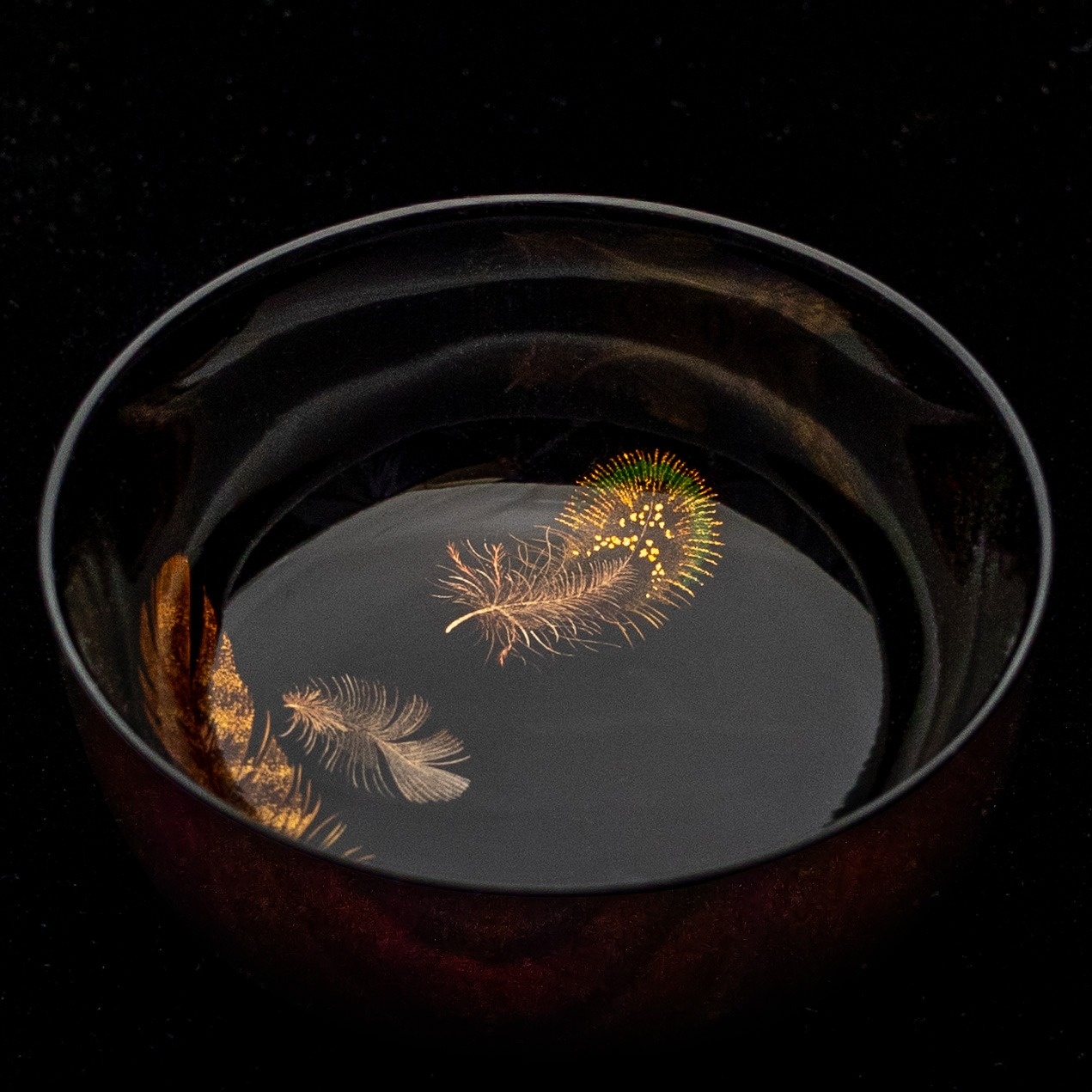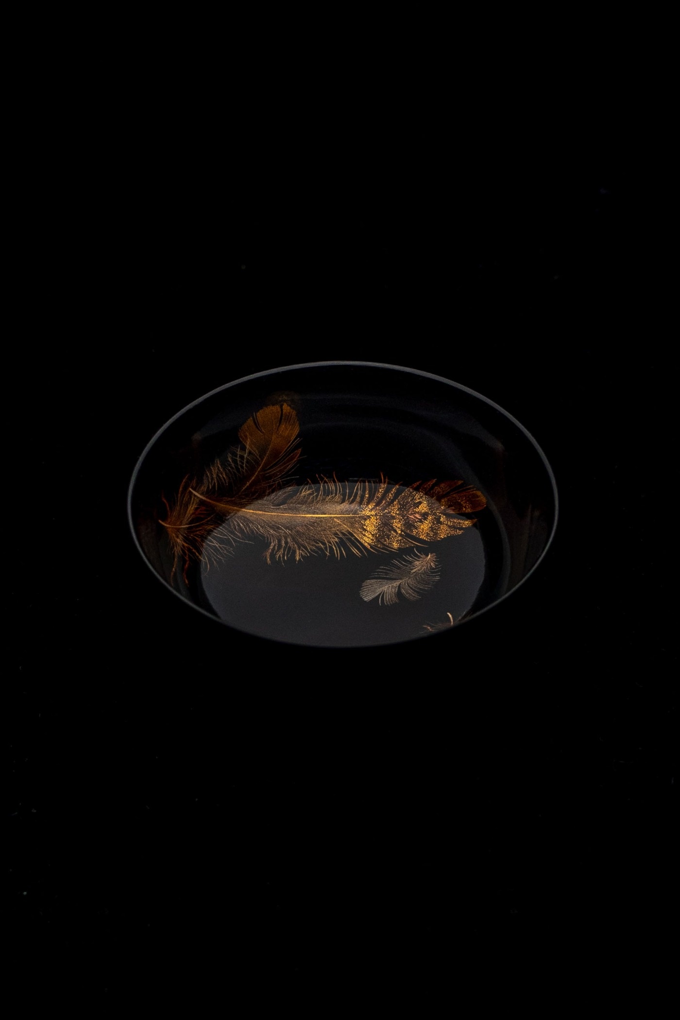 平目粉を多めに使うことで、一つの羽根の中に奥行きのある模様を描けたと思います。形が深めの杯なので、見込みのいちばん深いところから立ち上げる曲面部分に、蒔絵筆で羽根を描くのはかなり難しいことなんですね。難しいとふつうは描きませんが、あえて描くことによって見所になりますし、また、お酒を注いだ時のゆらめきとか、レンズ効果で金粉の粒が際立って見えるといったことも、この曲面部分に描くことで表現できると考えました。