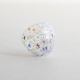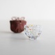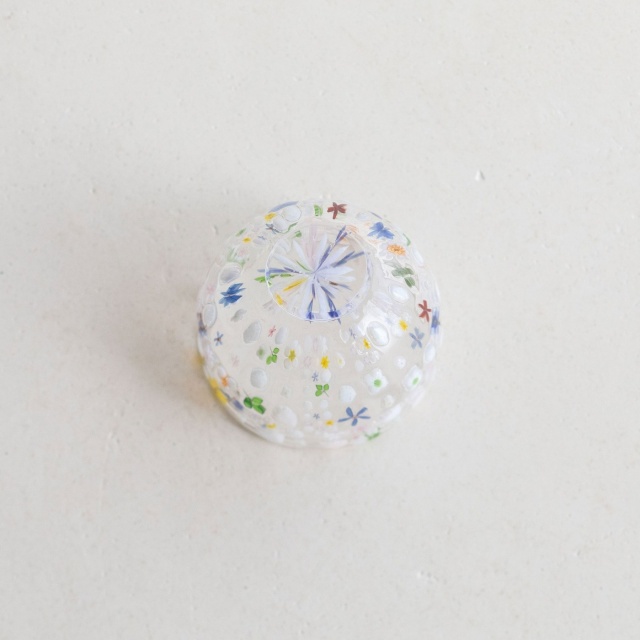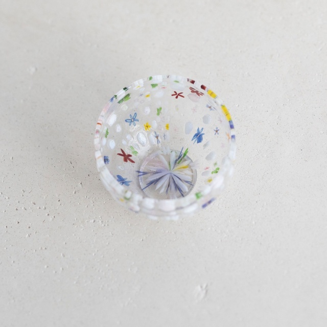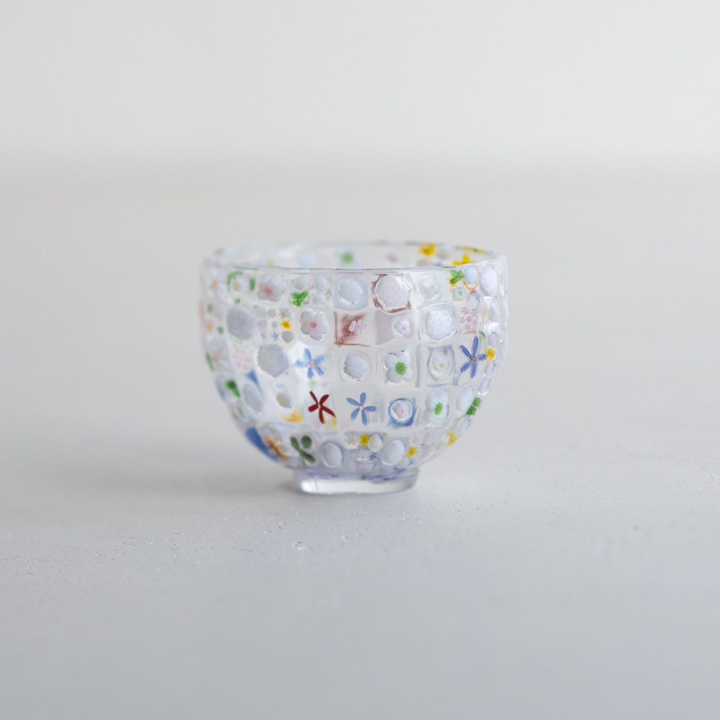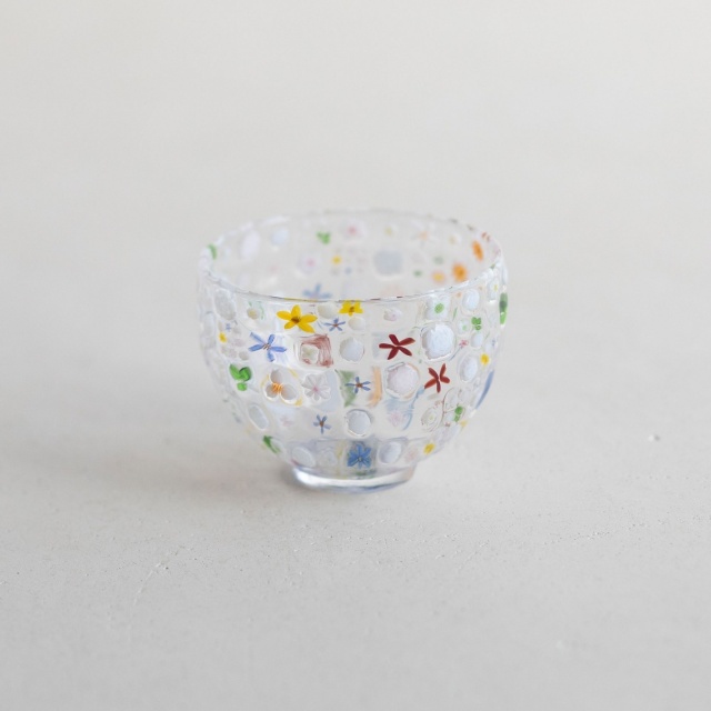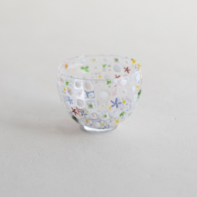 江波冨士子さんのガラス器「花の庭」は、バラ、デイジー、シュウメイギク、ナデシコ、ヤマボウシ、ツユクサなどたくさんの花が咲いています。ムリーニ、ムリーネと呼ばれるイタリアの古典技法を用いた制作で、花の一粒ずつを吹いてつくることから始まります。酒器袋には、イタリアのルベッリ工房の絹地と、何とも愛らしい香色(こういろ)の緒を合わせています。酒器袋はtextile n+R の制作です。