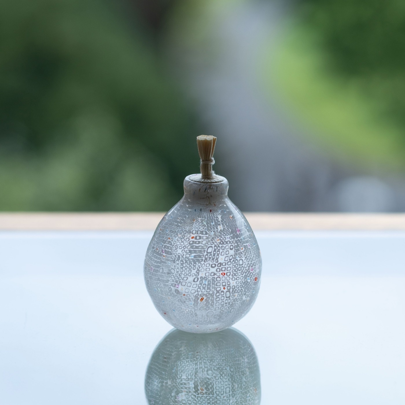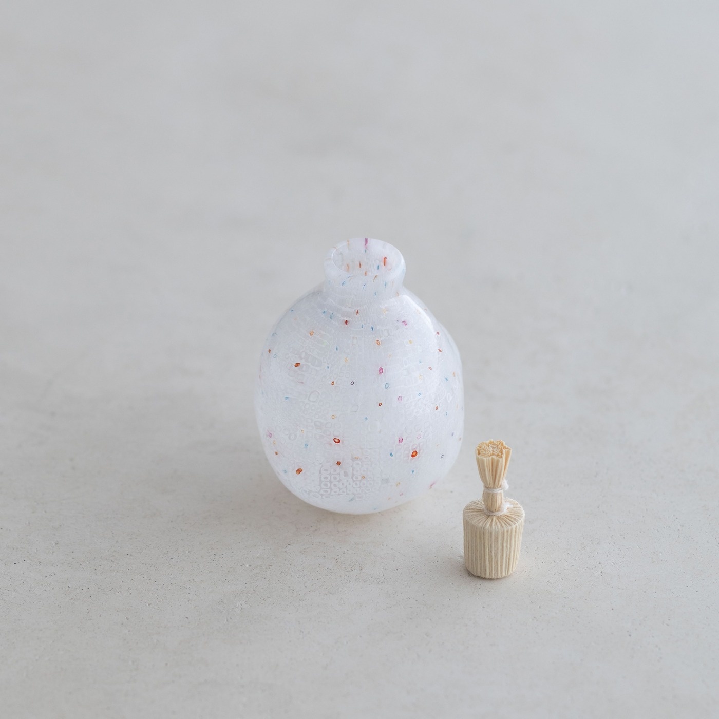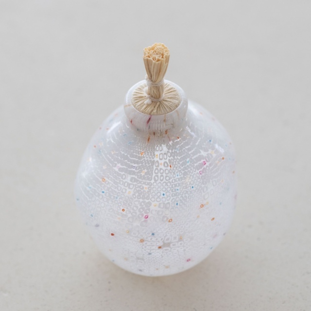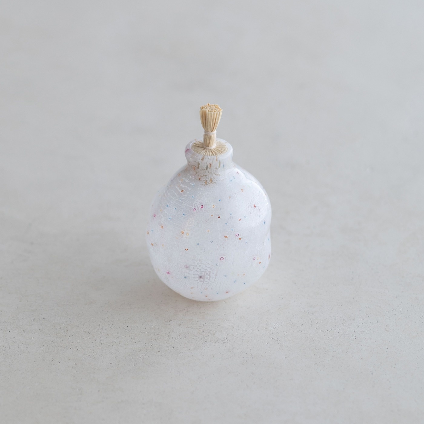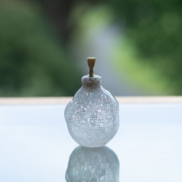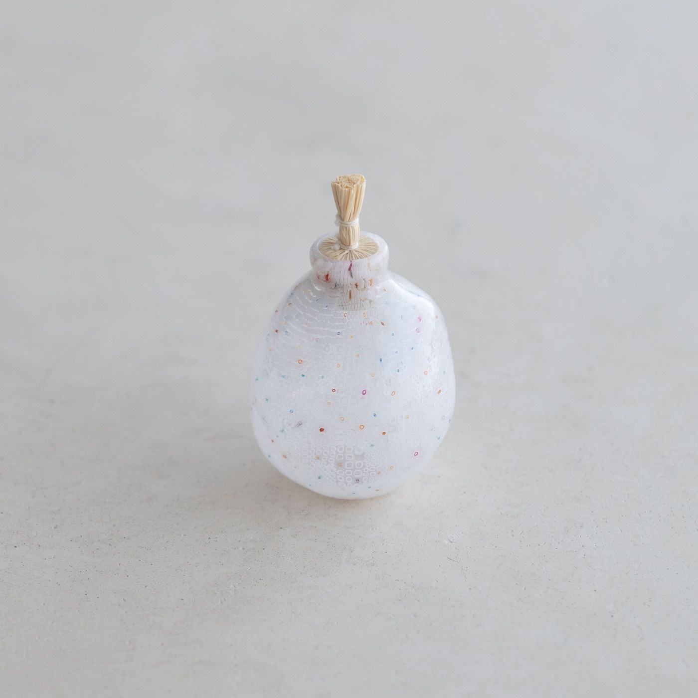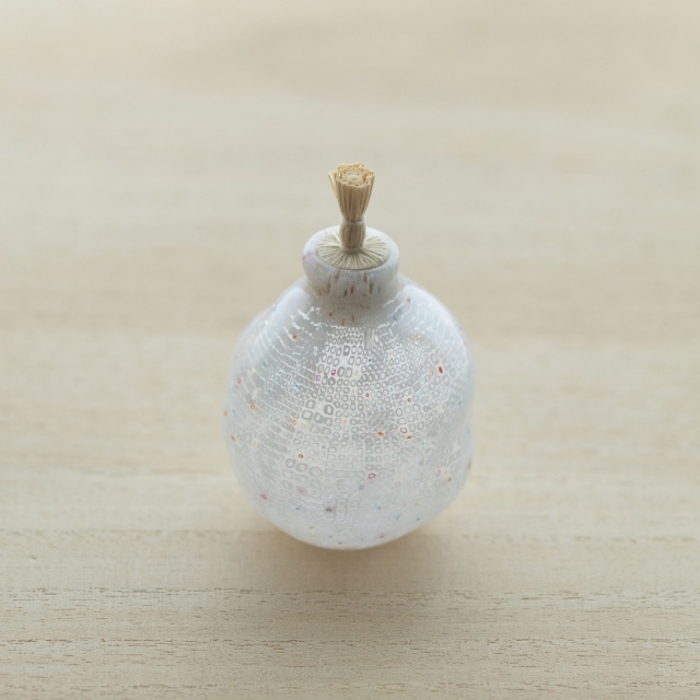 角度によって雲のように見える、不定形なボディが印象的な振出です。よく見ると、白い雲の粒子の合間に、小さく鮮やかな色が見えます。彩雲は、太陽の光が雲の水滴と織り成す現象で、吉兆ともいわれています。