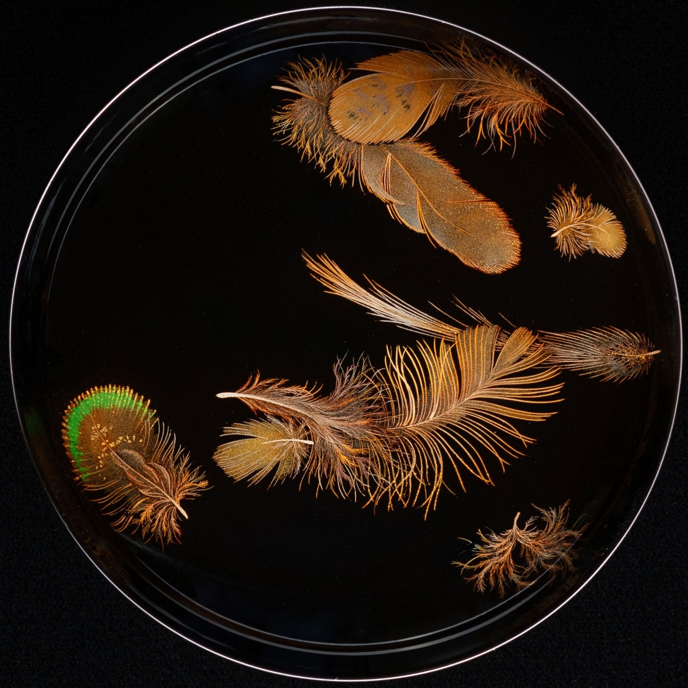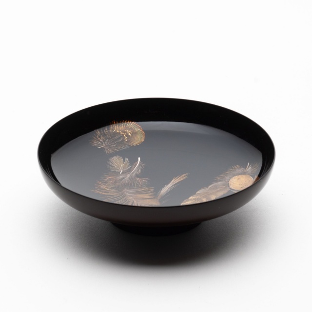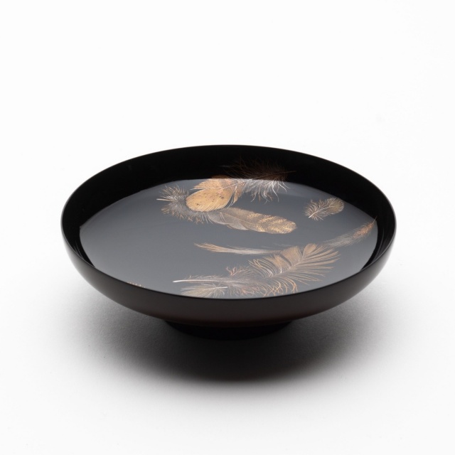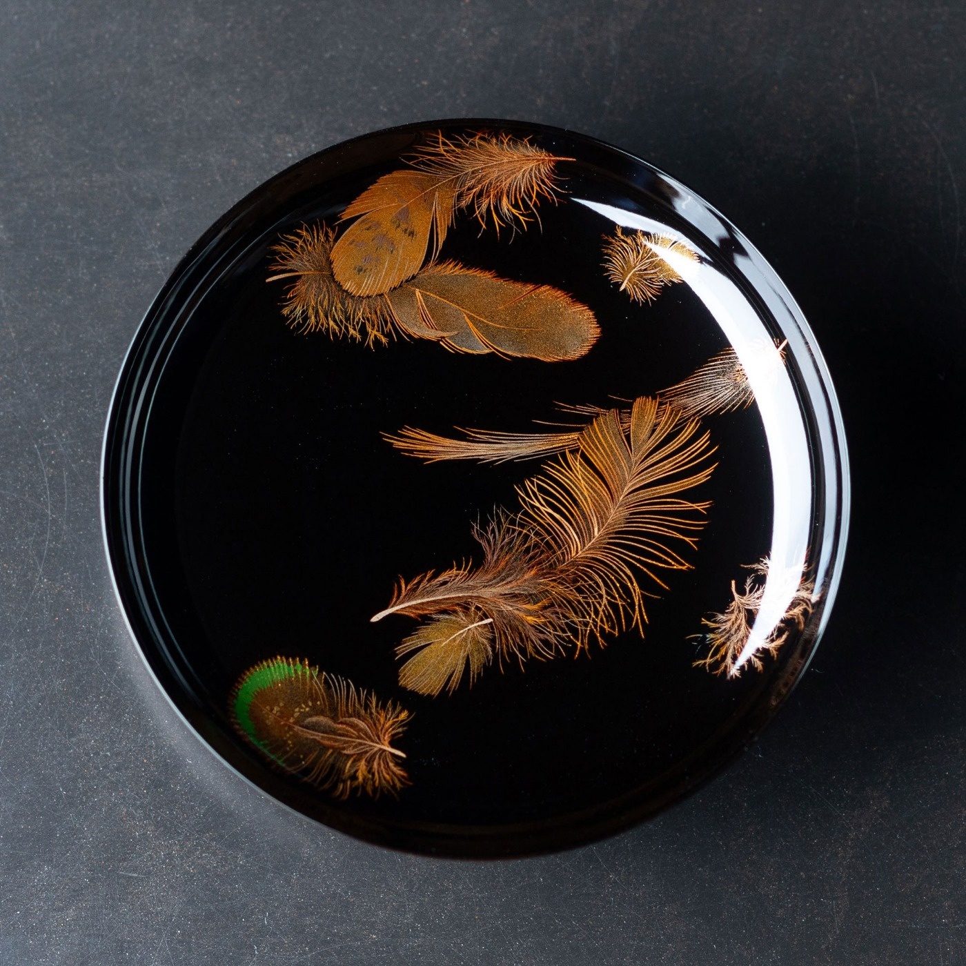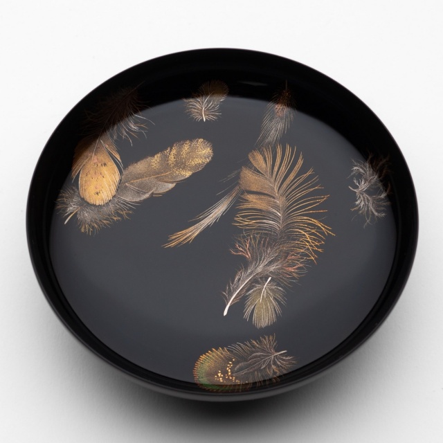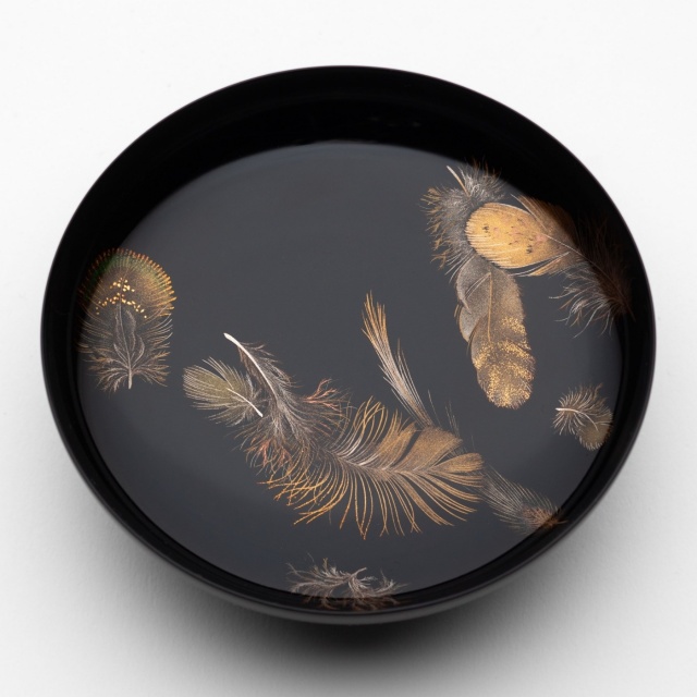 緑色の漆を使った羽根、ふわふわの羽毛、重なり合う表情の違う羽根など、華やかな羽根蒔絵です。