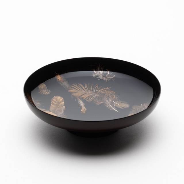8種類の羽根は、いかに羽根のように見えるか、ということを研究しながら創作したそうです。この杯では平目粉という金粉を使用しており、それによって羽根に奥行きのある表情、少し強めの金の輝きが生まれました。