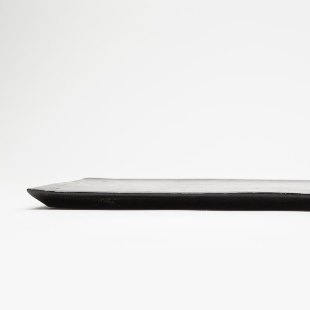 すべすべとした触感の中にも手がかりのある表情、独特の奥行きと艶のある黒色など、オリジナルの質感が魅力的な安齊さんの作品。成形した陶土を焼き締まる直前まで焼いてから、土に漆を入れたものを塗って磨いてを8〜10回繰り返し、最後に焼き付けて少し磨いています。板皿は重量があり、安定感もあります。