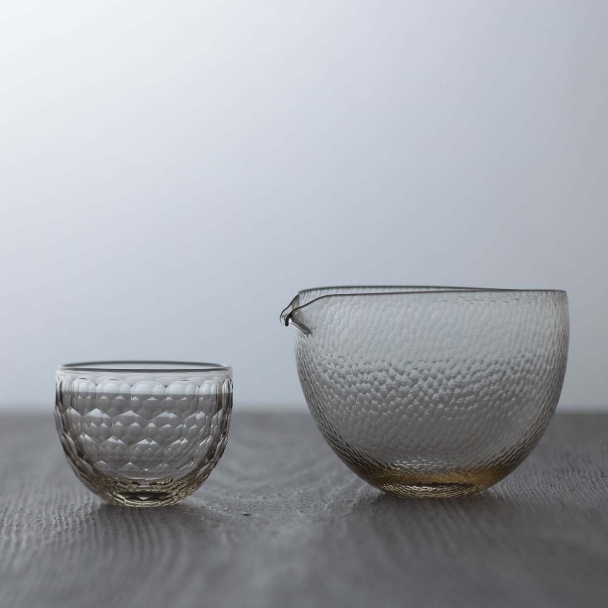細かな鎚目のカットが凜とした、丸みのある片口。ほんのり色味のあるガラスです。