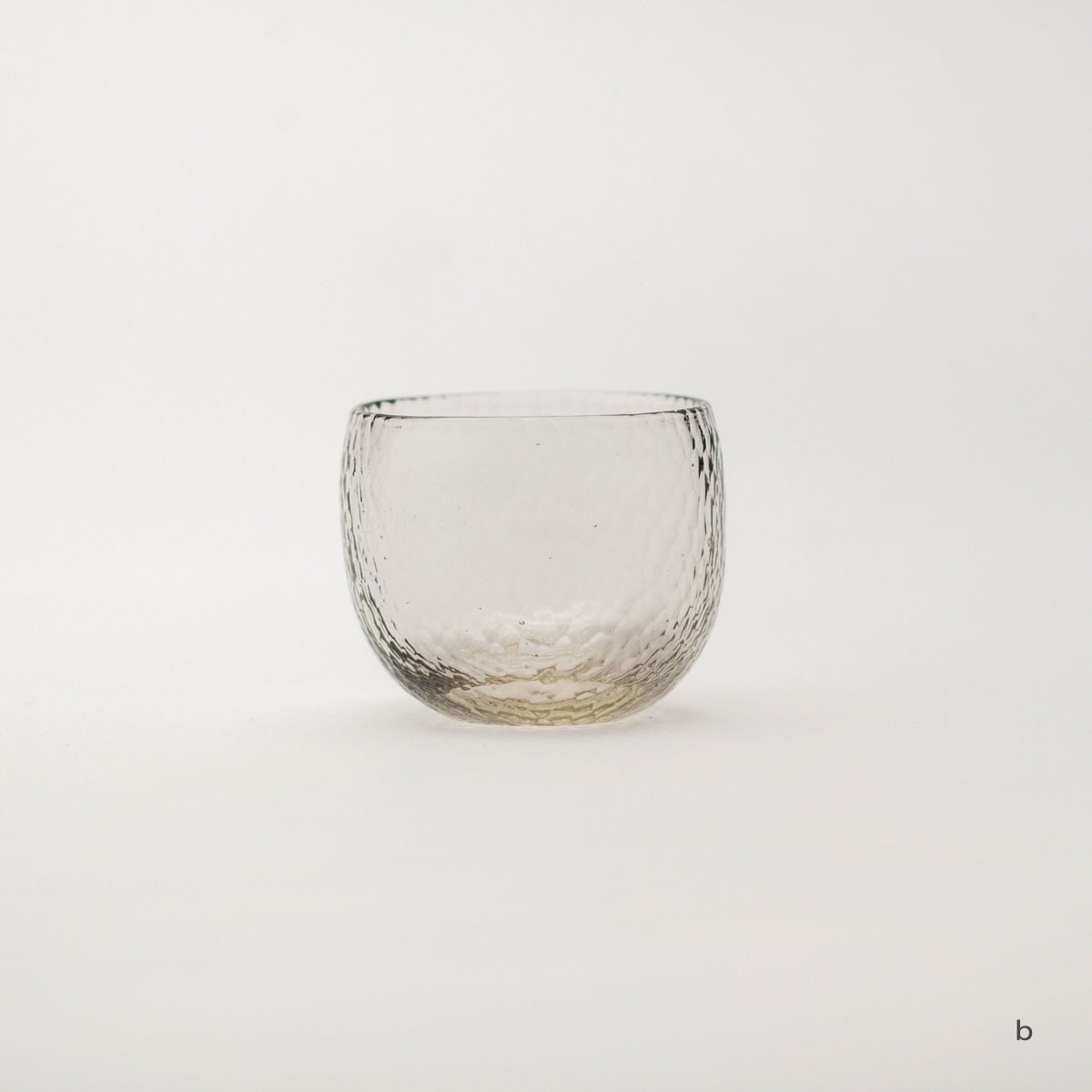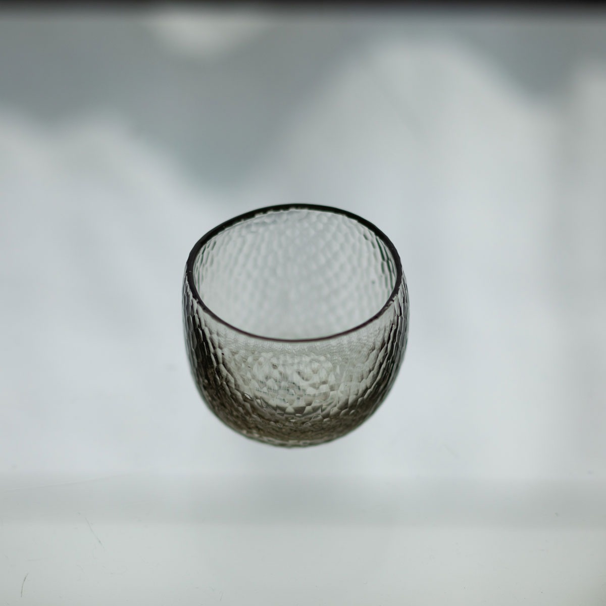 小ぶりで少し歪んだ丸みが愛らしい酒吞です。見た目はもちろん、指先にも細かな鎚目を感じられます。無色透明ではなく、やや色味を帯びています。