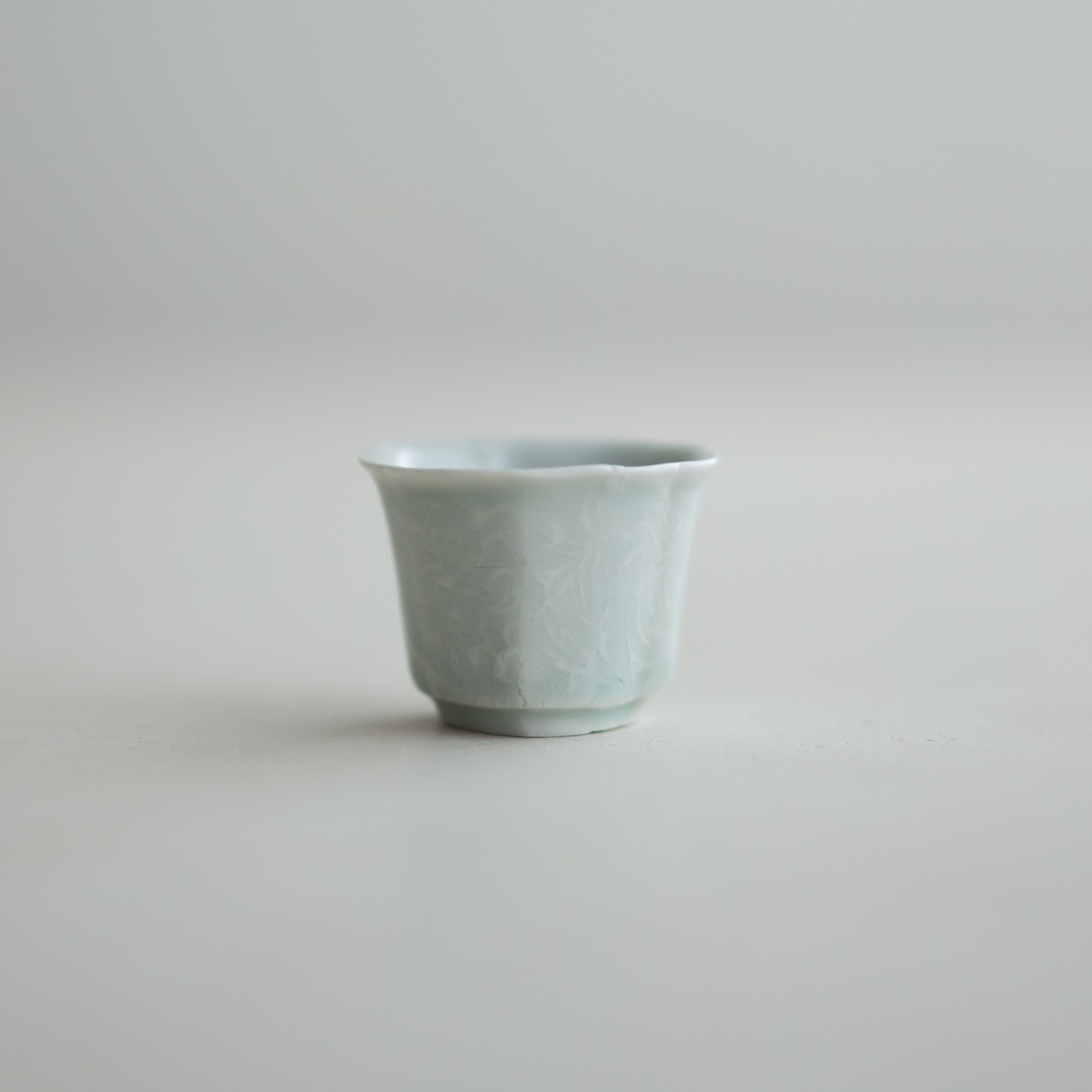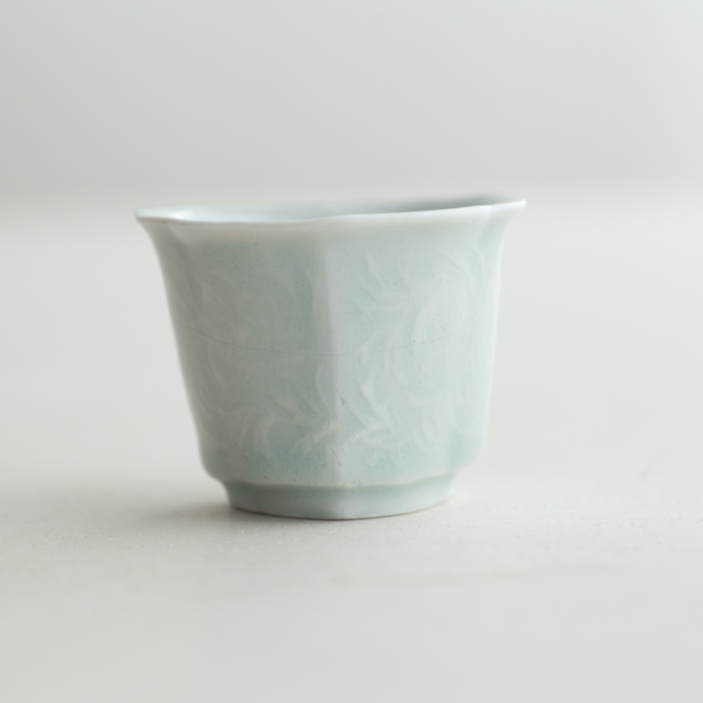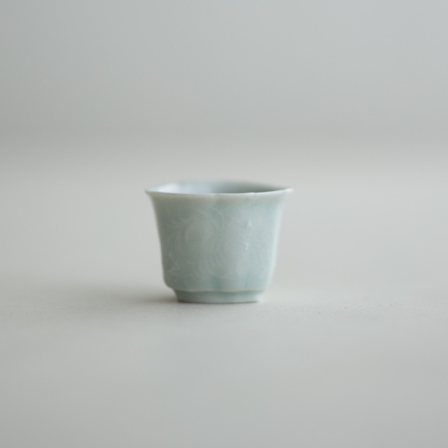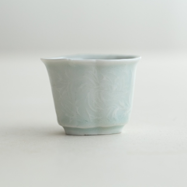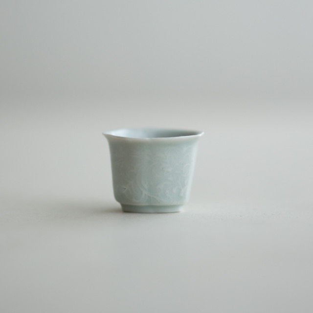 押型成形による陽刻で、よく見ると唐草紋が浮き上がります。口縁も露草形になっていて、凝ったつくりの猪口です。