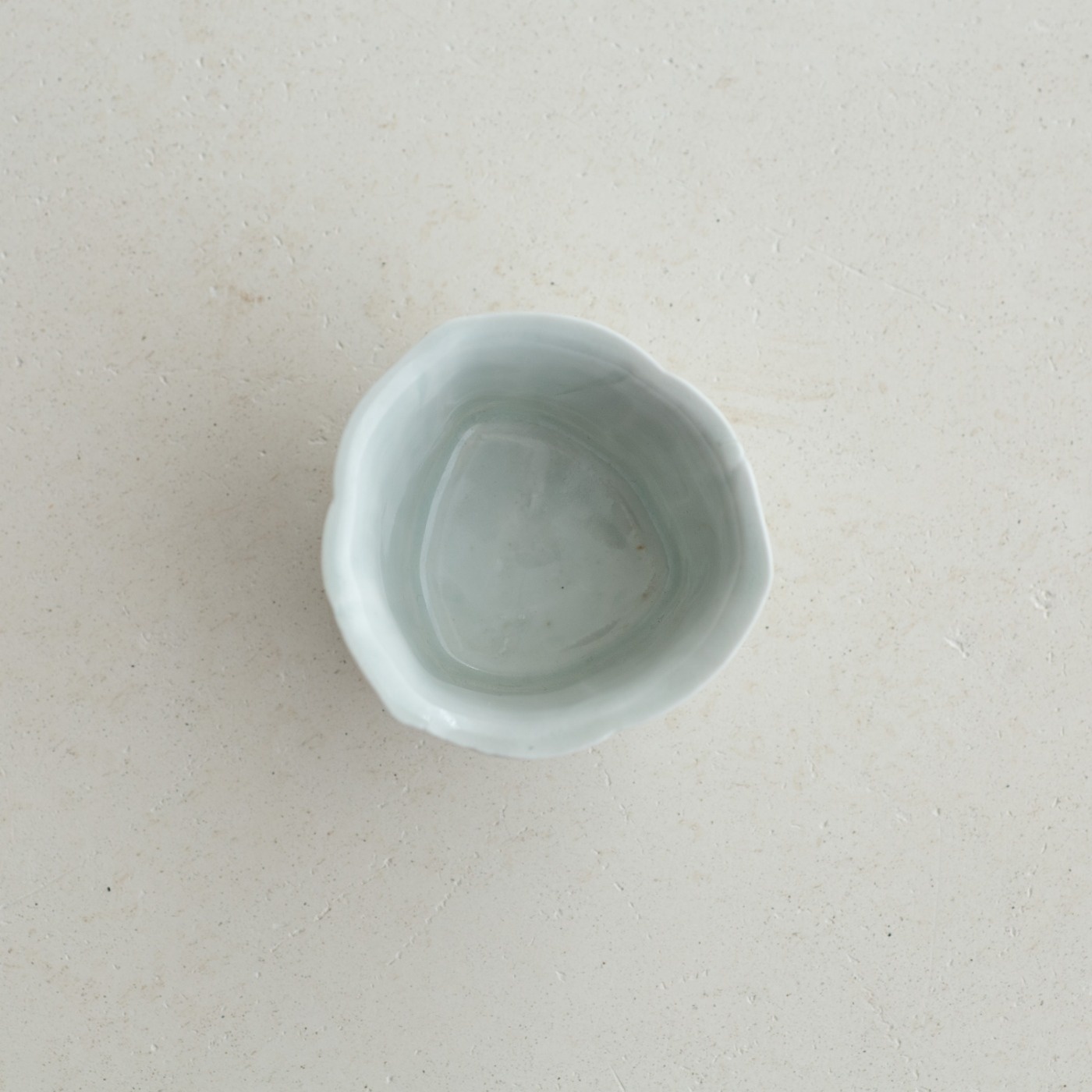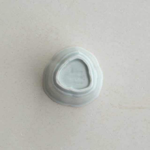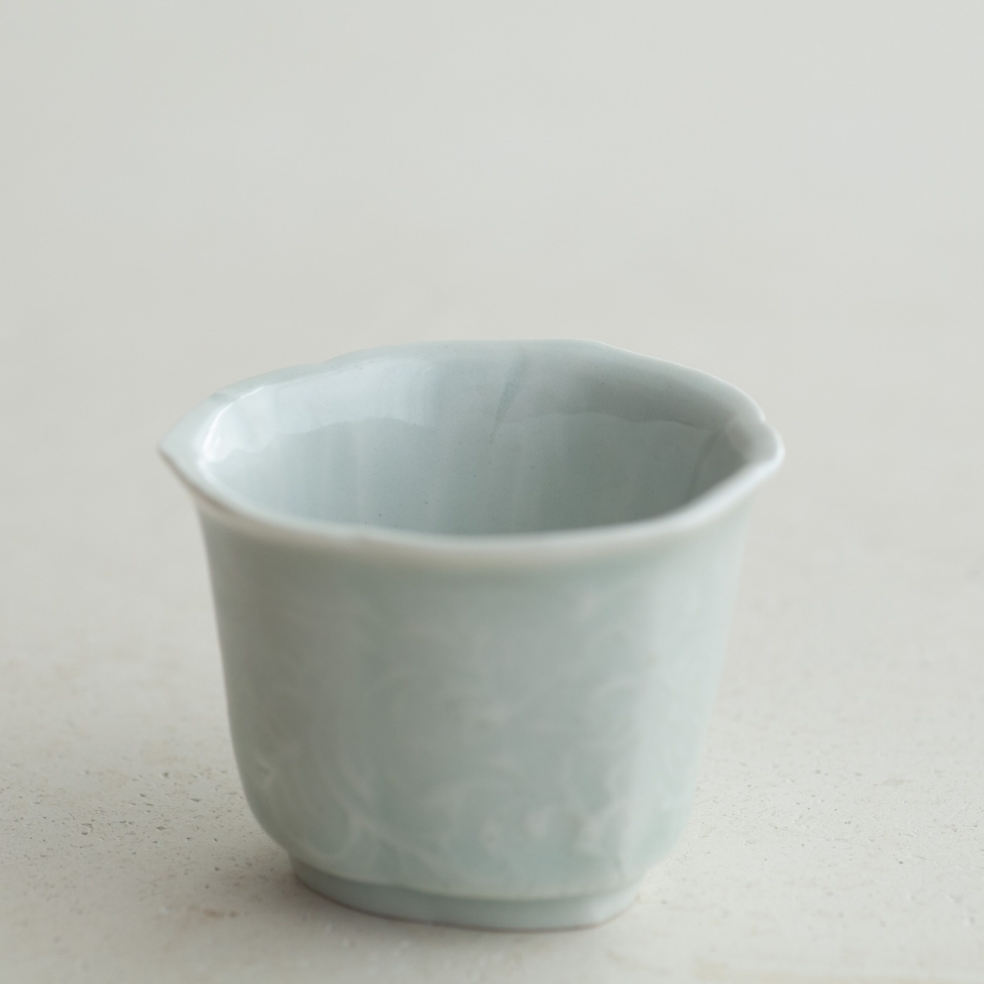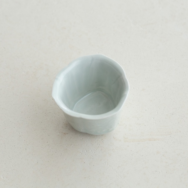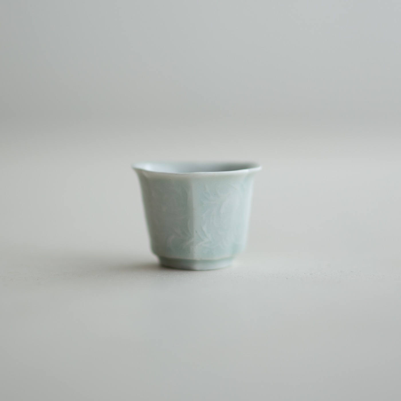 押型成形による陽刻で、よく見ると唐草紋が浮き上がります。口縁も露草形になっていて、凝ったつくりの猪口です。