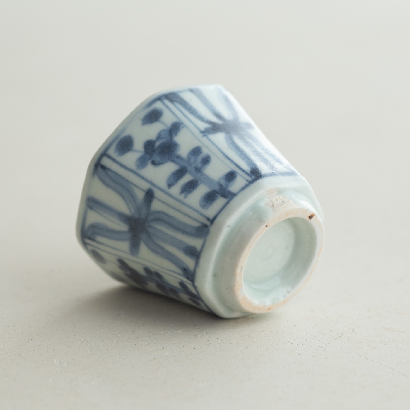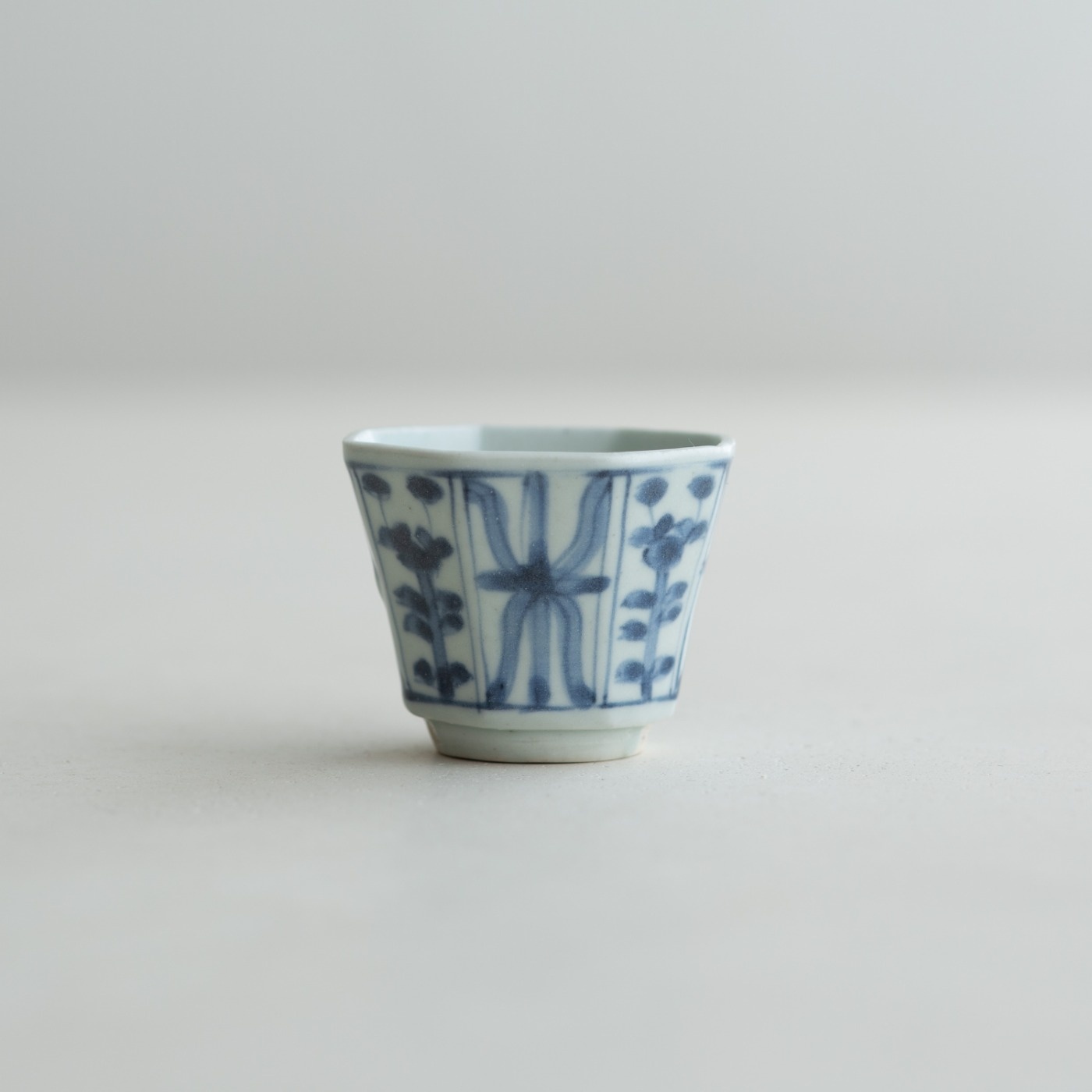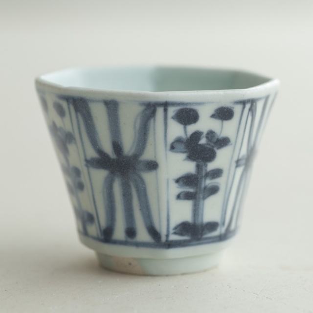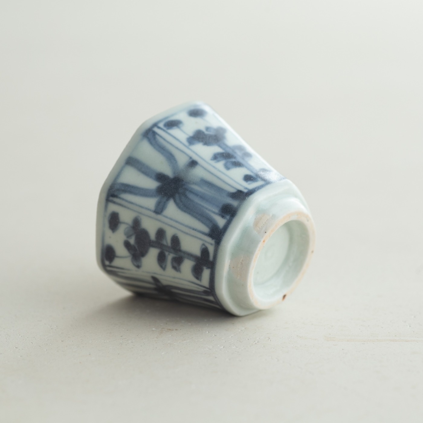 初期伊万里の盃を手本にしたもの。型打成形で八角形にしてから、染付しています。
