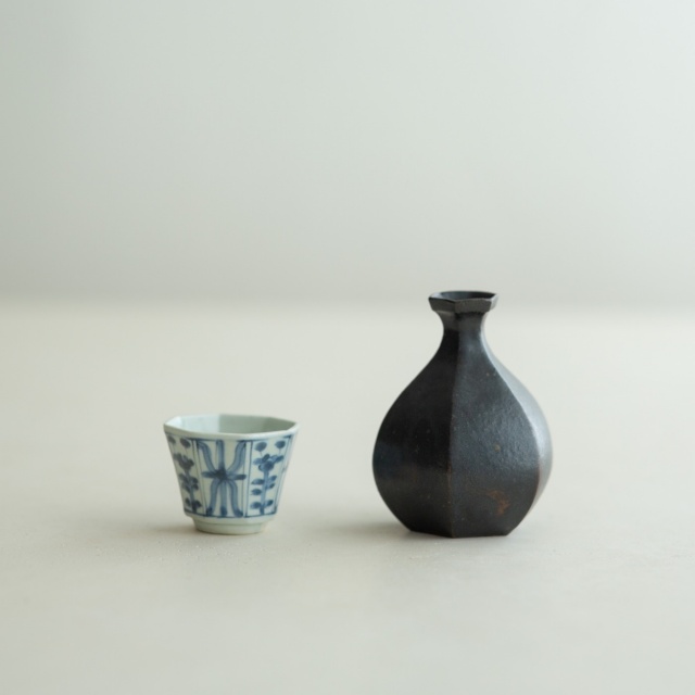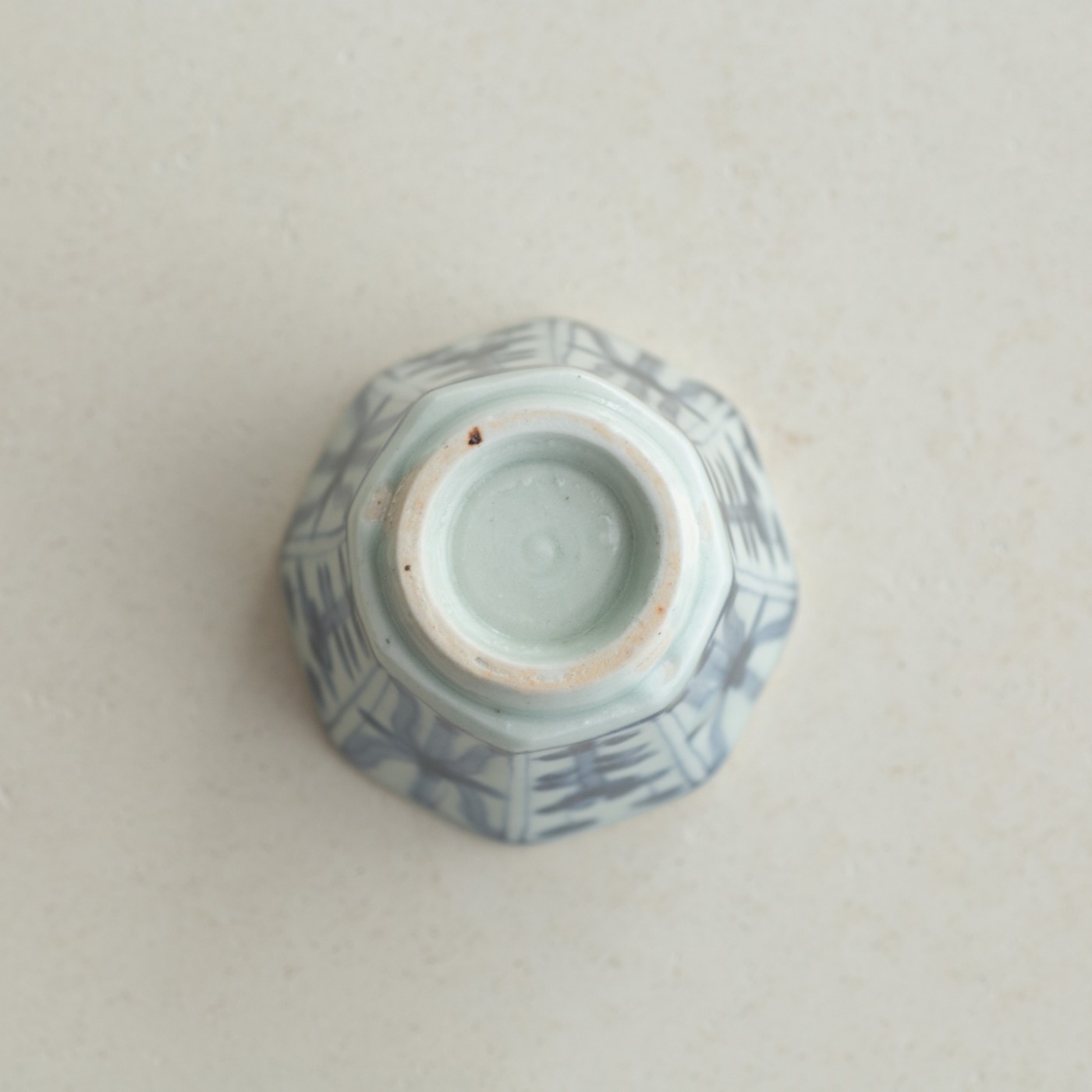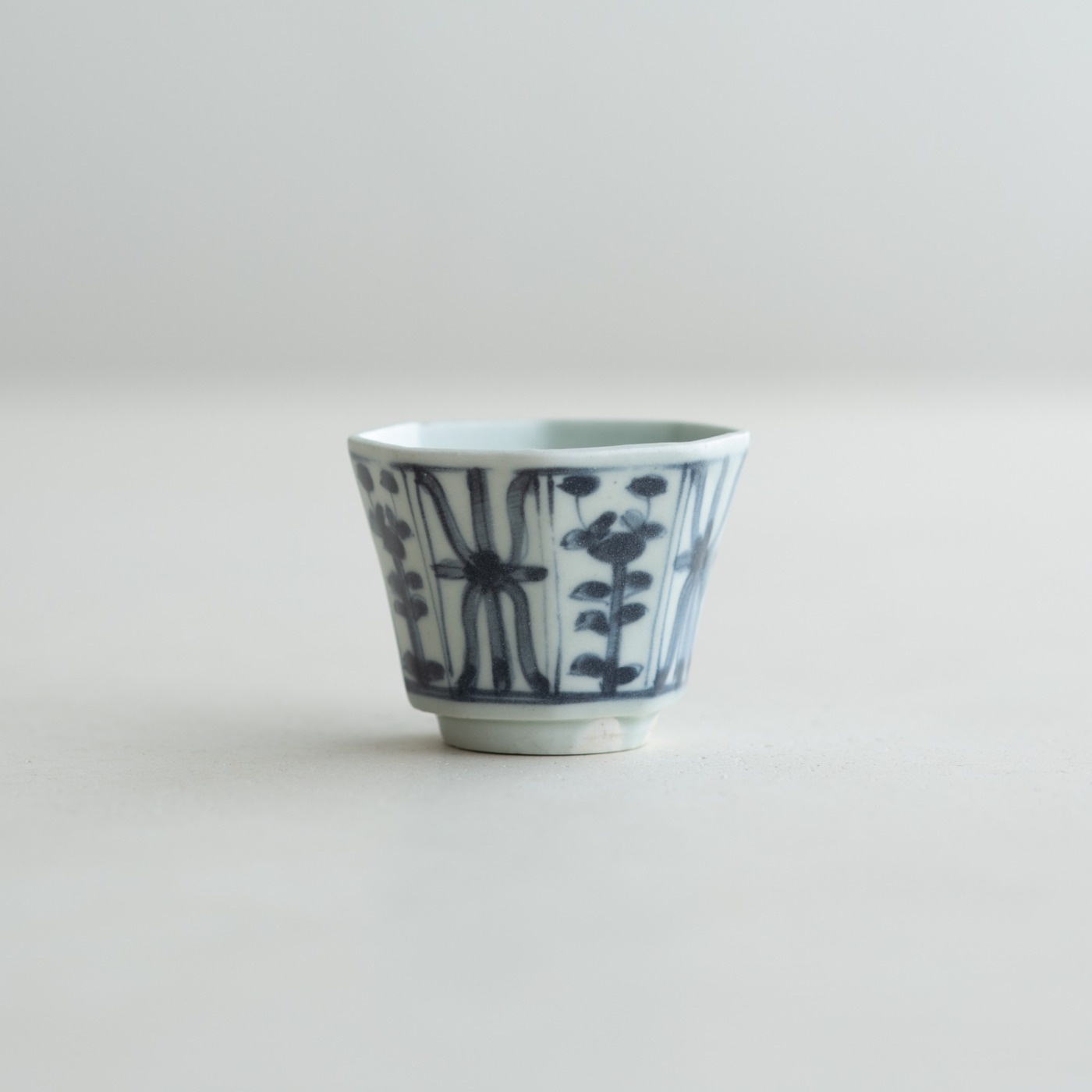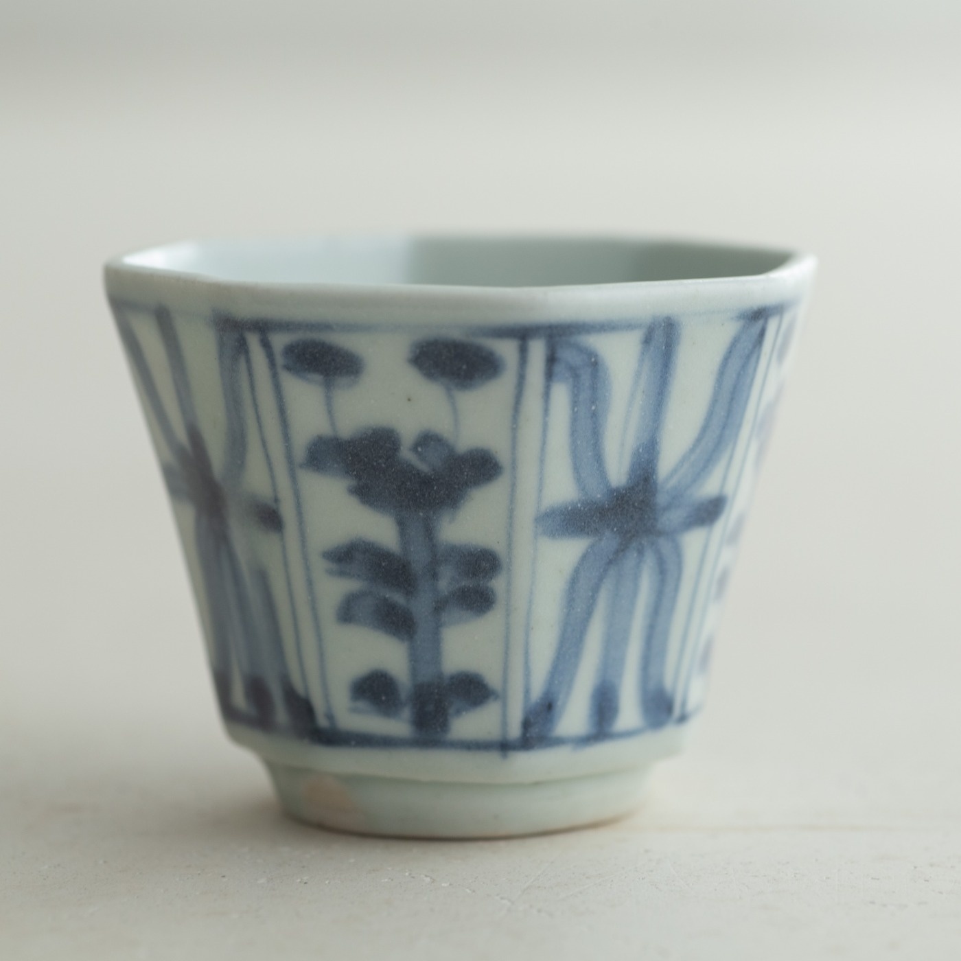 初期伊万里の盃を手本にしたもの。型打成形で八角形にしてから、染付しています。