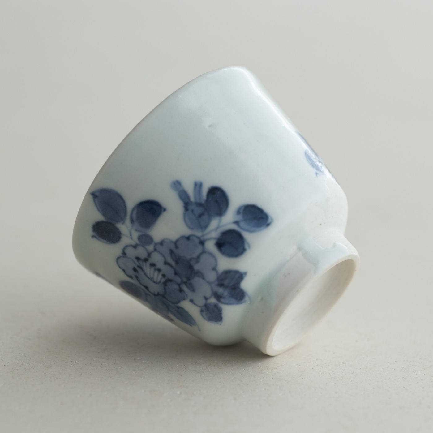 枝葉の先に、大ぶりの華やかな椿の花を描いたもの。高台もやや高めで、すっきりとした形です。ろくろ成形。
