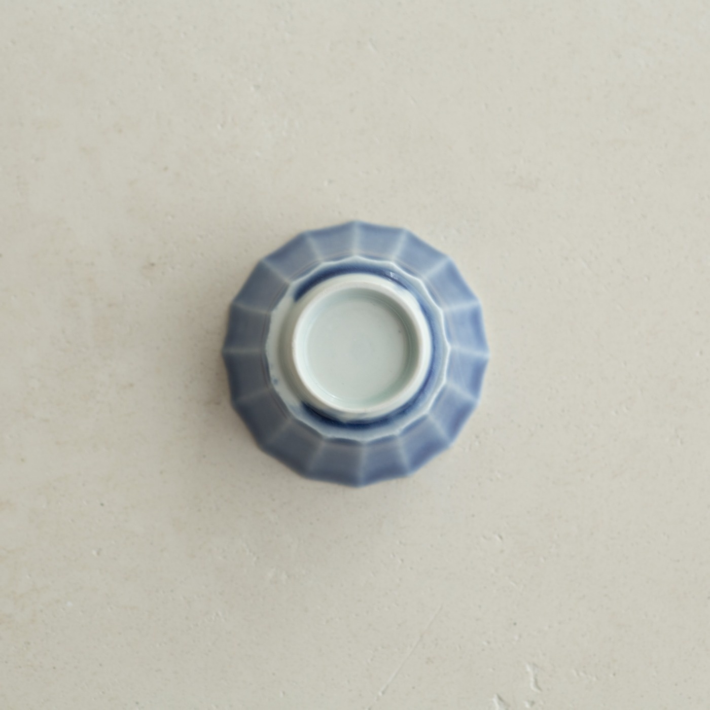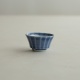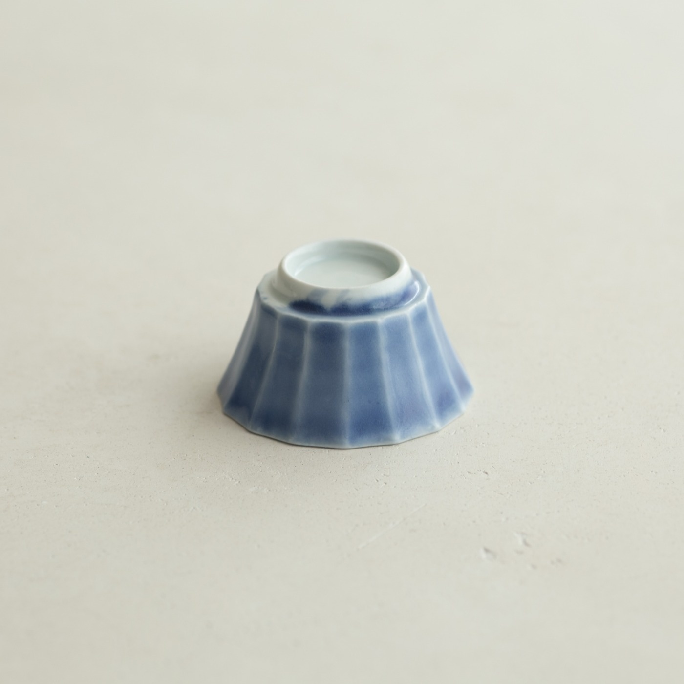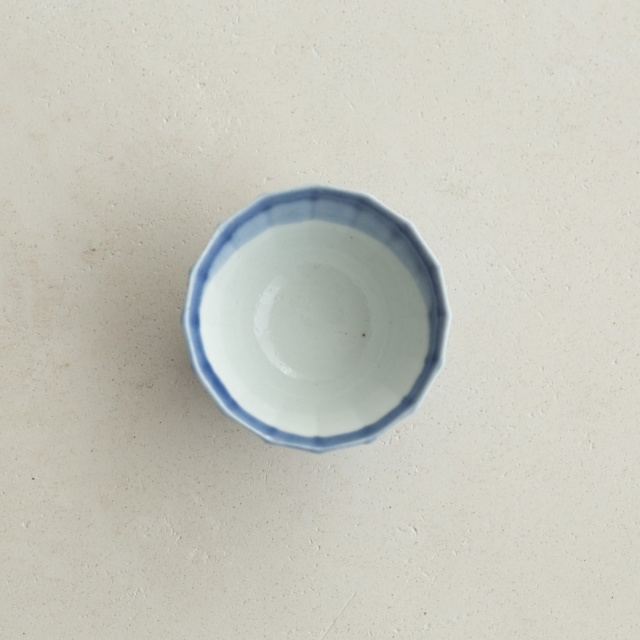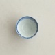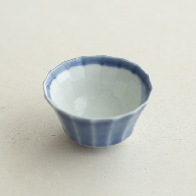 型打成形の後、面を削り出しています。古九谷の時代のつくり方を参考にしたそうです。内側を白色に、外側を瑠璃色で掛け分けていて、口縁の内側に重なりの景色があります。