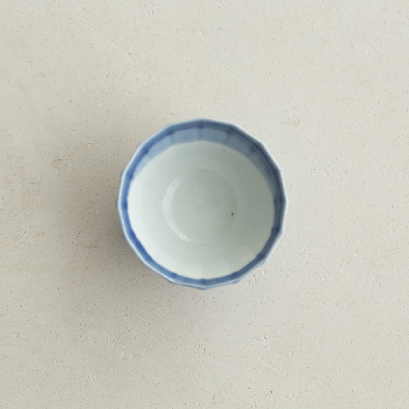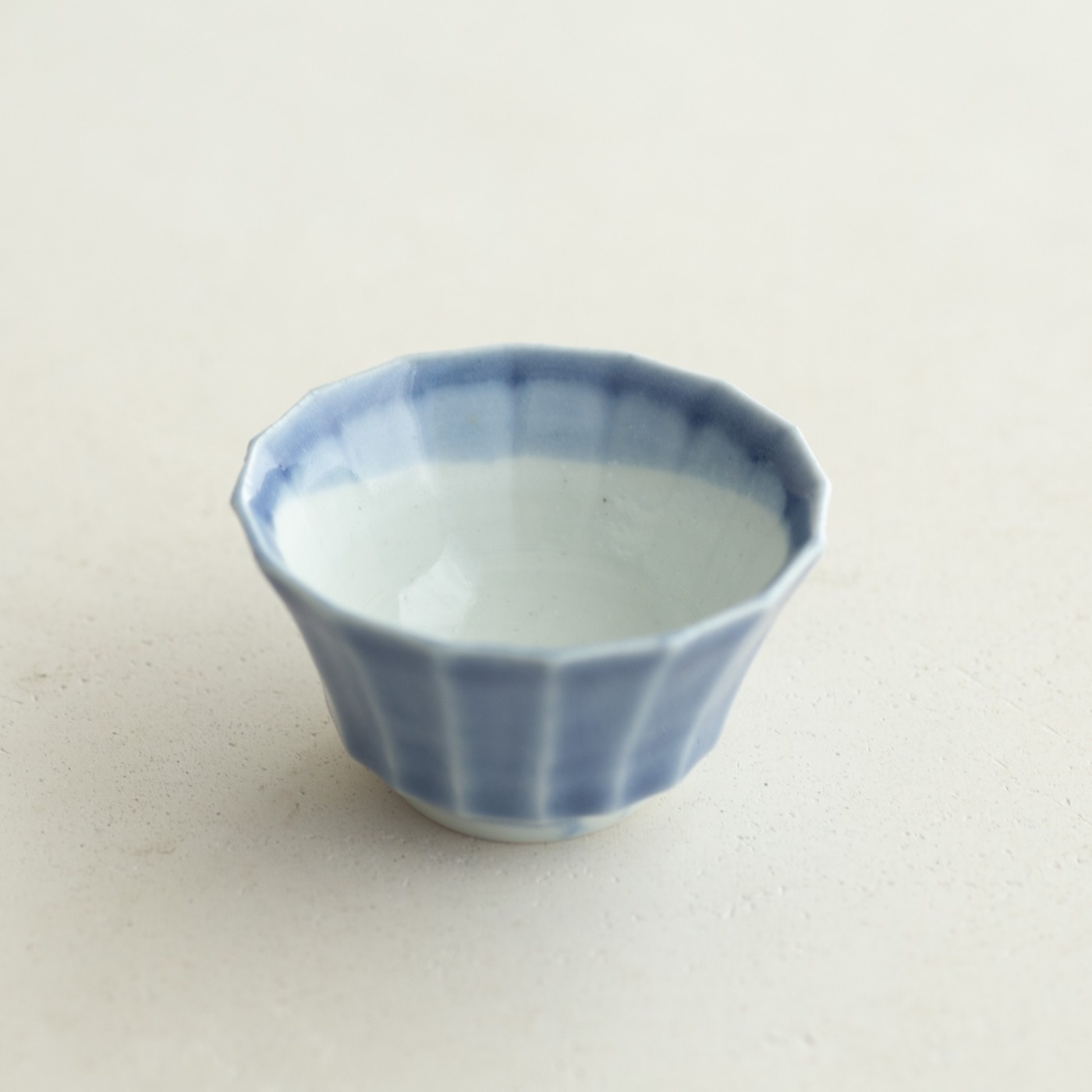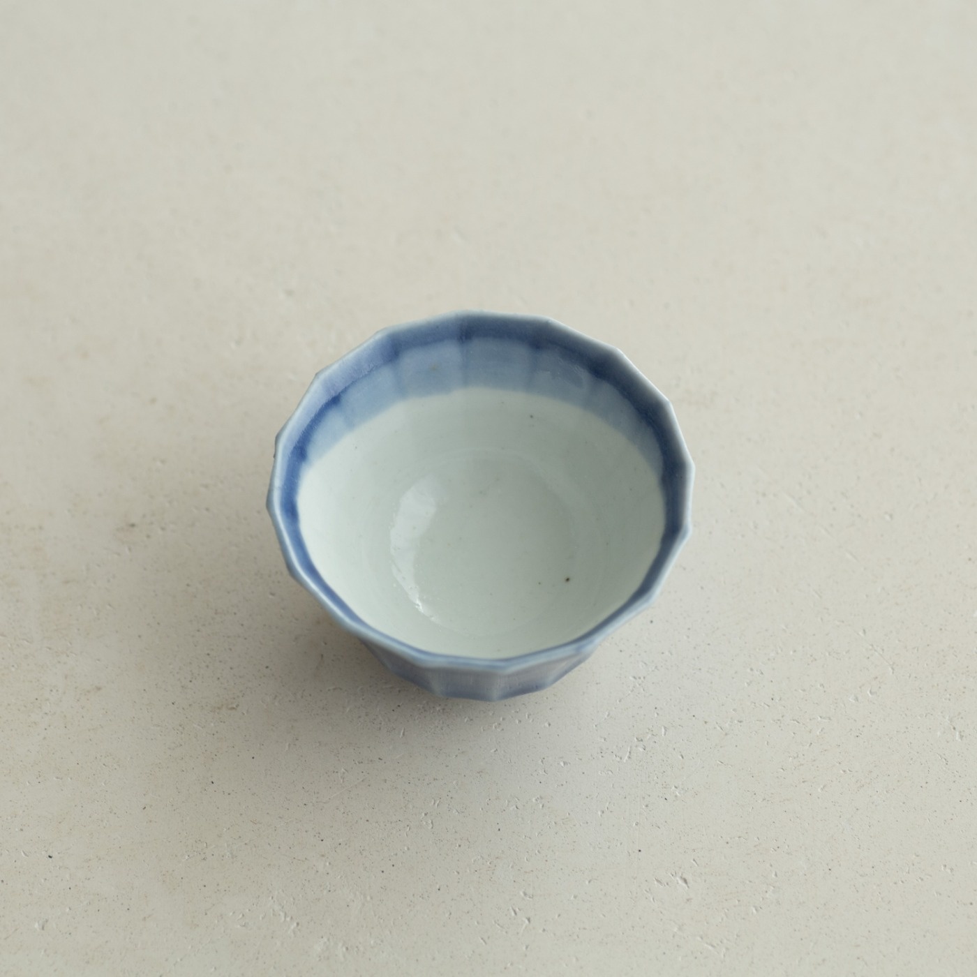 型打成形の後、面を削り出しています。古九谷の時代のつくり方を参考にしたそうです。内側を白色に、外側を瑠璃色で掛け分けていて、口縁の内側に重なりの景色があります。