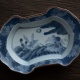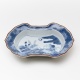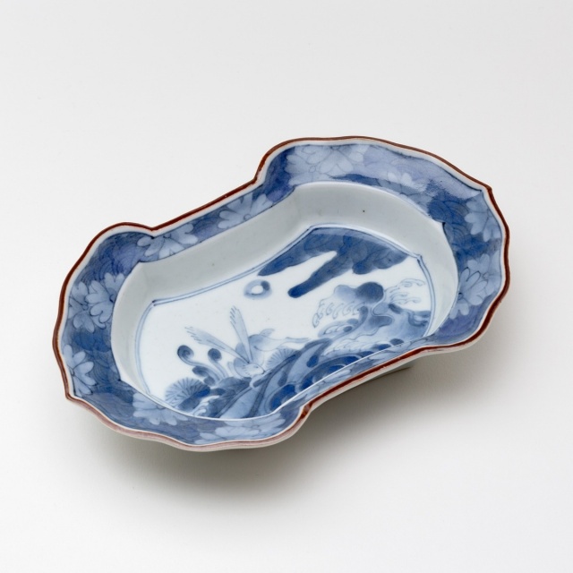 縁起の良い分銅形、手の込んだ糸切成形の皿。見込みに波兎、縁に桜と青海波、外側に梅紋様を描いていて、季節の異なる絵柄の組み合わせは、四季を通して使えそうです。