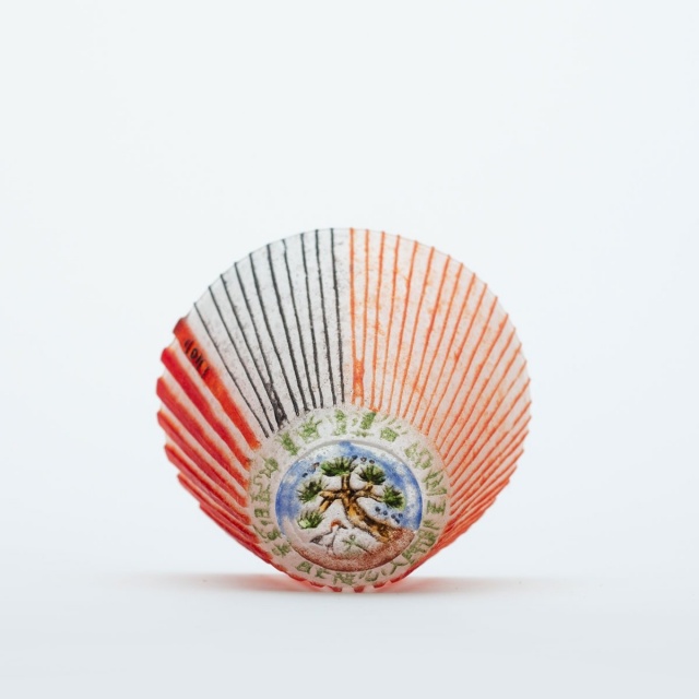 パート・ド・ヴェールという古代に生まれたガラス技法で制作。ガラスの粉末を型に敷き詰めて溶解し成形する技法で、外側は型に刻んだ図案の凹凸が大胆かつ細やかで、半透明のマットな手触り。杯の内側はツルッとしています。