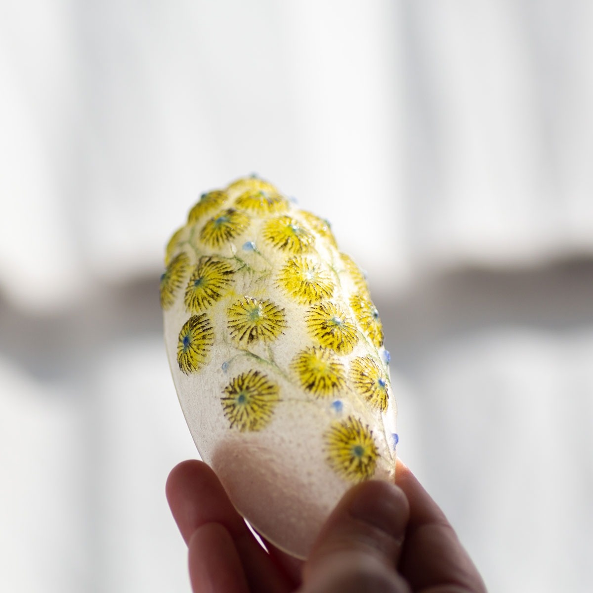 パート・ド・ヴェールという古代に生まれたガラス技法で作られています。ガラスの粉末を型に敷き詰めて溶解し成形する技法です。小皿の内側はツルッとしていて、外側は半透明のマットな手触り。大室さんが好きだという黄色が印象的です。