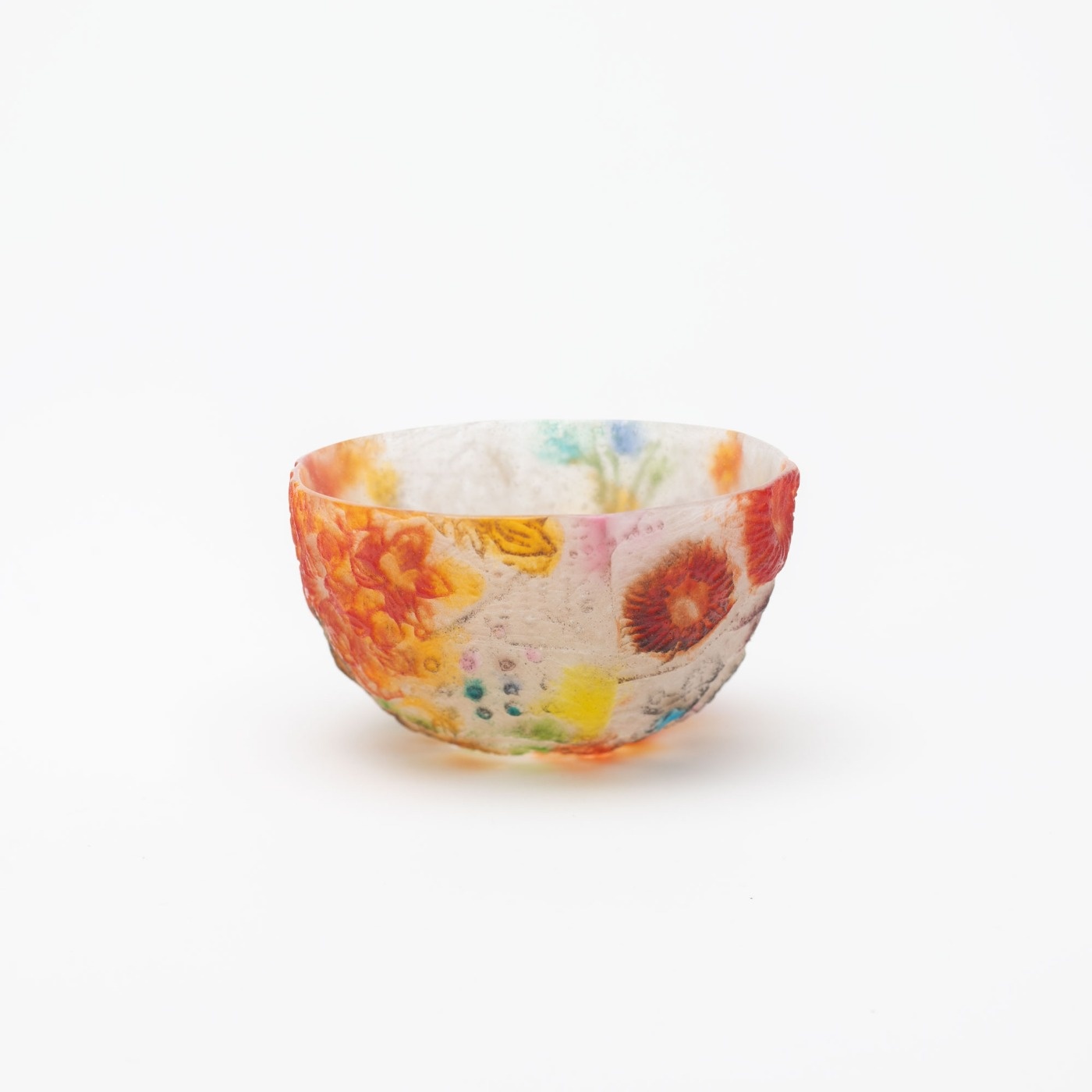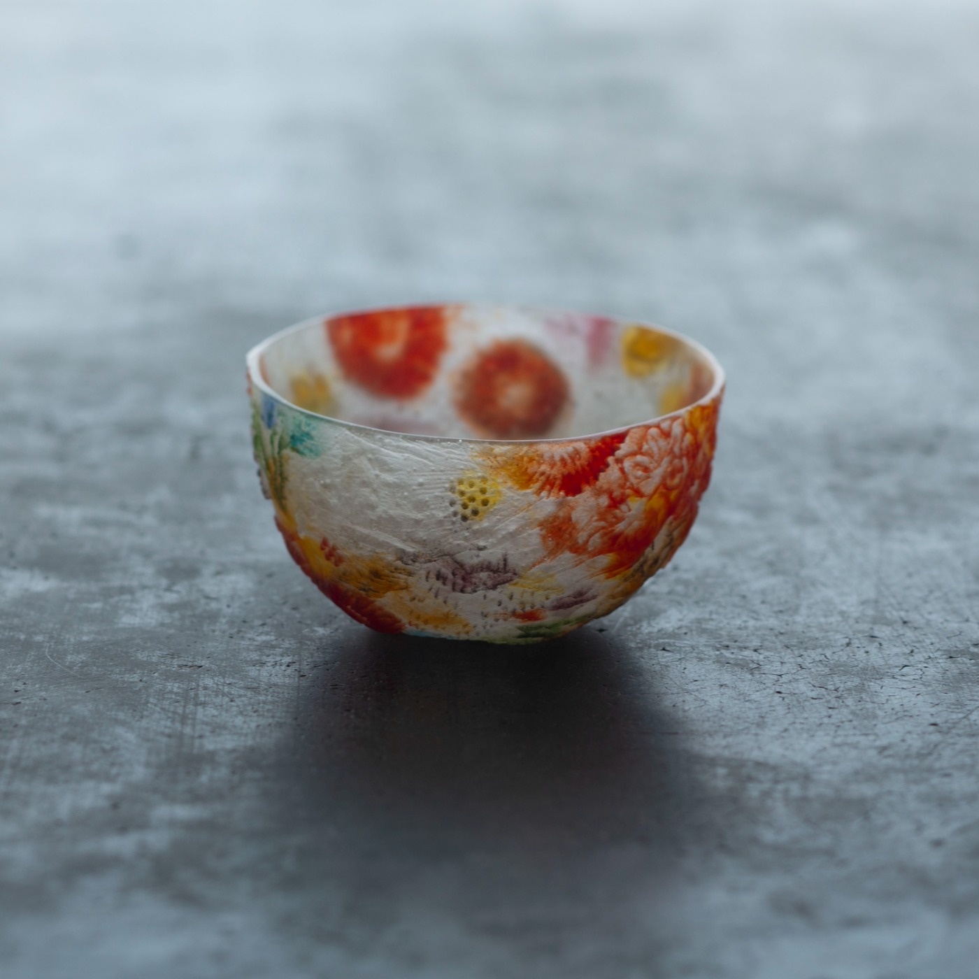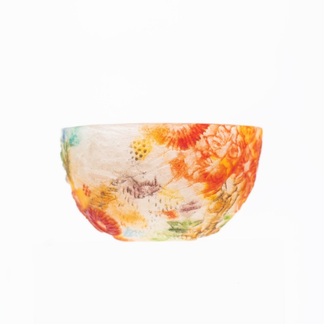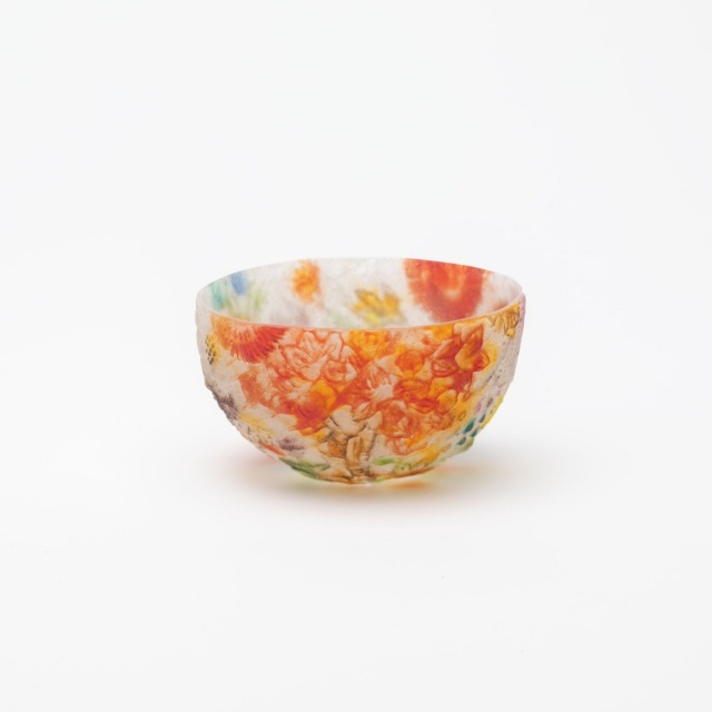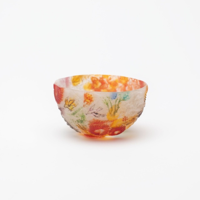 *作品はパート・ド・ヴェールという古代に生まれたガラス技法で作られています。ガラスの粉末を型に敷き詰めて溶解し成形する技法です。内側、外側それぞれ半透明でマットな手触りです。