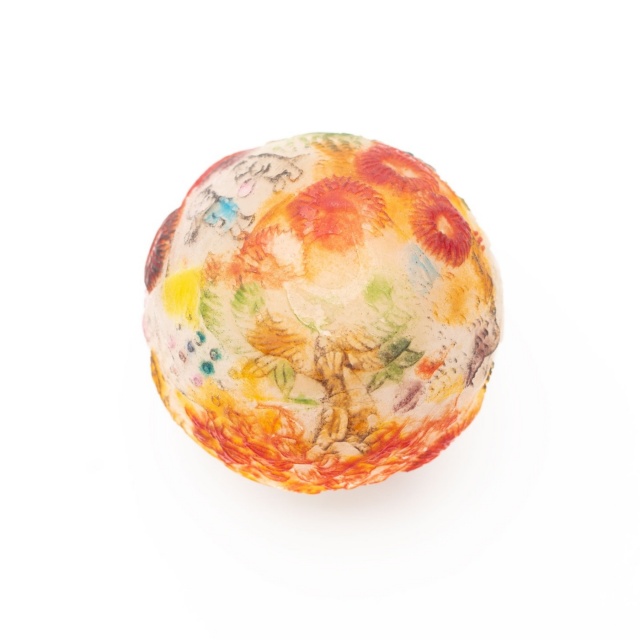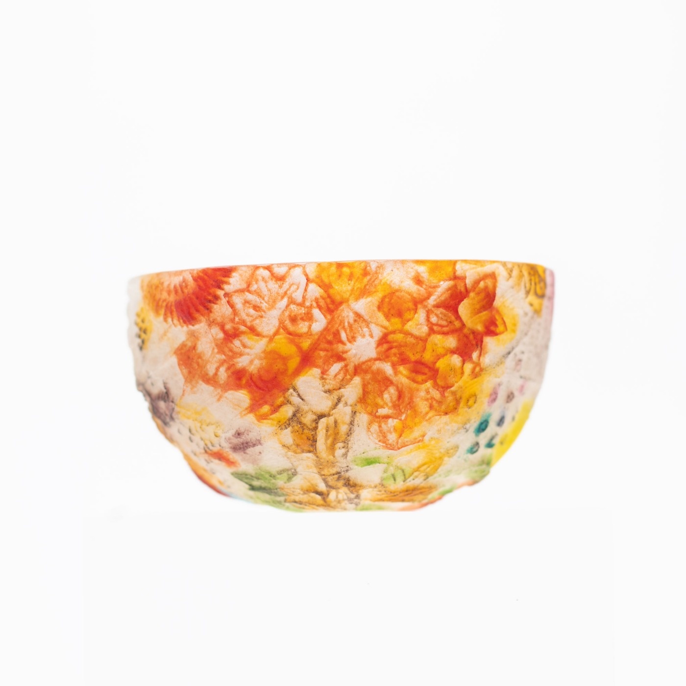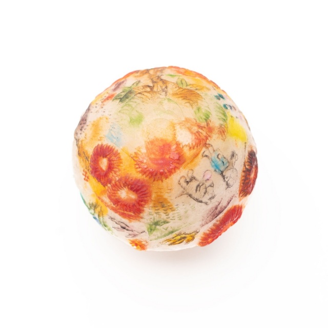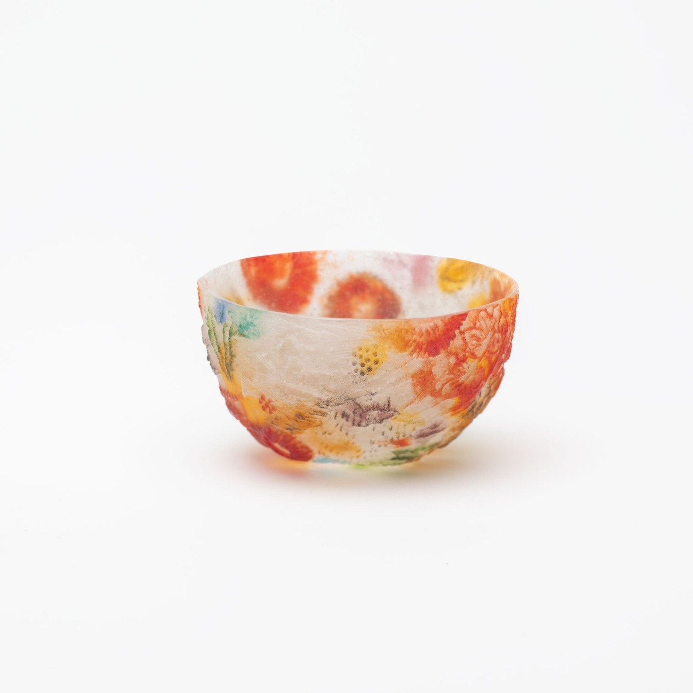 *作品はパート・ド・ヴェールという古代に生まれたガラス技法で作られています。ガラスの粉末を型に敷き詰めて溶解し成形する技法です。内側、外側それぞれ半透明でマットな手触りです。