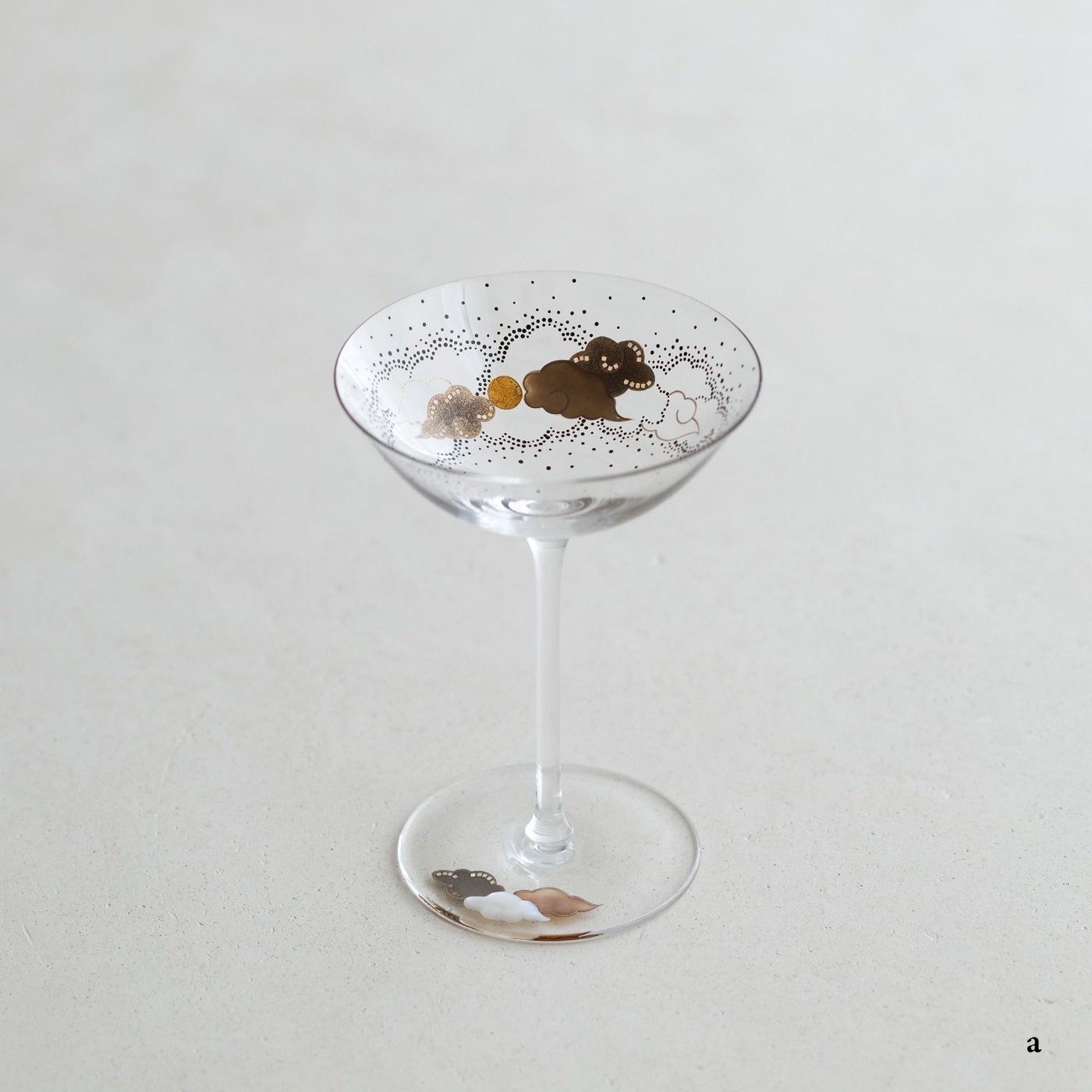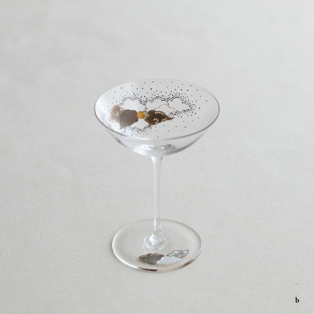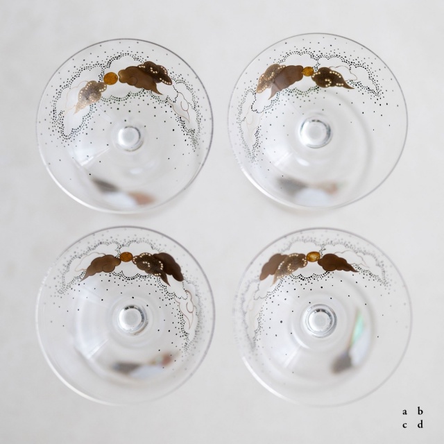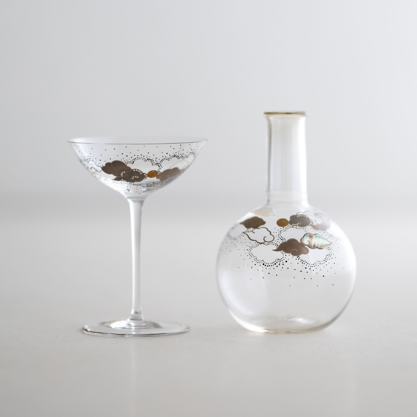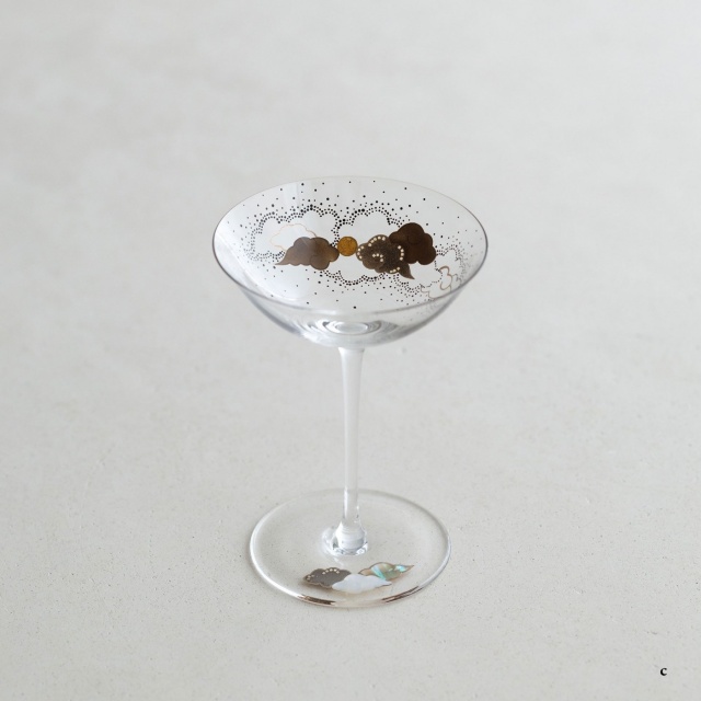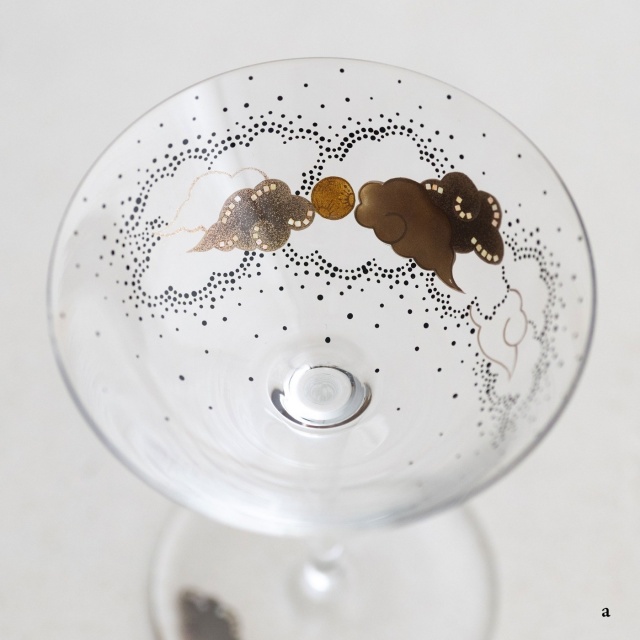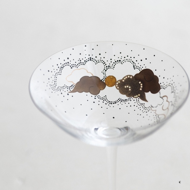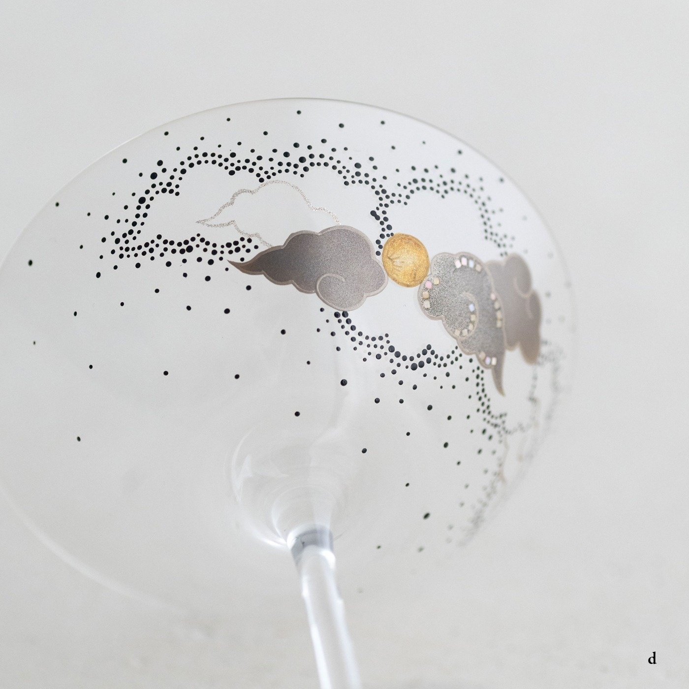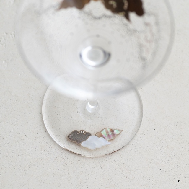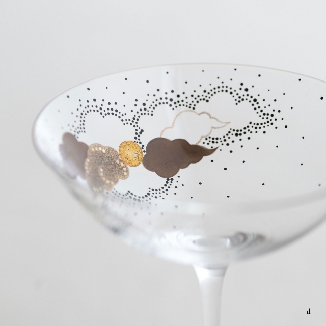 透明なお酒だけでなく、かすみ酒やハチミツのお酒ミードなどを注いでも、金色のお月さまや雲がぼんやりと霞んで朧月夜の景色に。
