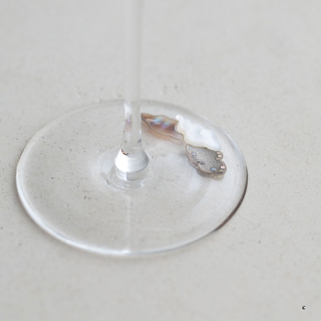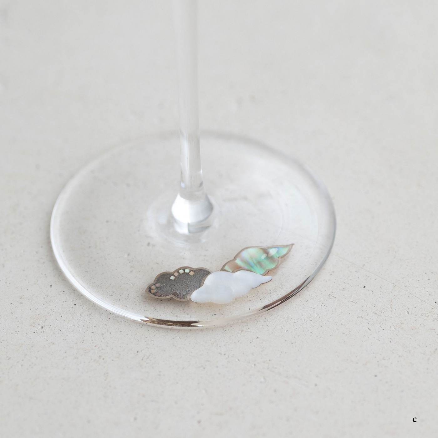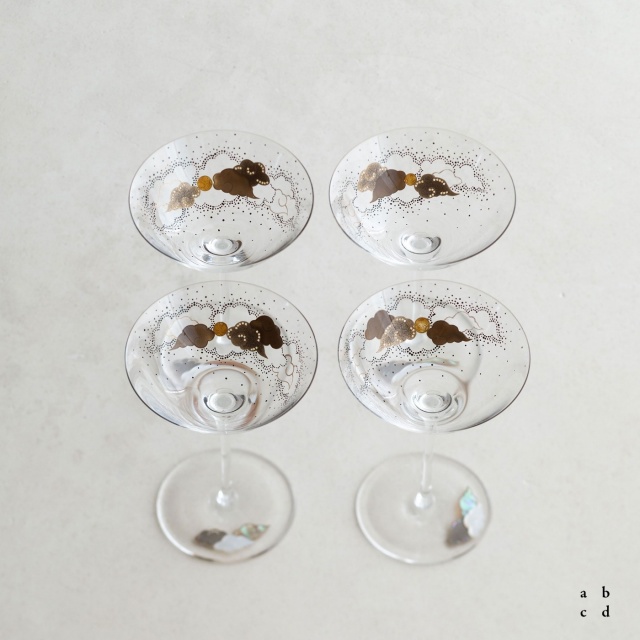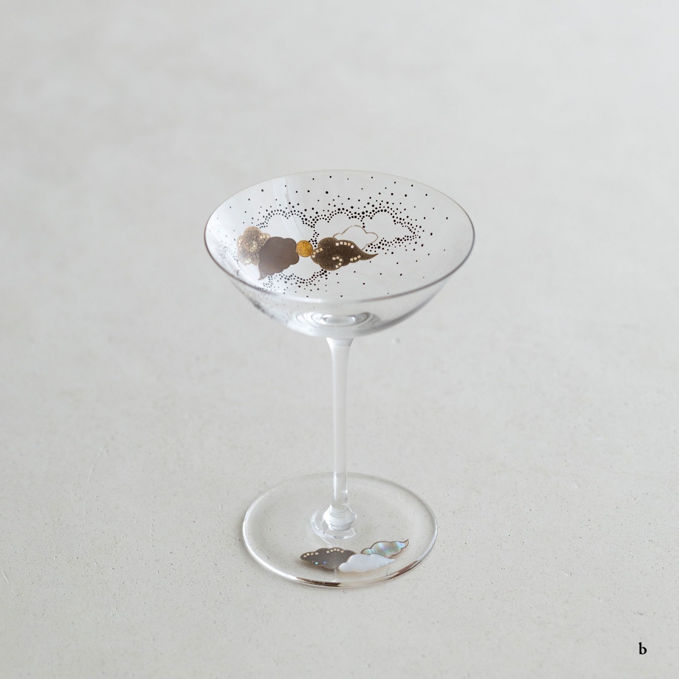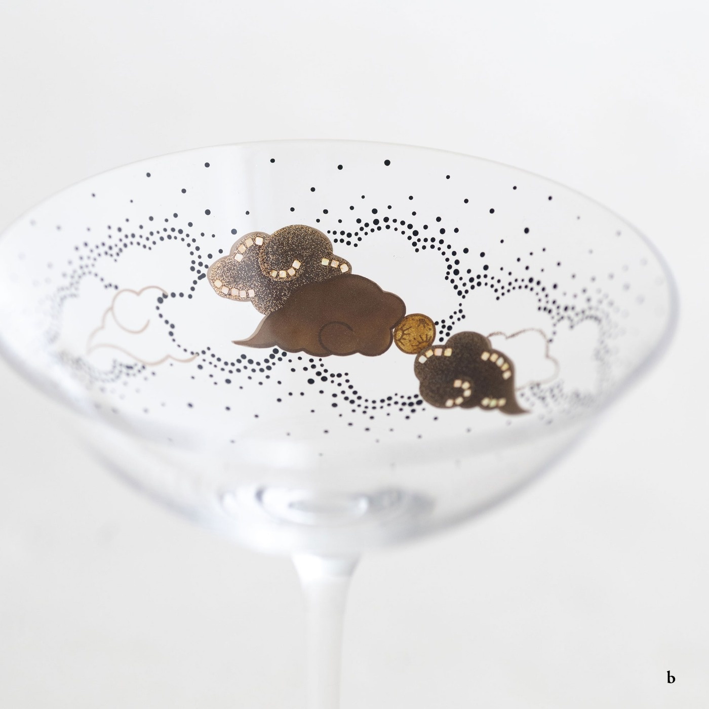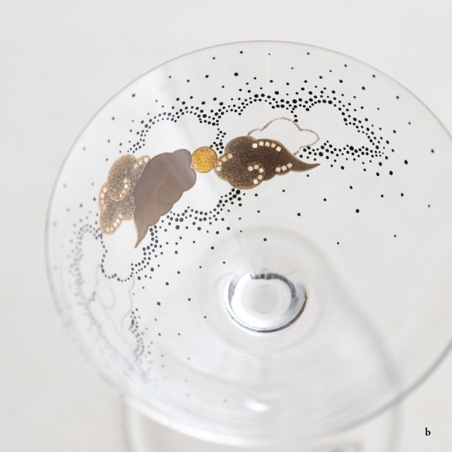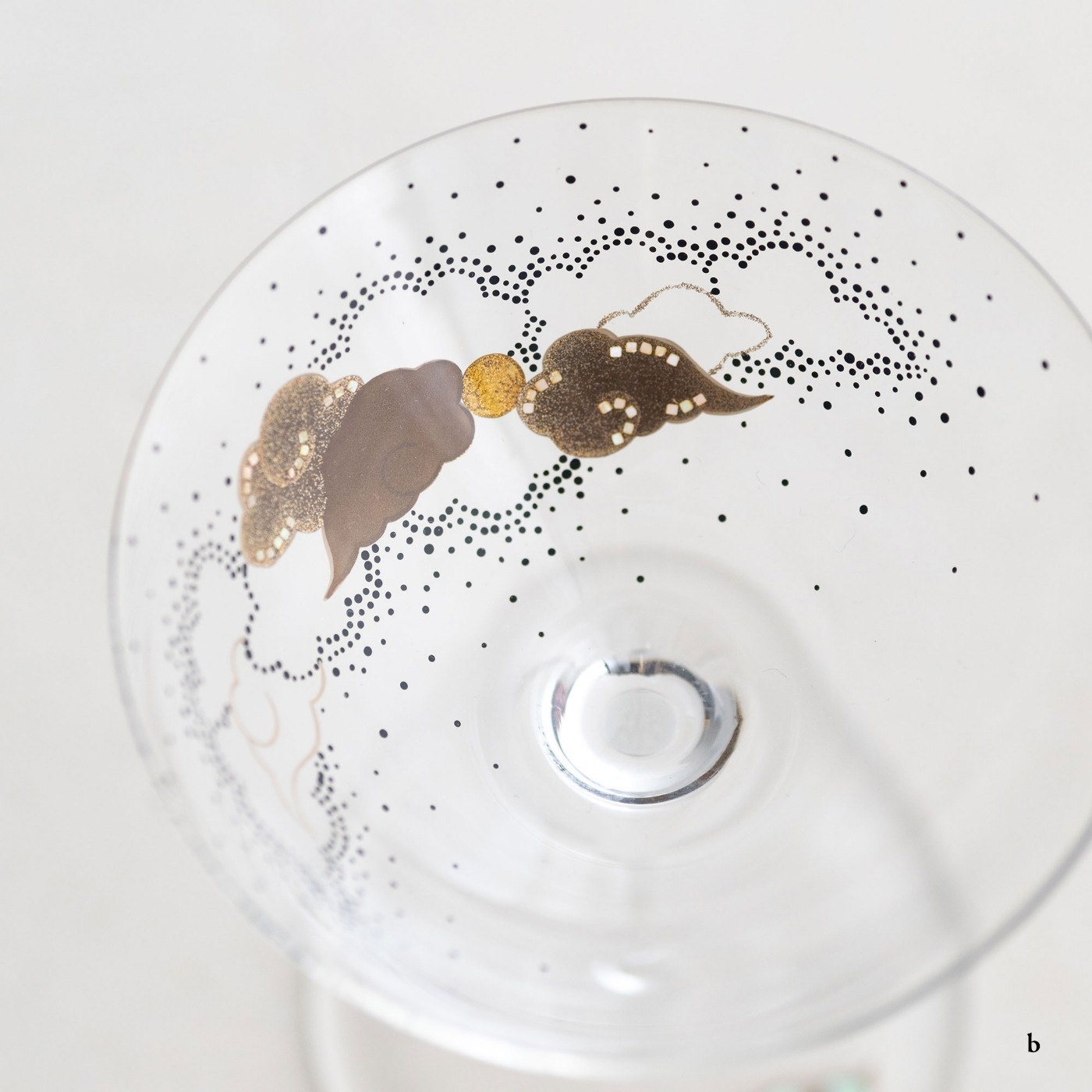 透明なお酒だけでなく、かすみ酒やハチミツのお酒ミードなどを注いでも、金色のお月さまや雲がぼんやりと霞んで朧月夜の景色に。