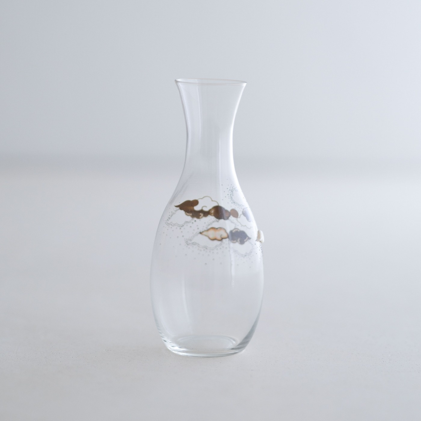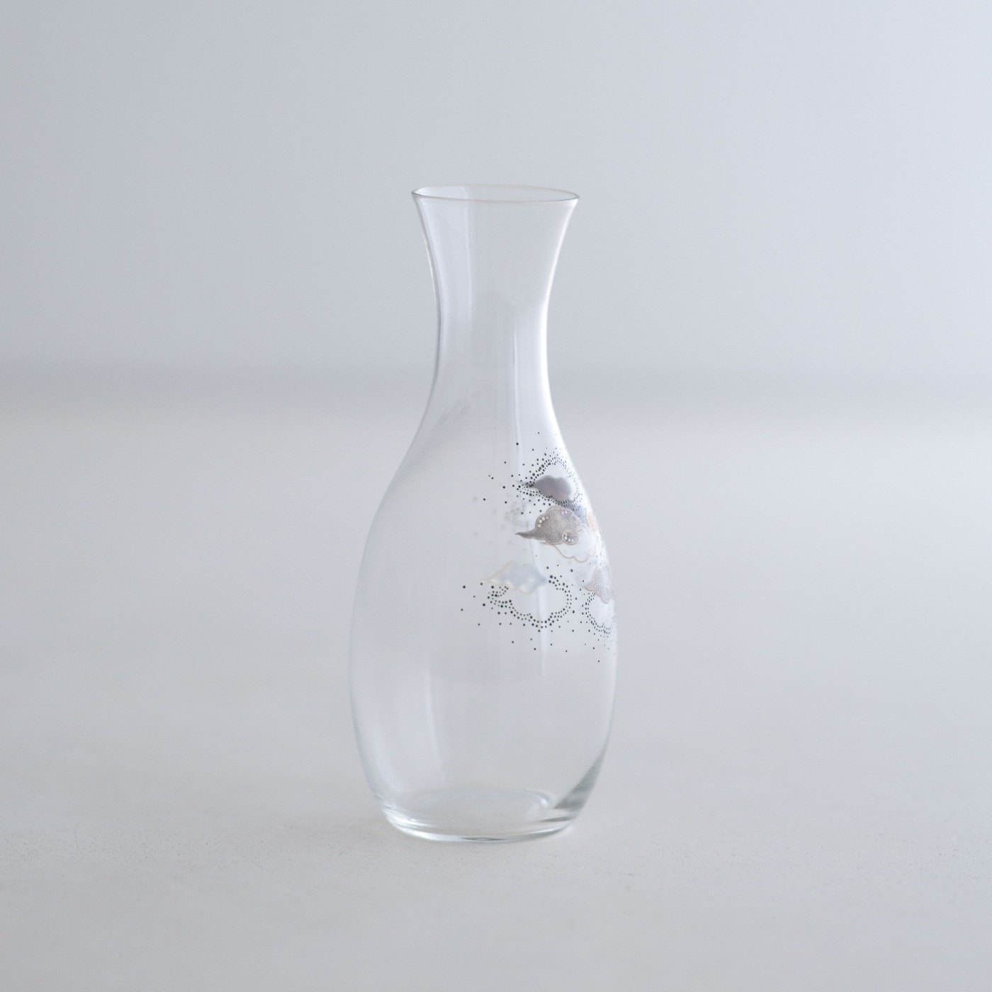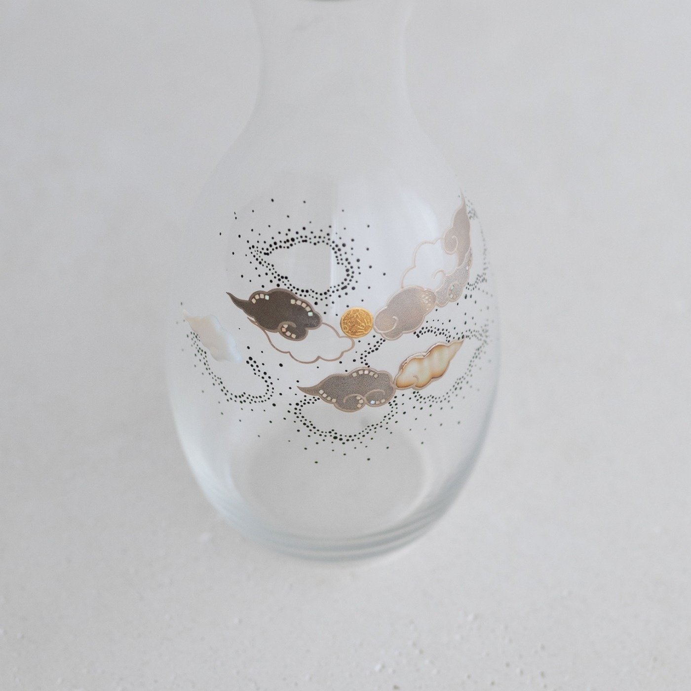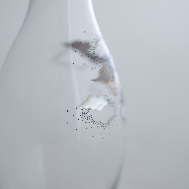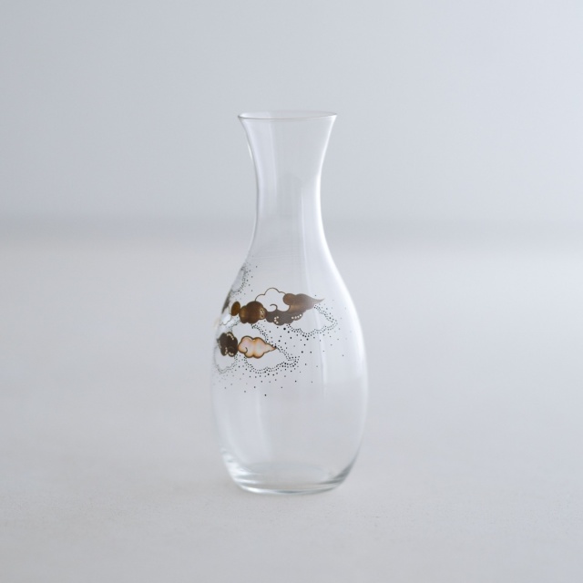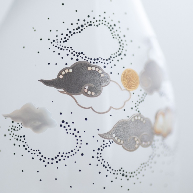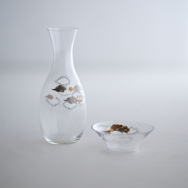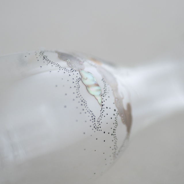 薄手のアンティークガラスの徳利で、その趣きのあるやわらかな曲面に、月夜の景色を漆絵、蒔絵、螺鈿で描いています。