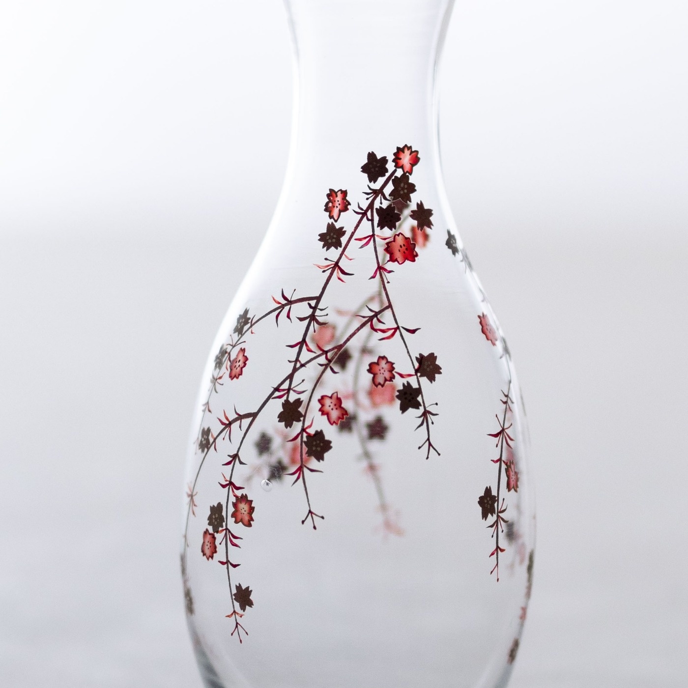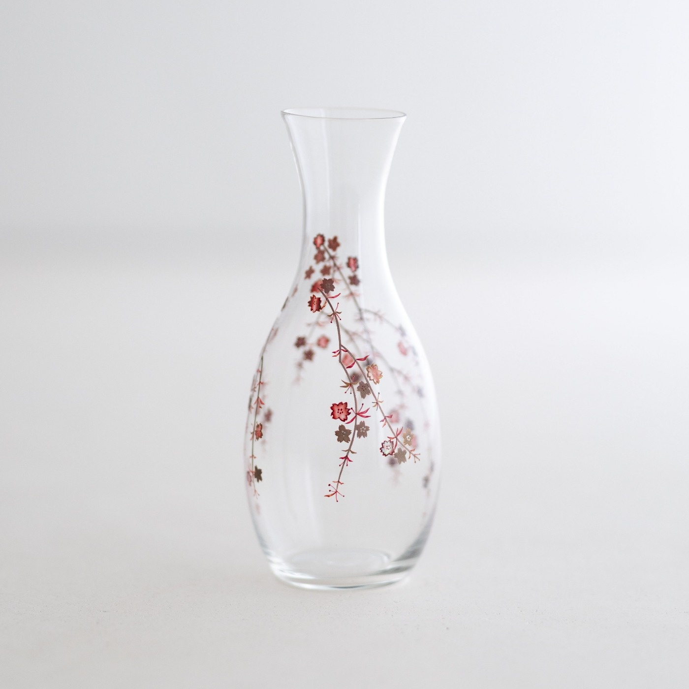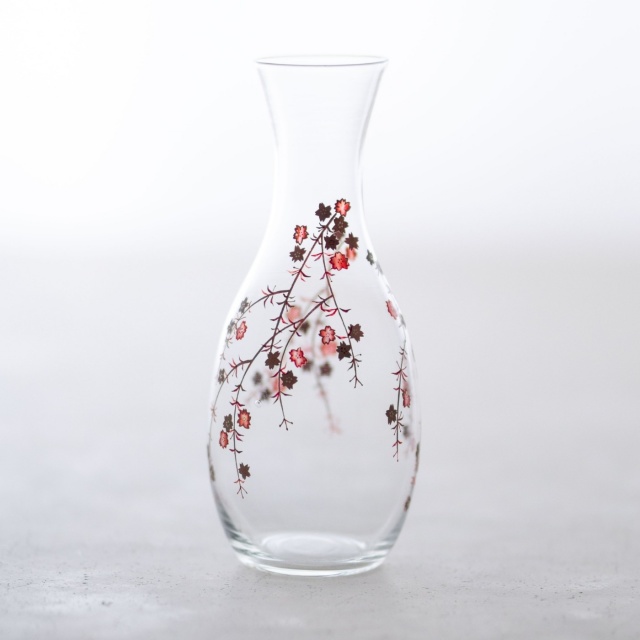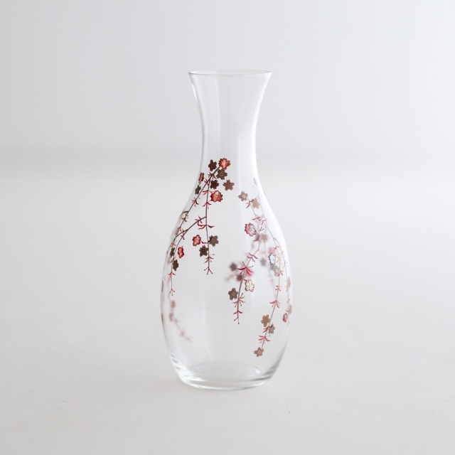 薄手のアンティークガラスの徳利で、そのやわらかな曲線に沿って枝垂れ桜が咲いています。