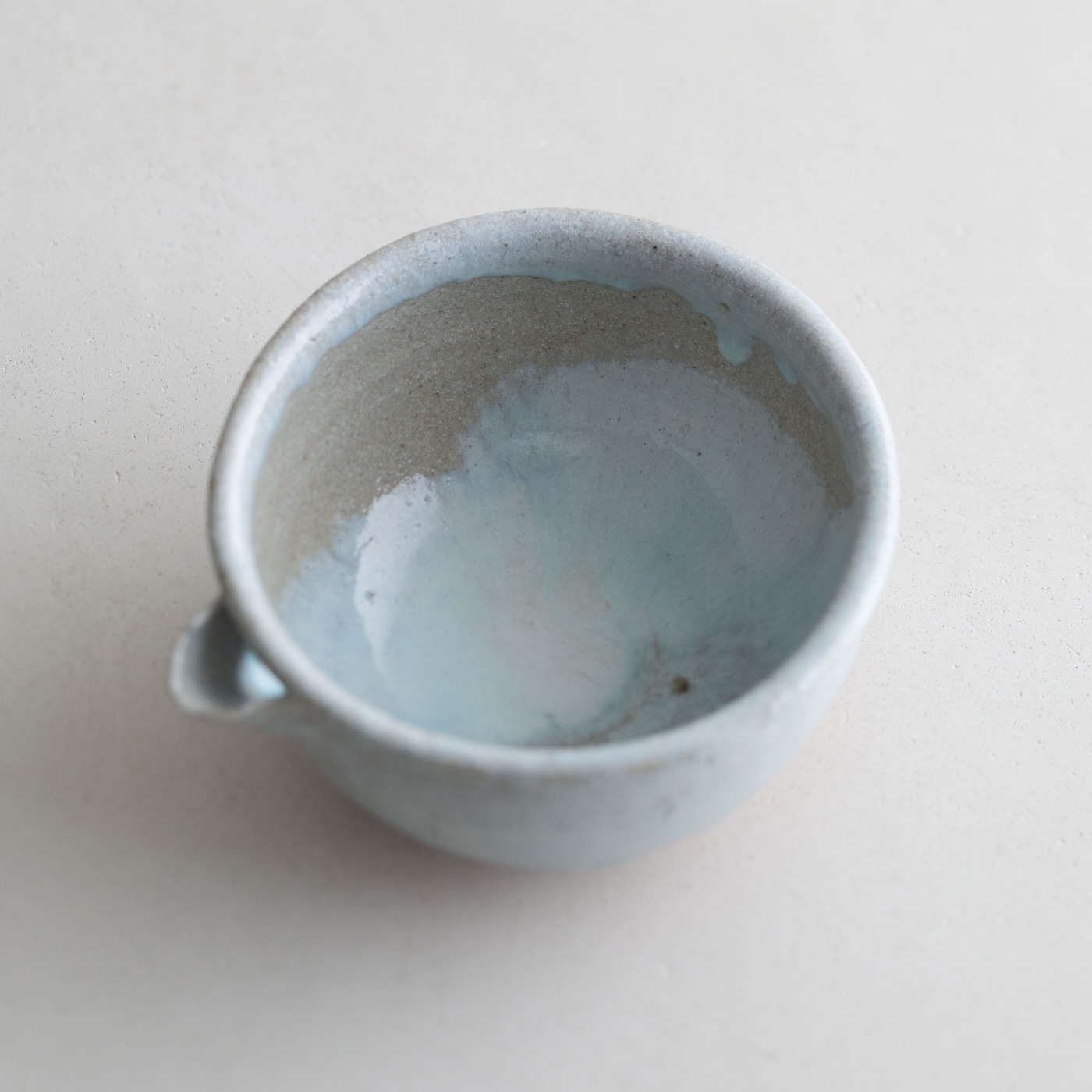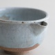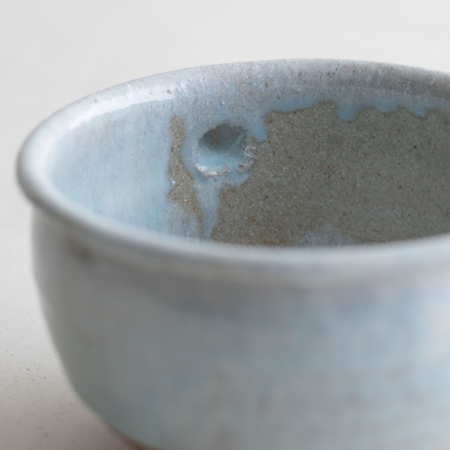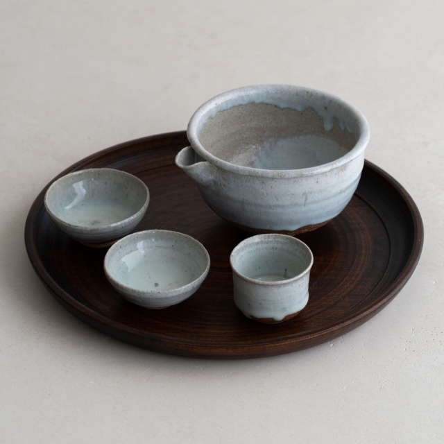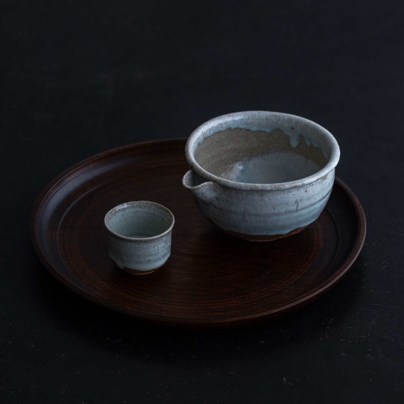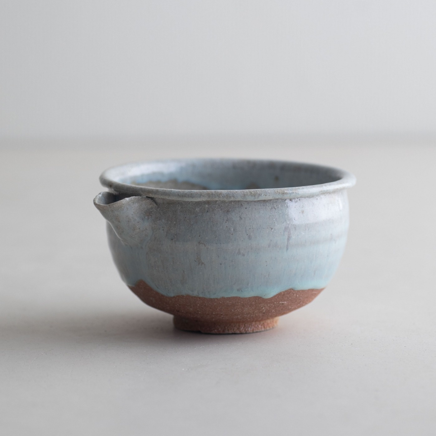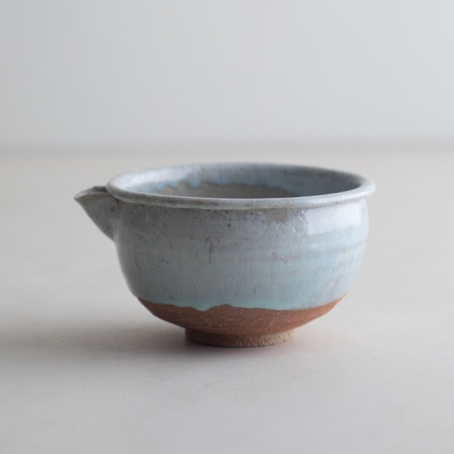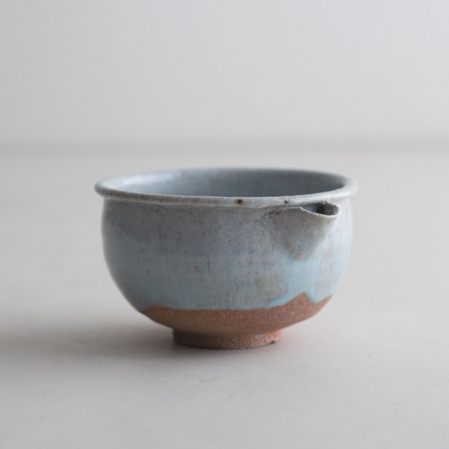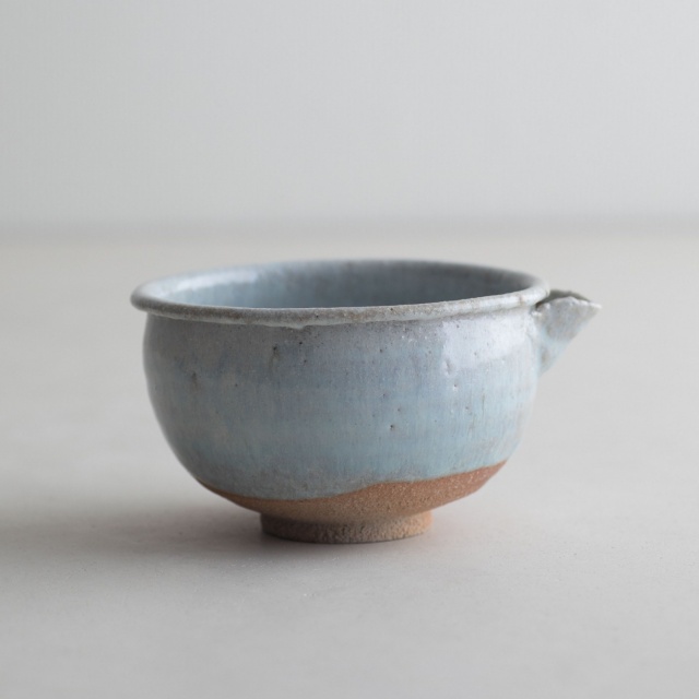 大ぶりの片口で、明るめの青みがかった斑唐津の釉調も大胆な美しい景色です。お酒を注ぐと釉の濃淡の斑が引き立ち、使い続けるとお酒が貫入にも染みて、濃淡が育つそうです。土は北波多地区などで採取した吉野谷砂岩で、粒が大きく、精製するとざっくりとした土になり、高台周りの釉薬の掛からない土見せも目を引きます。矢野さんは憧れの古い物に学びながら、自分で土も釉薬もつくり続けています。「自分は本当に唐津好きになりました。わからないことがたくさんあって、今でも少しずつ調合を変えてみたりしています」。