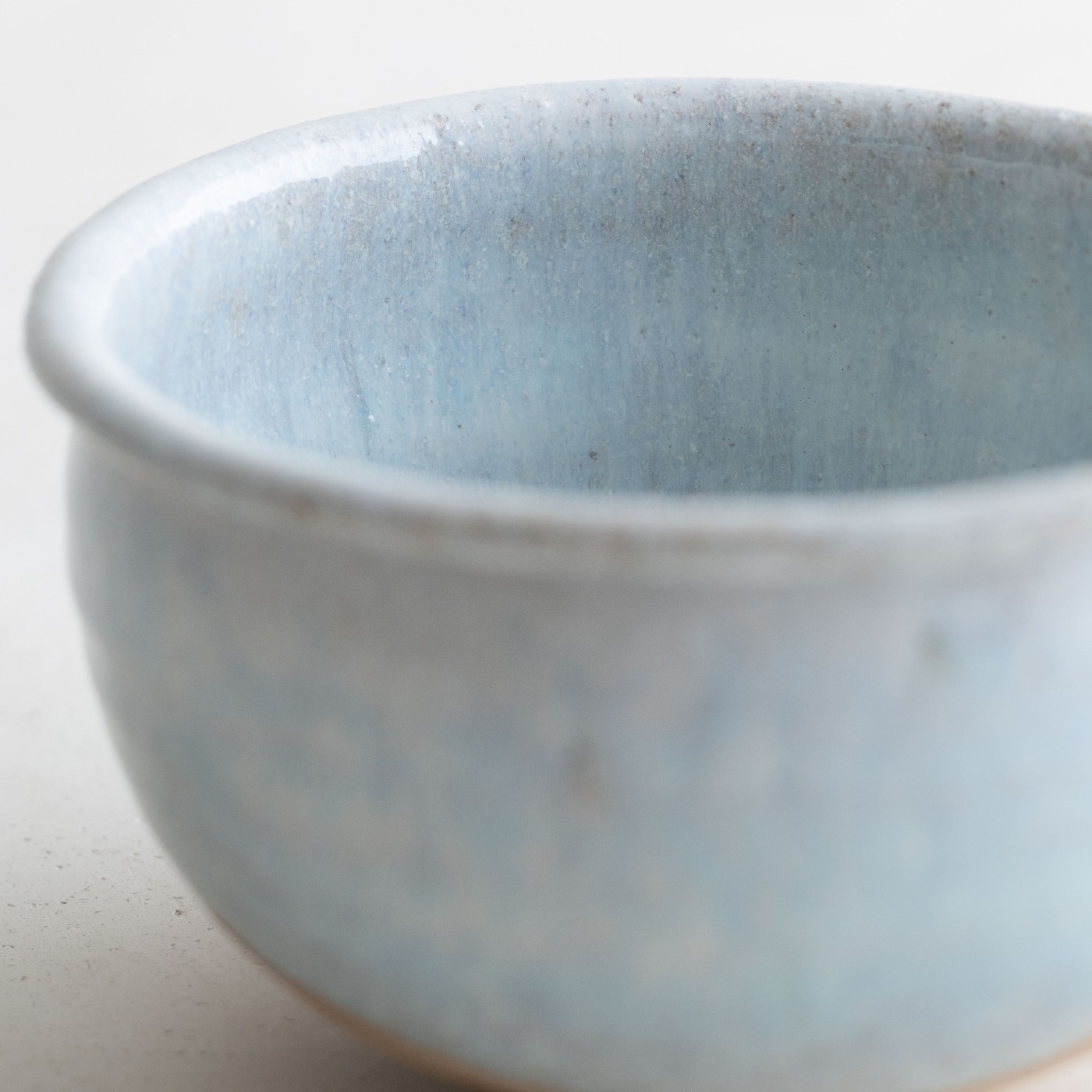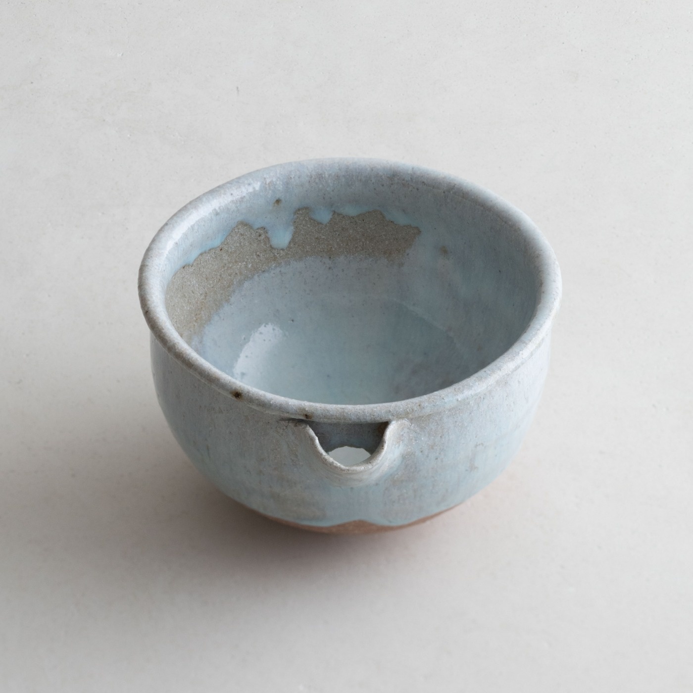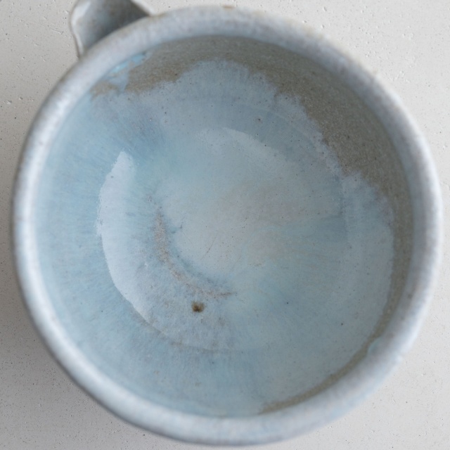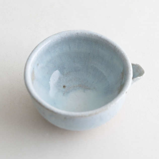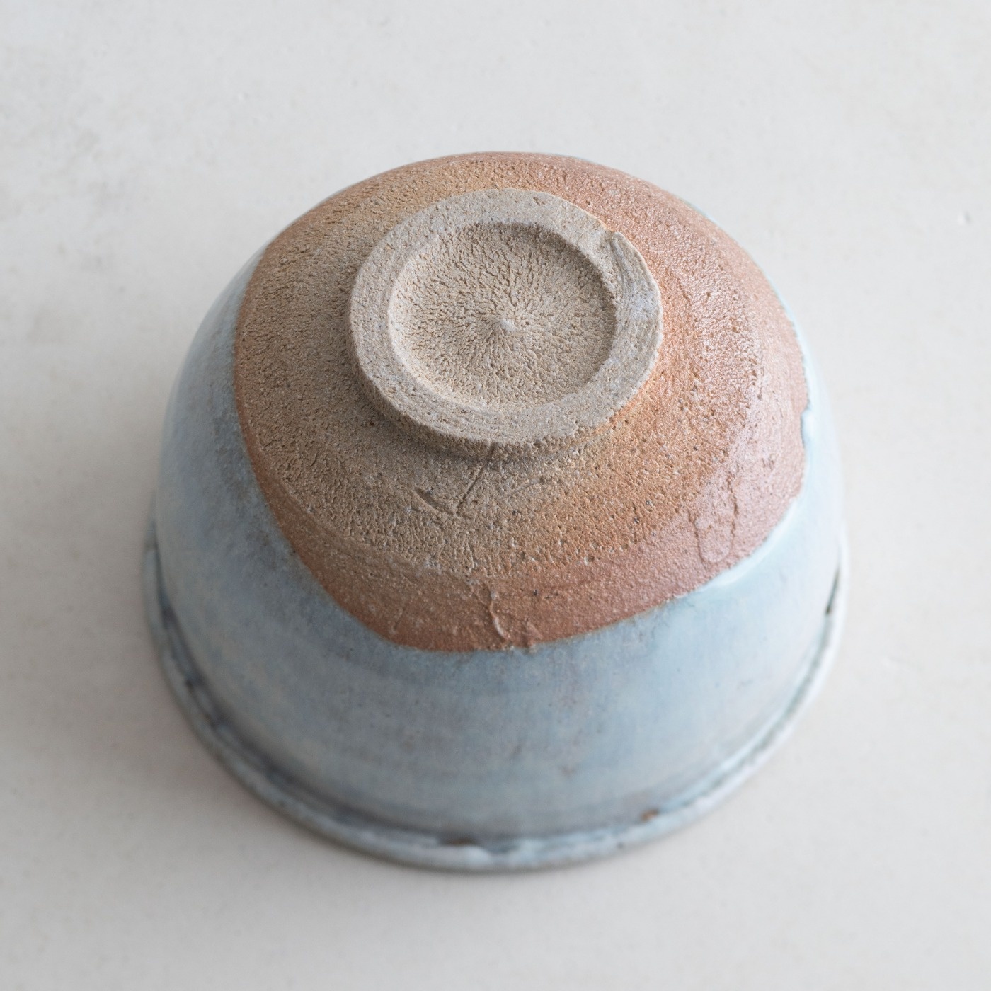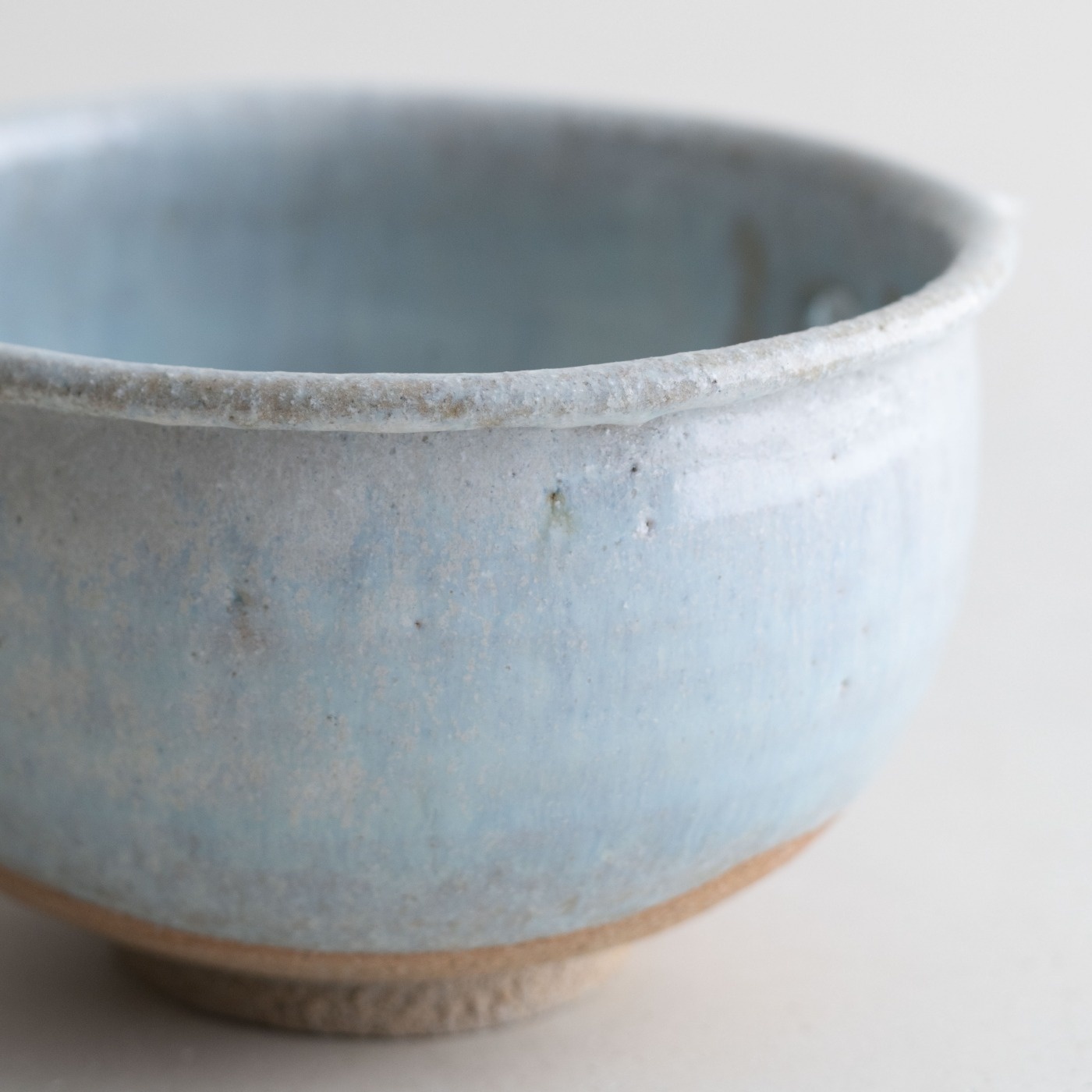 大ぶりの片口で、明るめの青みがかった斑唐津の釉調も大胆な美しい景色です。お酒を注ぐと釉の濃淡の斑が引き立ち、使い続けるとお酒が貫入にも染みて、濃淡が育つそうです。土は北波多地区などで採取した吉野谷砂岩で、粒が大きく、精製するとざっくりとした土になり、高台周りの釉薬の掛からない土見せも目を引きます。矢野さんは憧れの古い物に学びながら、自分で土も釉薬もつくり続けています。「自分は本当に唐津好きになりました。わからないことがたくさんあって、今でも少しずつ調合を変えてみたりしています」。