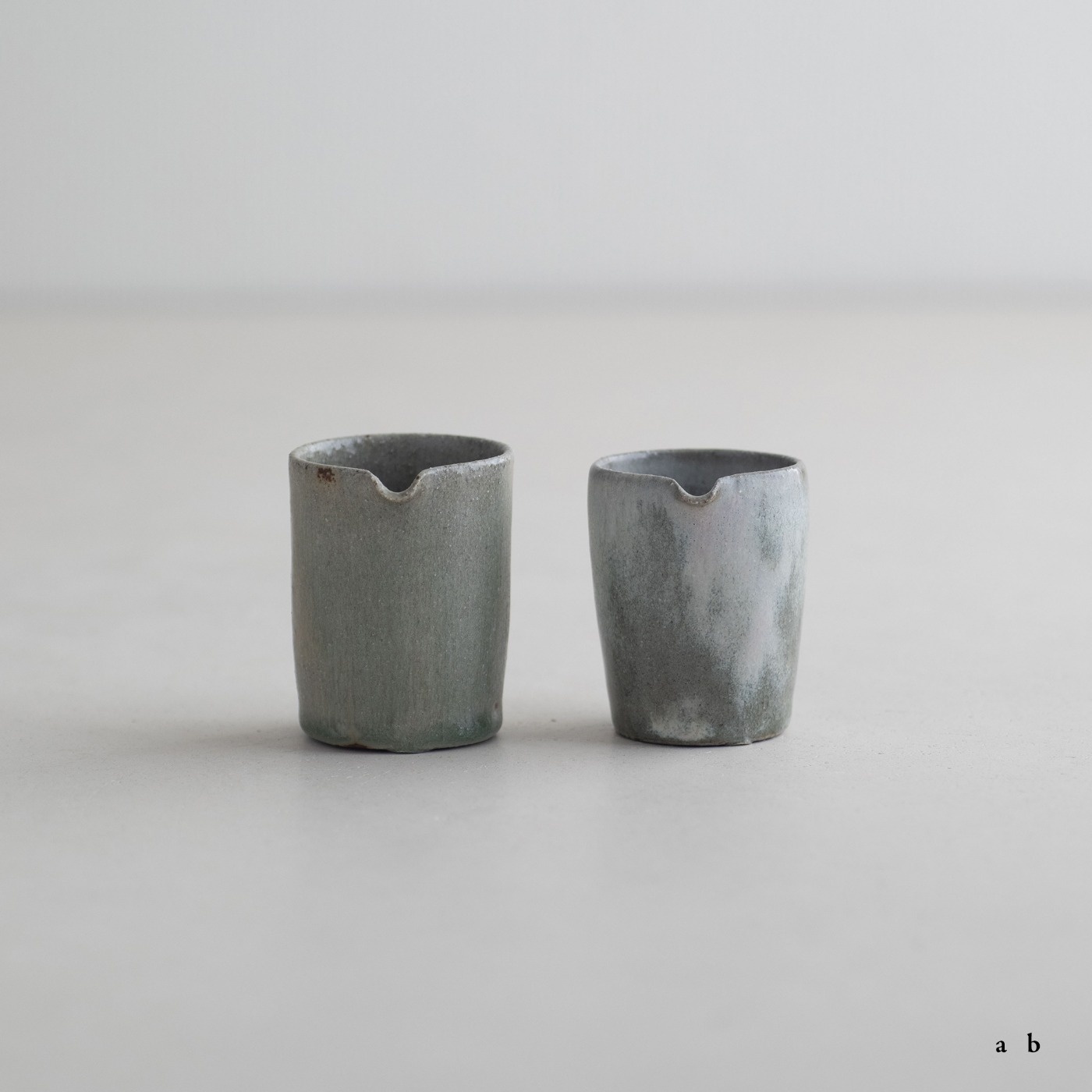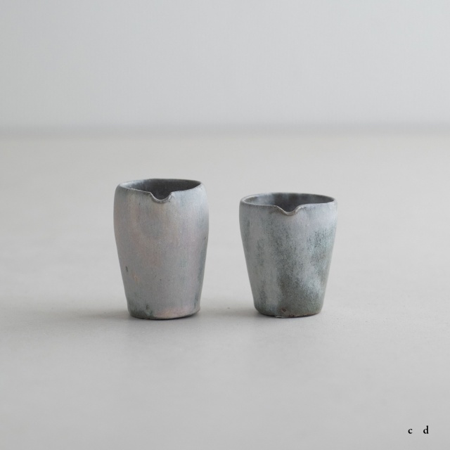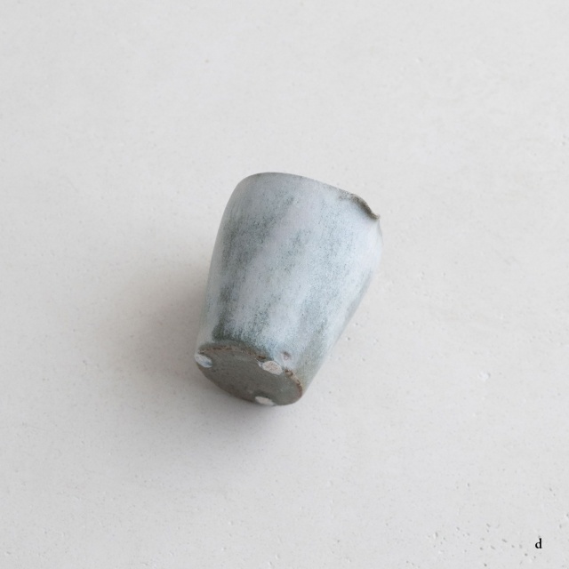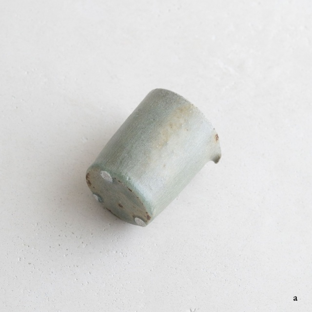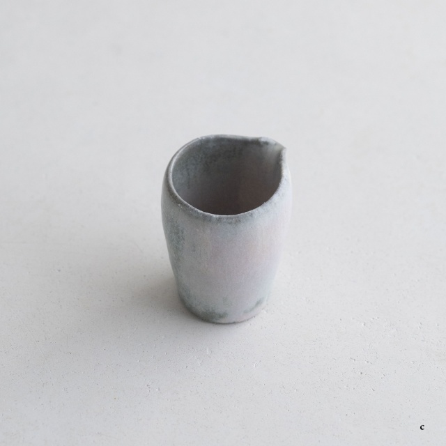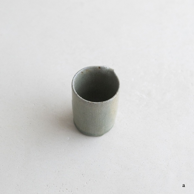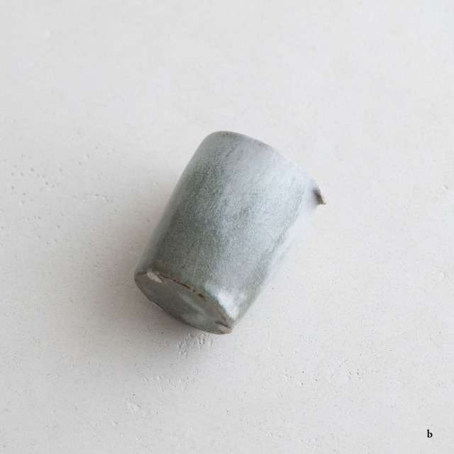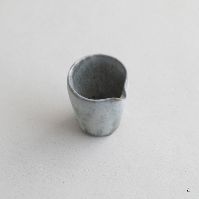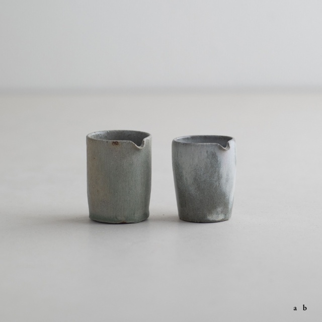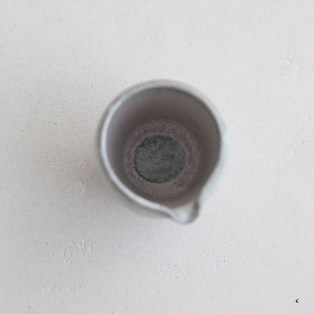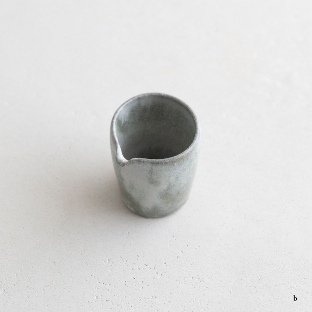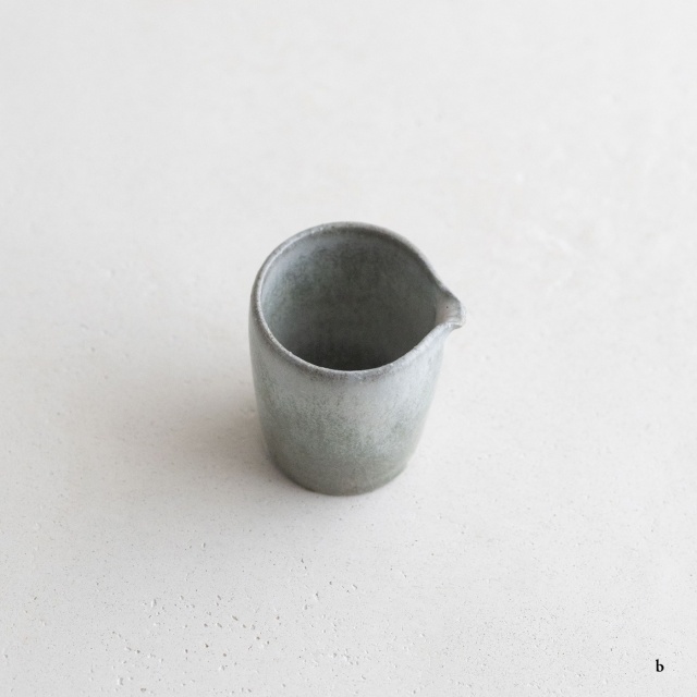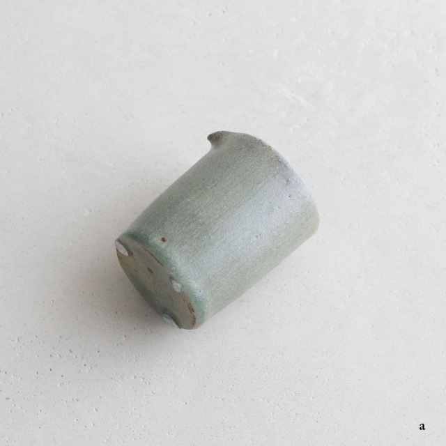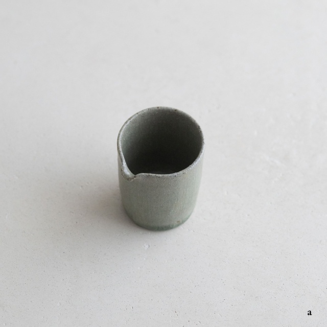 高さ約6〜7センチの小ぶりな筒片口です。同じ林檎灰釉の極小盃チブグヮーに合わせて使いやすいサイズです。長野県の林檎農家さんによる林檎灰を使った林檎灰釉を掛けていて、全体的にやさしいグリーングレー調。ものによって桜色や白色、淡い黄色い景色も見られます。お酒やお茶をはじめ、ドレッシングやソース入れなどお料理にも重宝します。