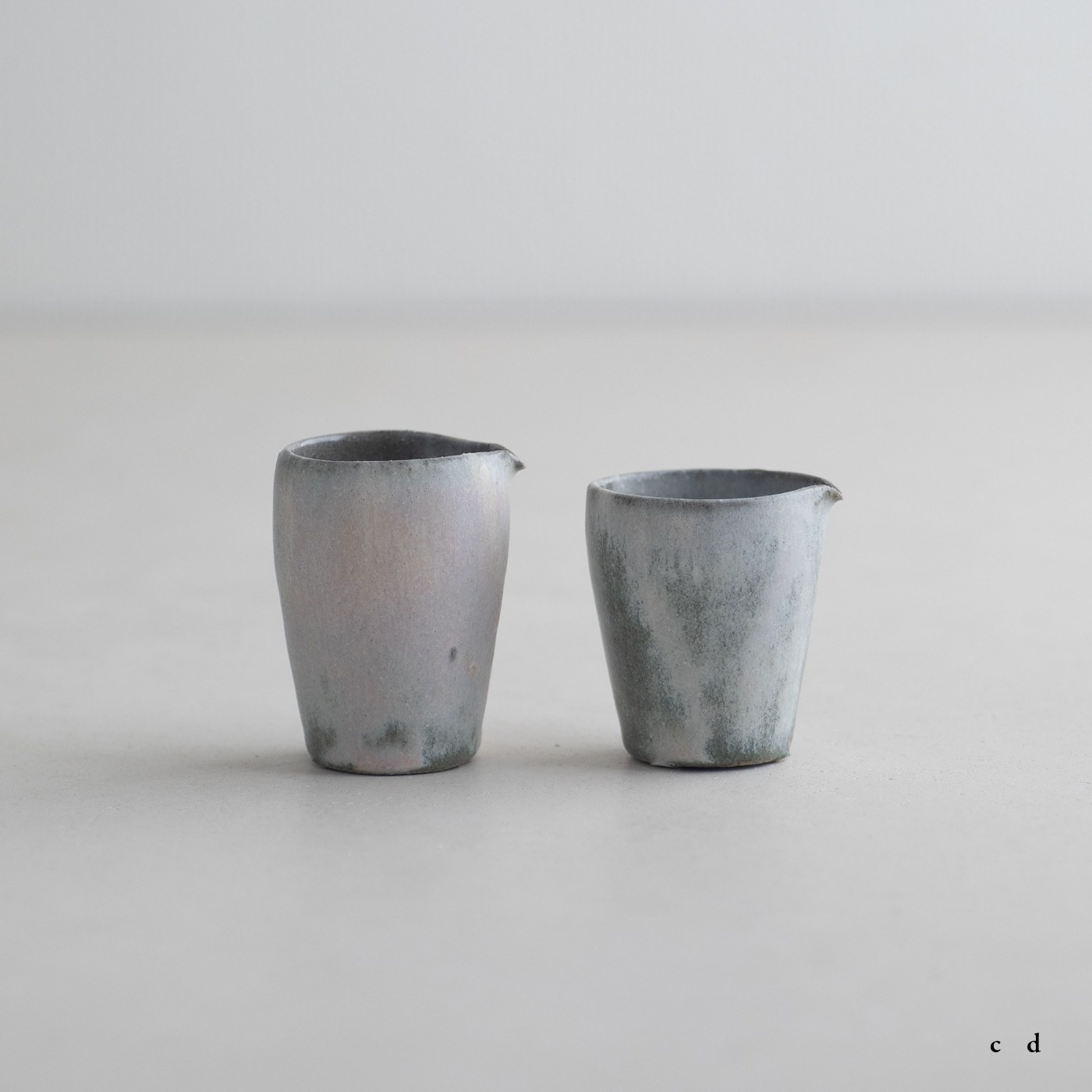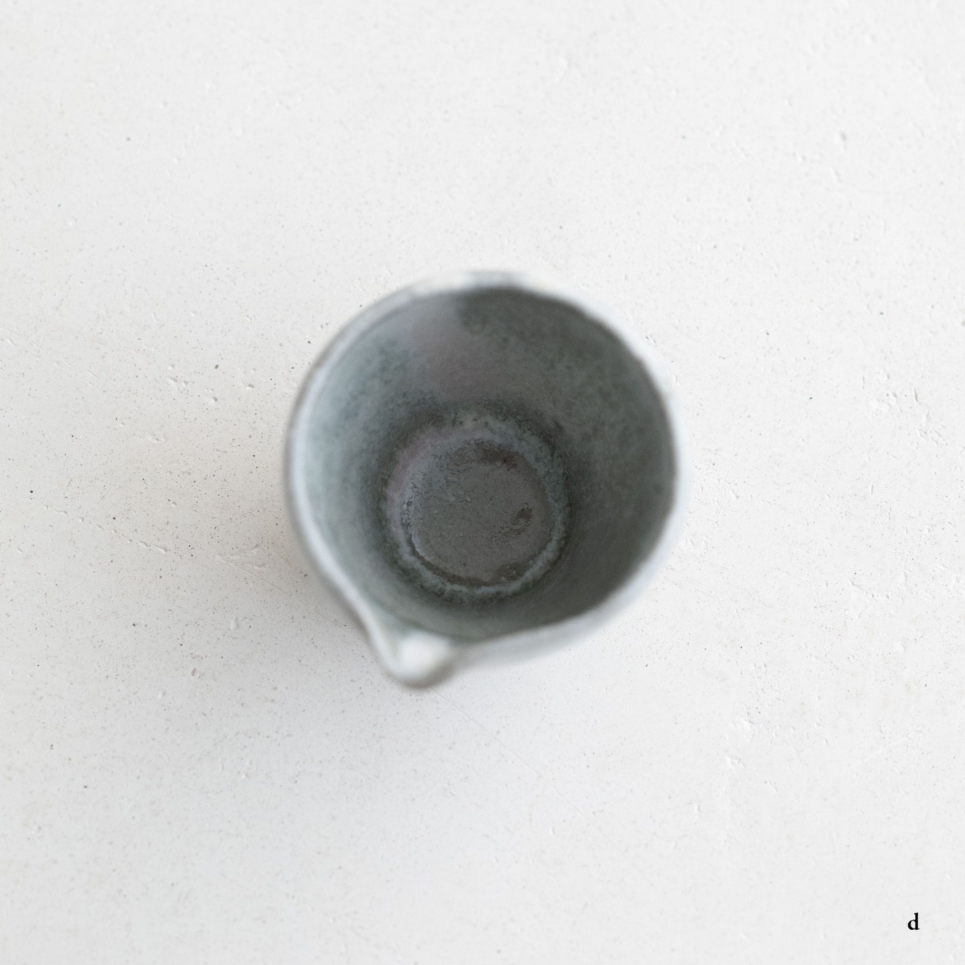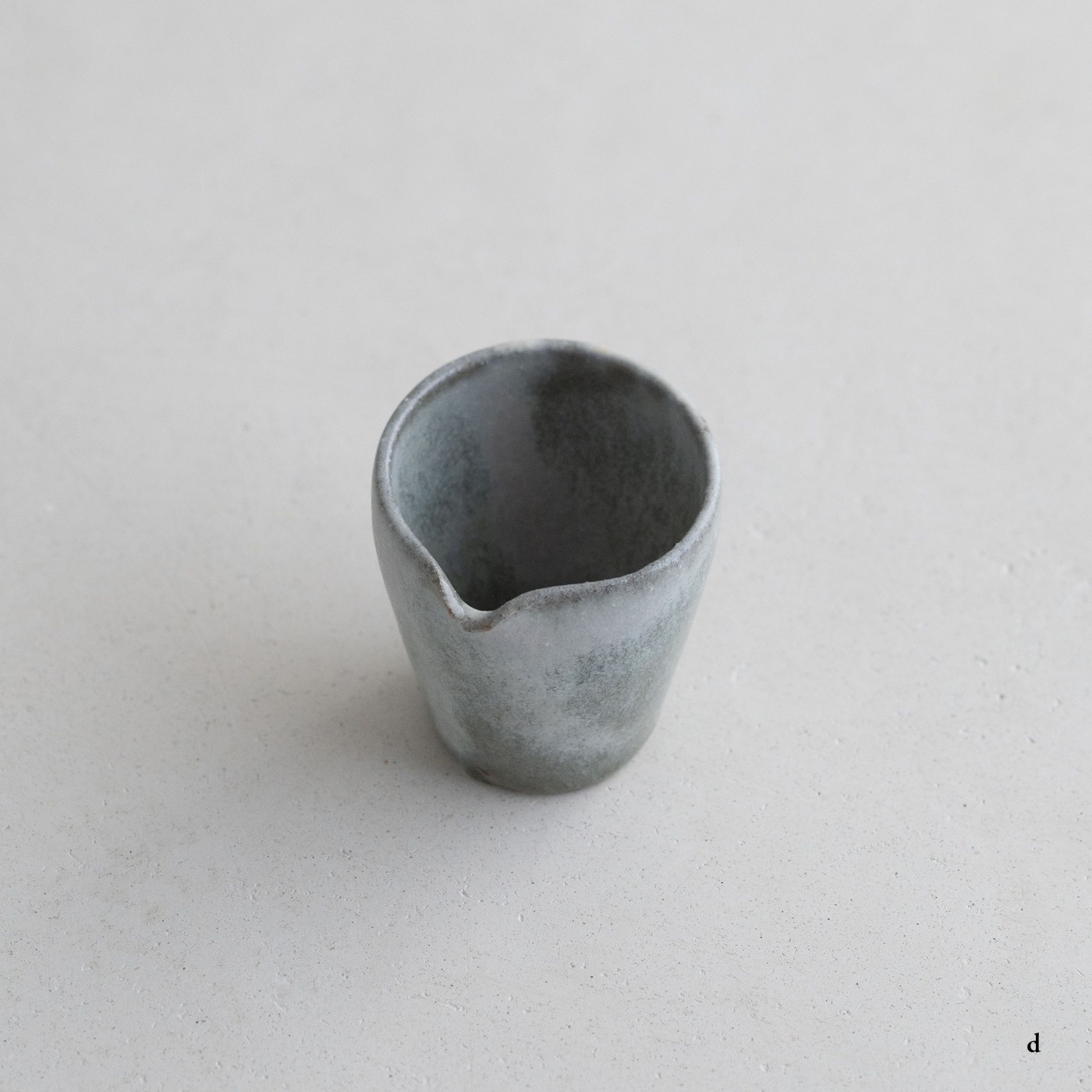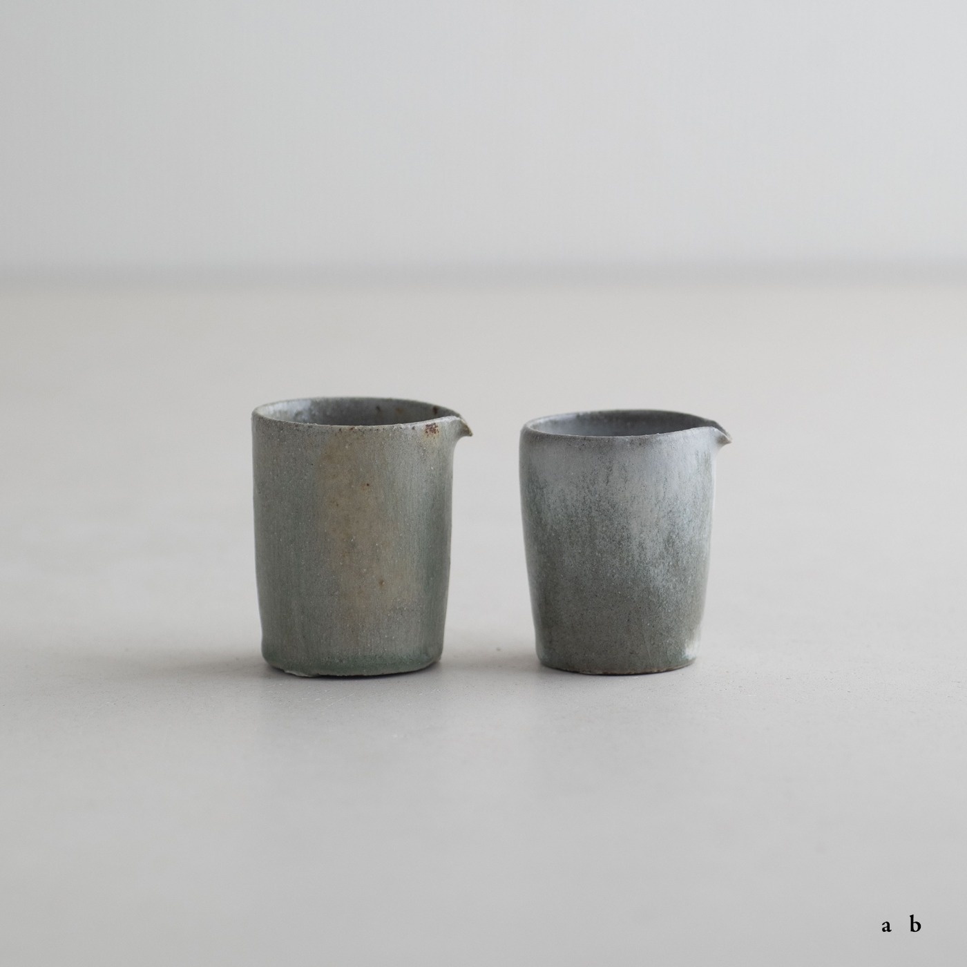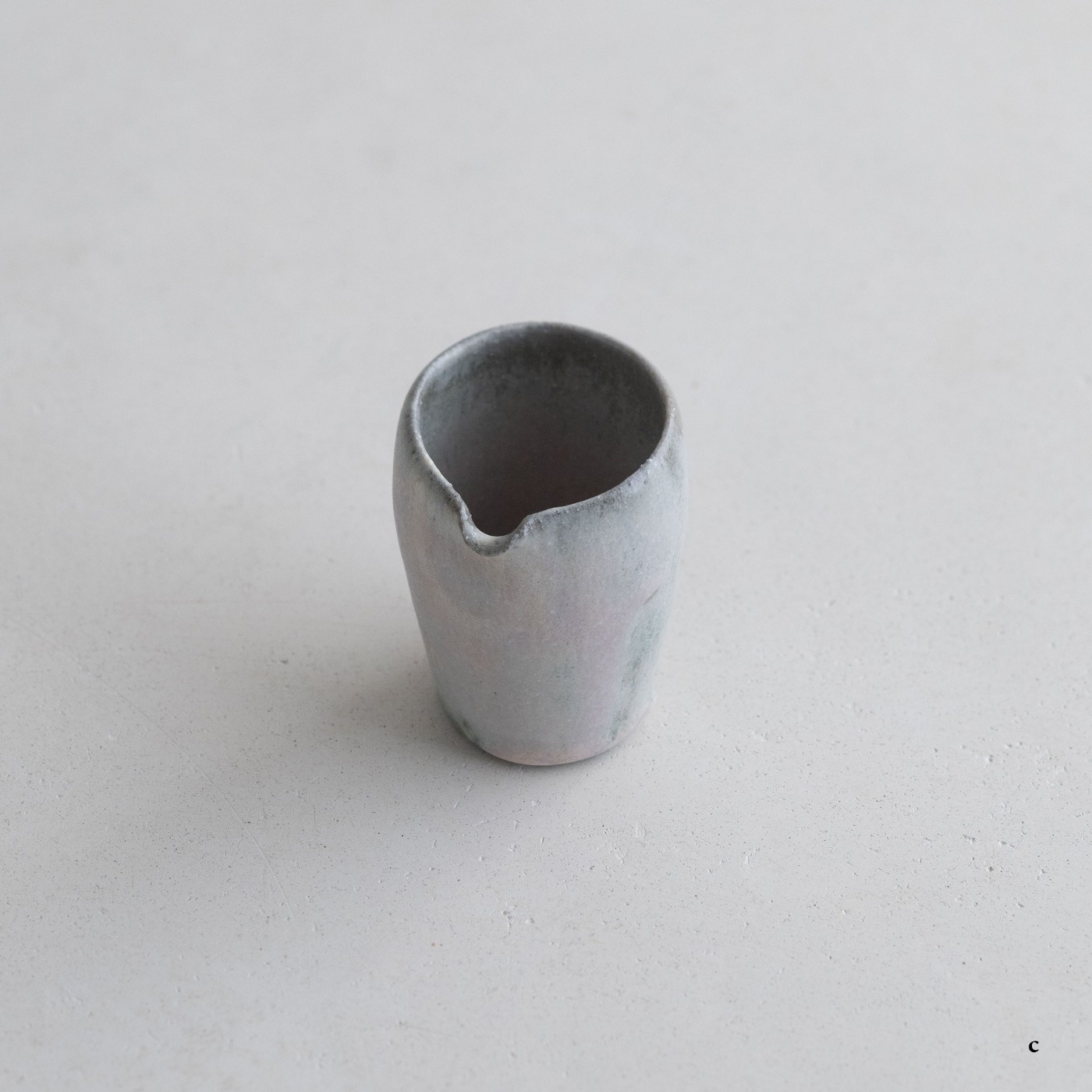 高さ約6〜7センチの小ぶりな筒片口です。同じ林檎灰釉の極小盃チブグヮーに合わせて使いやすいサイズです。長野県の林檎農家さんによる林檎灰を使った林檎灰釉を掛けていて、全体的にやさしいグリーングレー調。ものによって桜色や白色、淡い黄色い景色も見られます。お酒やお茶をはじめ、ドレッシングやソース入れなどお料理にも重宝します。