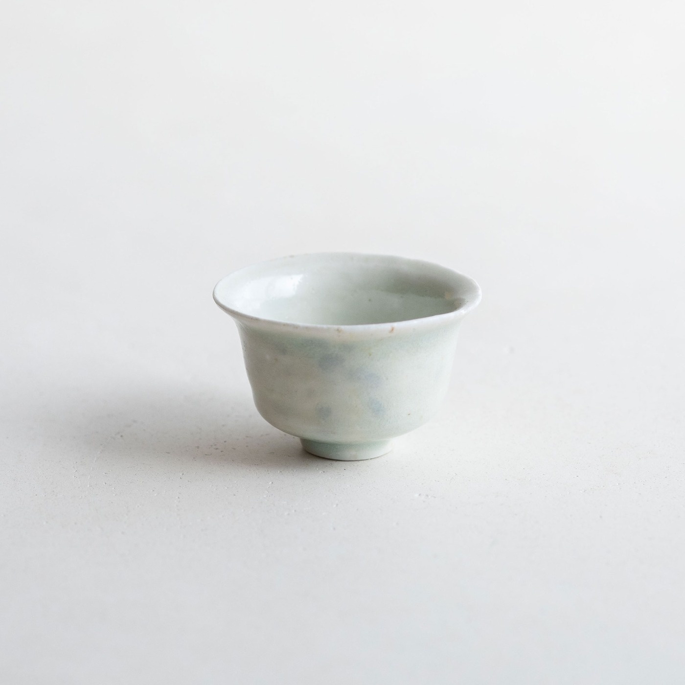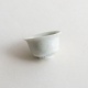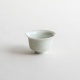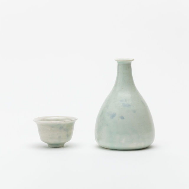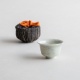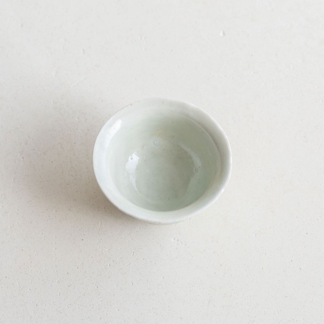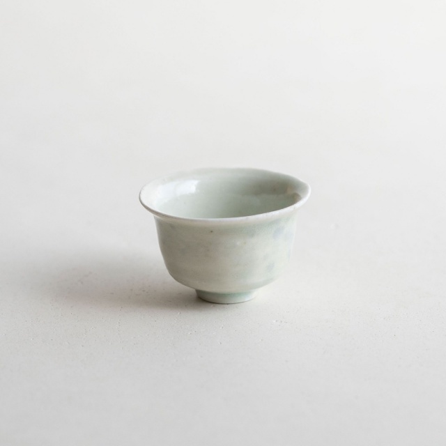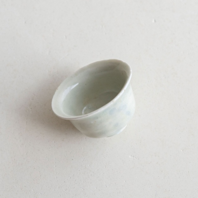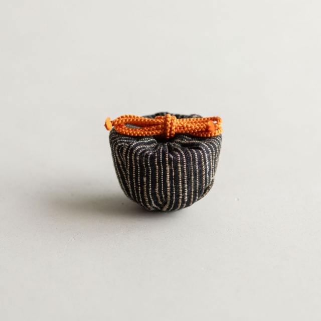 山本亮平さんの染付小坏は、特徴的な端反りが印象的。おぼろげな染付に対して、酒器袋はパキッと鮮やか。黒っぽい麻に縦縞の織り、緒は柿色で粋な雰囲気です。酒器袋はtextile n+R の制作です。