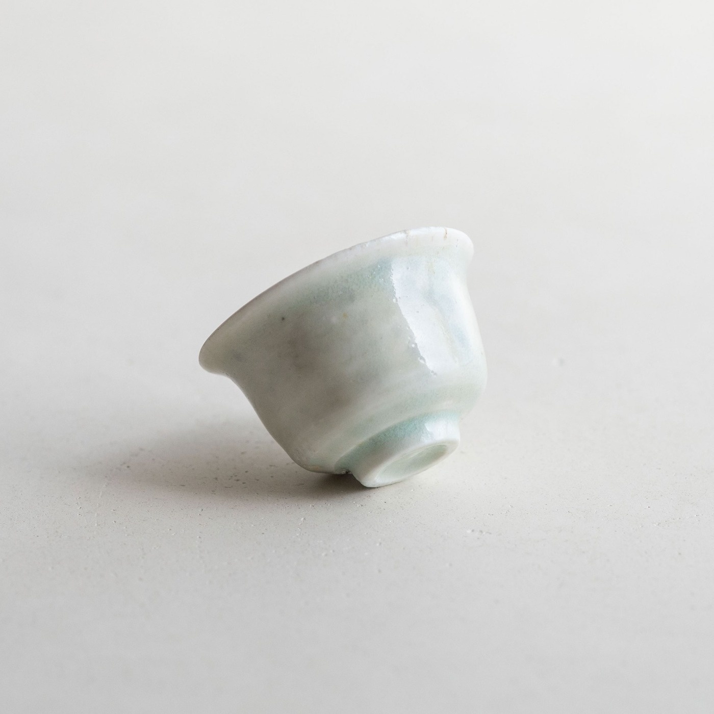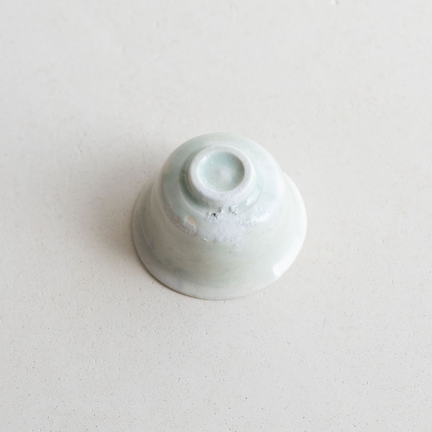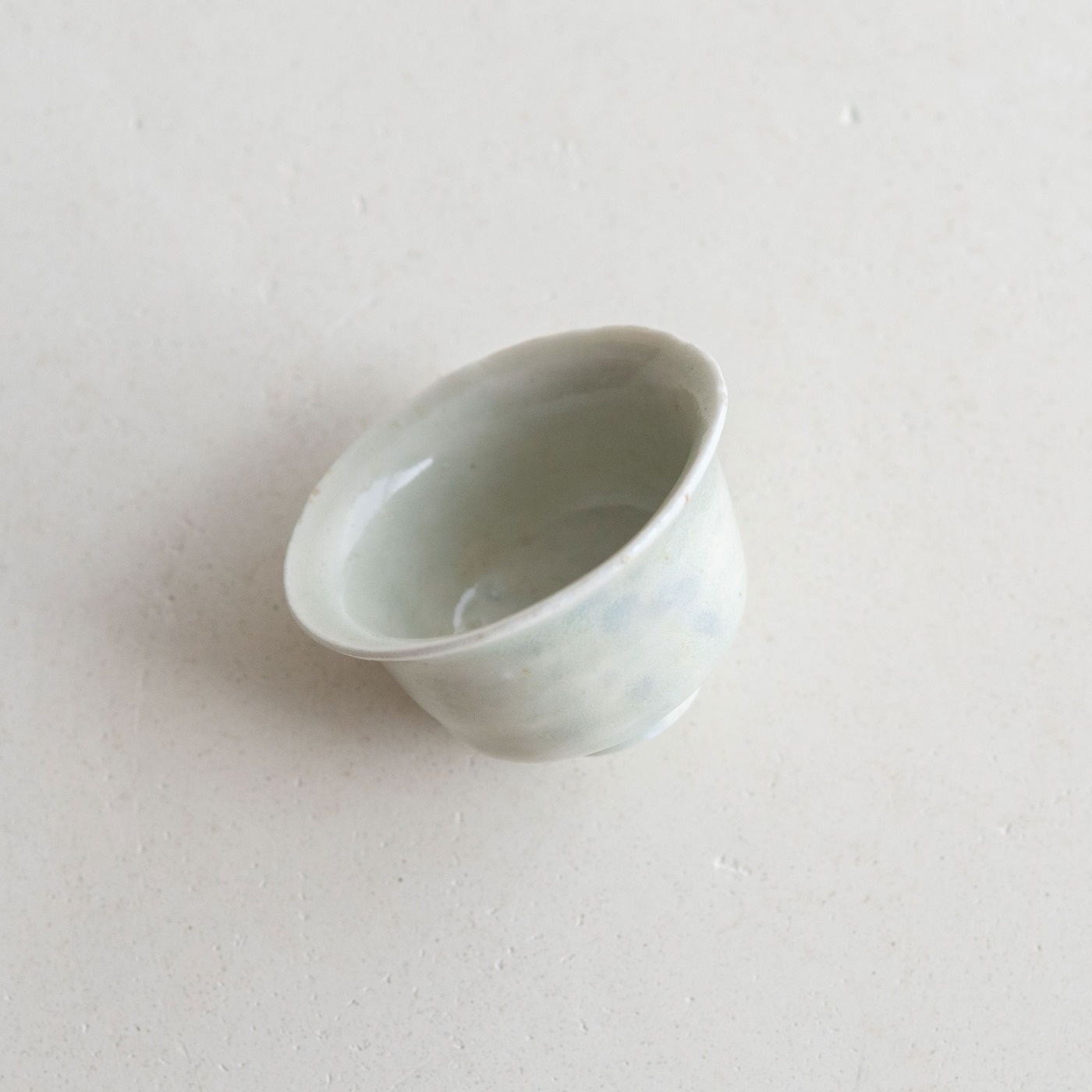 山本亮平さんの染付小坏は、特徴的な端反りが印象的。おぼろげな染付に対して、酒器袋はパキッと鮮やか。黒っぽい麻に縦縞の織り、緒は柿色で粋な雰囲気です。酒器袋はtextile n+R の制作です。