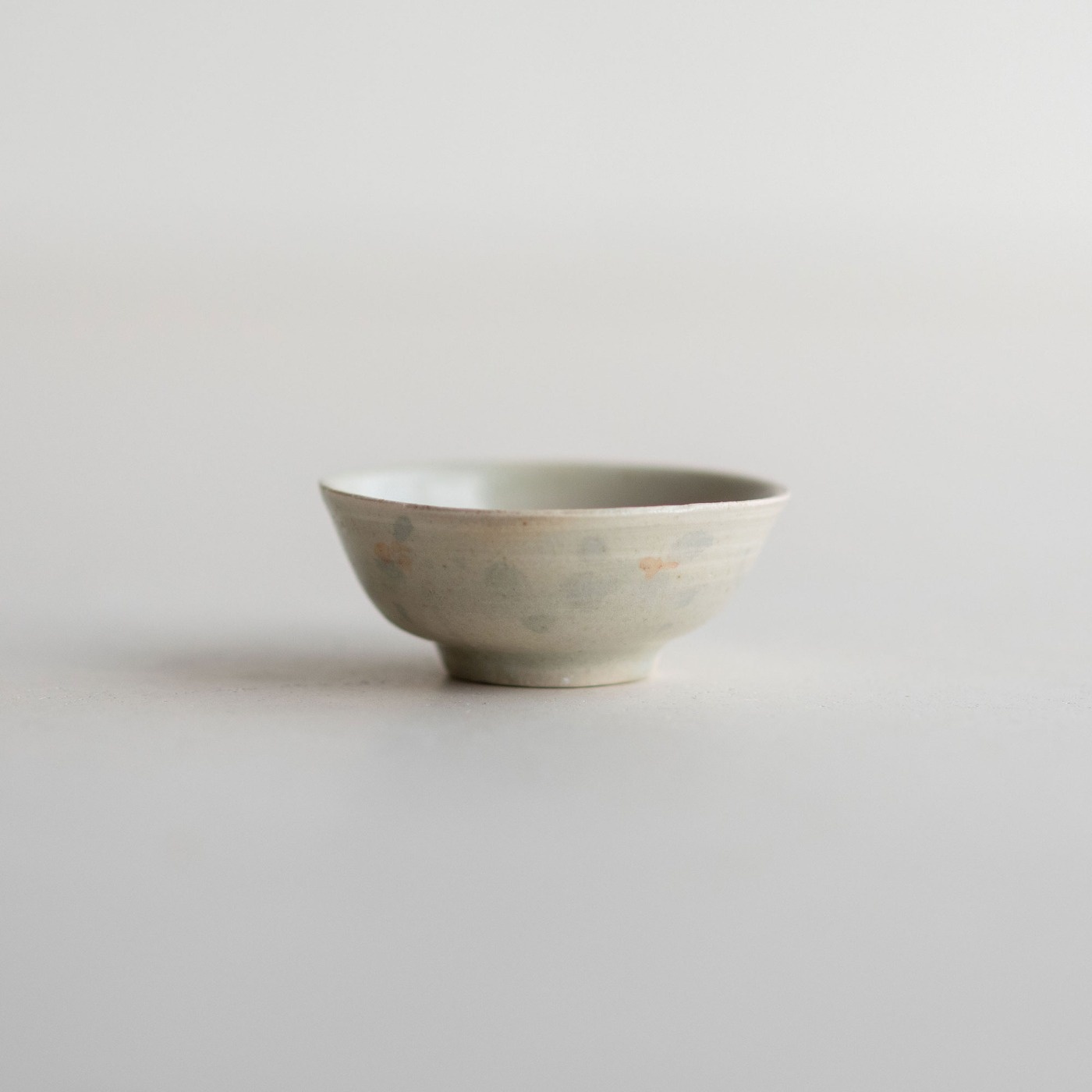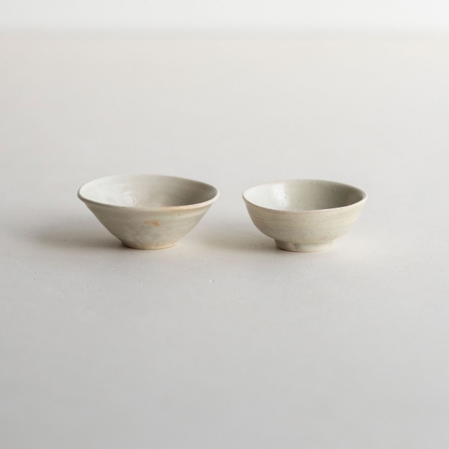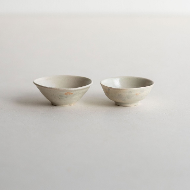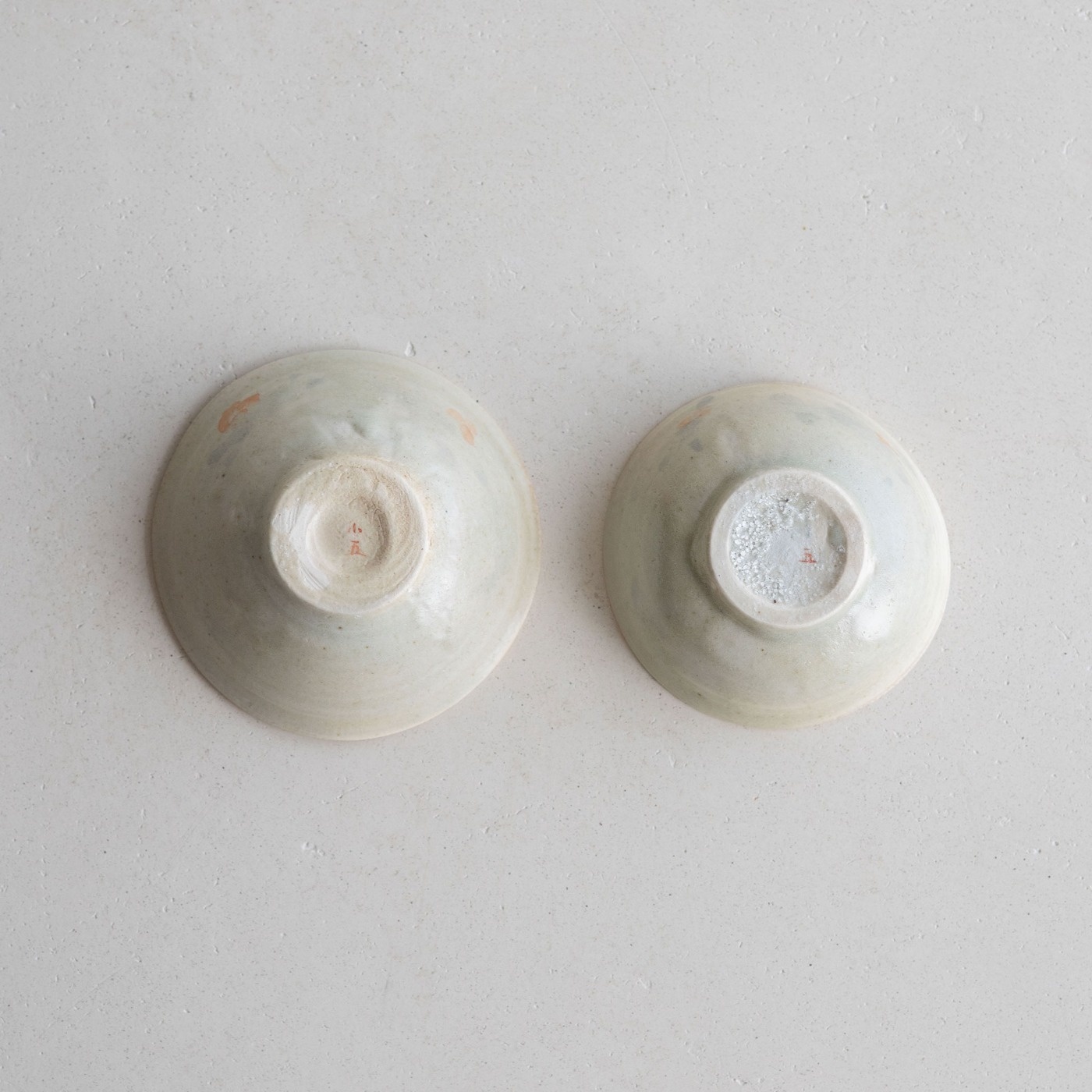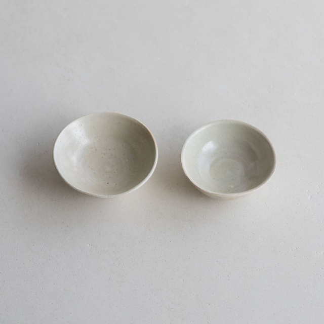 山本亮平さんの染付と赤絵付がうっすら見える平坏を2個重ねたセットです。平坏は全体的にマットな枯れ色の雰囲気で、赤絵の橙色がかったところがきれいに映えます。2個を重ねて収める酒器袋は、インドのカンタ刺繍の木綿。内側の布にもインドの型染めの木綿を使用していて、緒は若竹色の絹。酒器袋に収めるのも取り出すのもたのしくなります。酒器袋はtextile n+R の制作です。