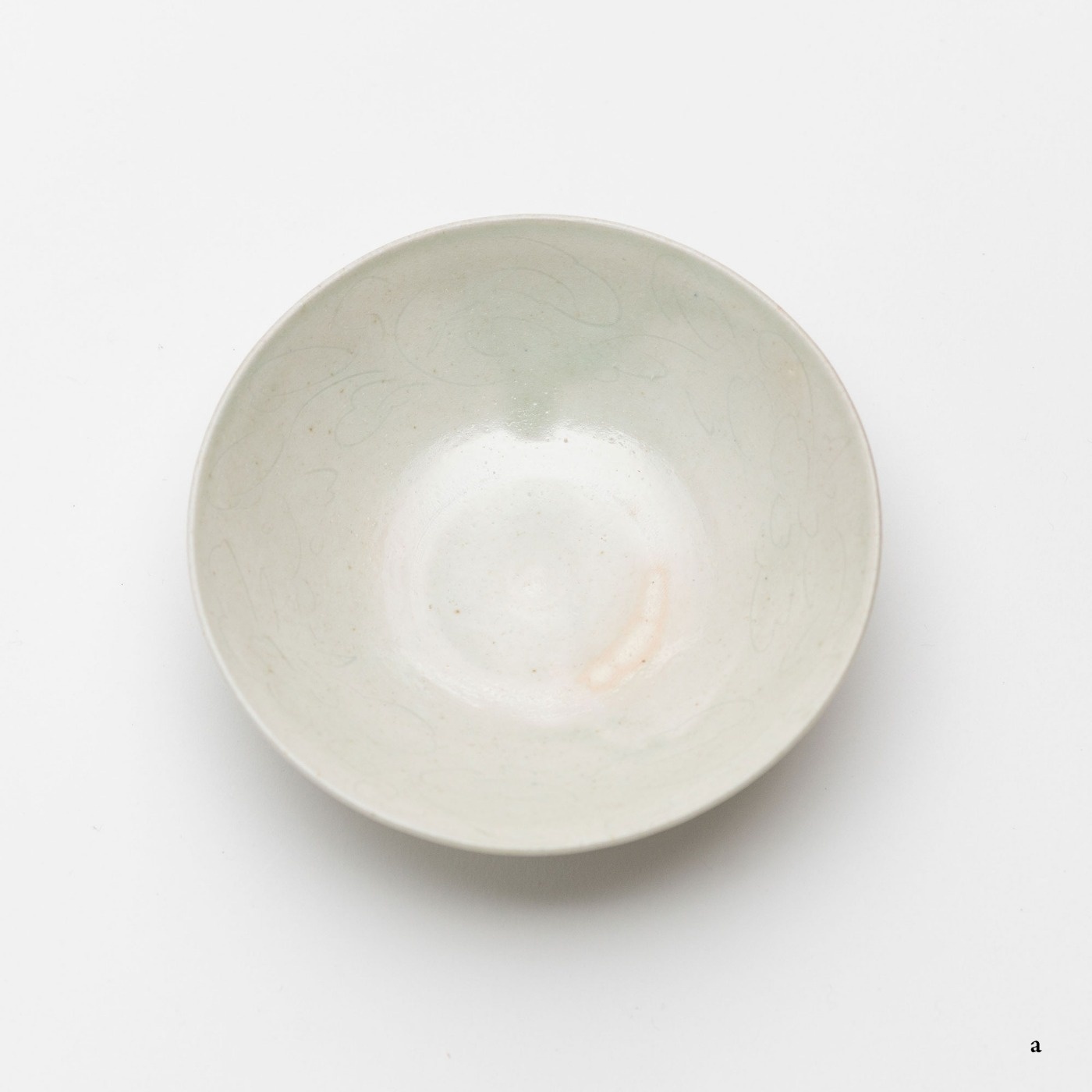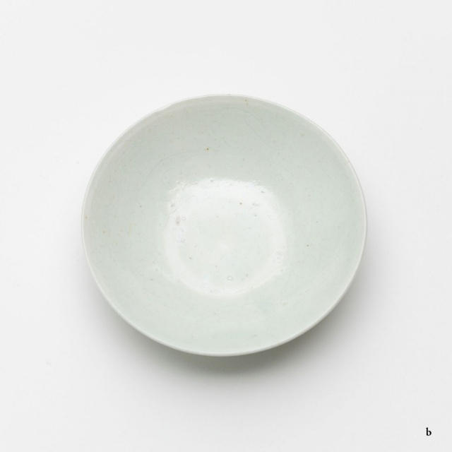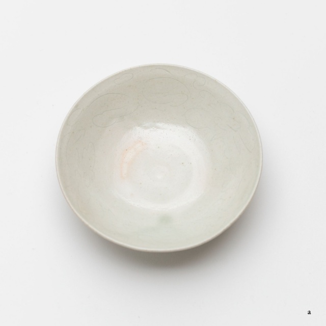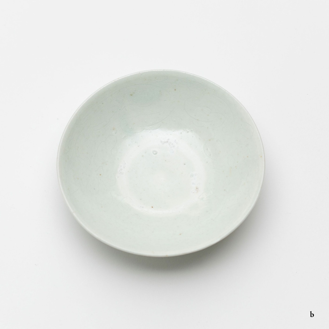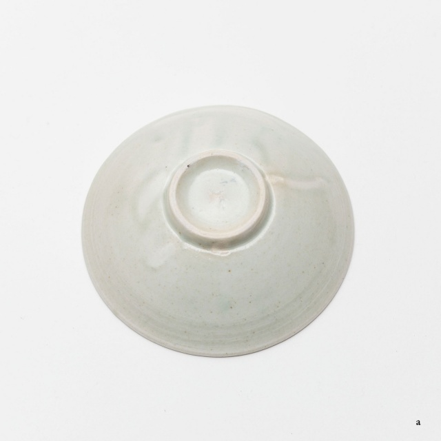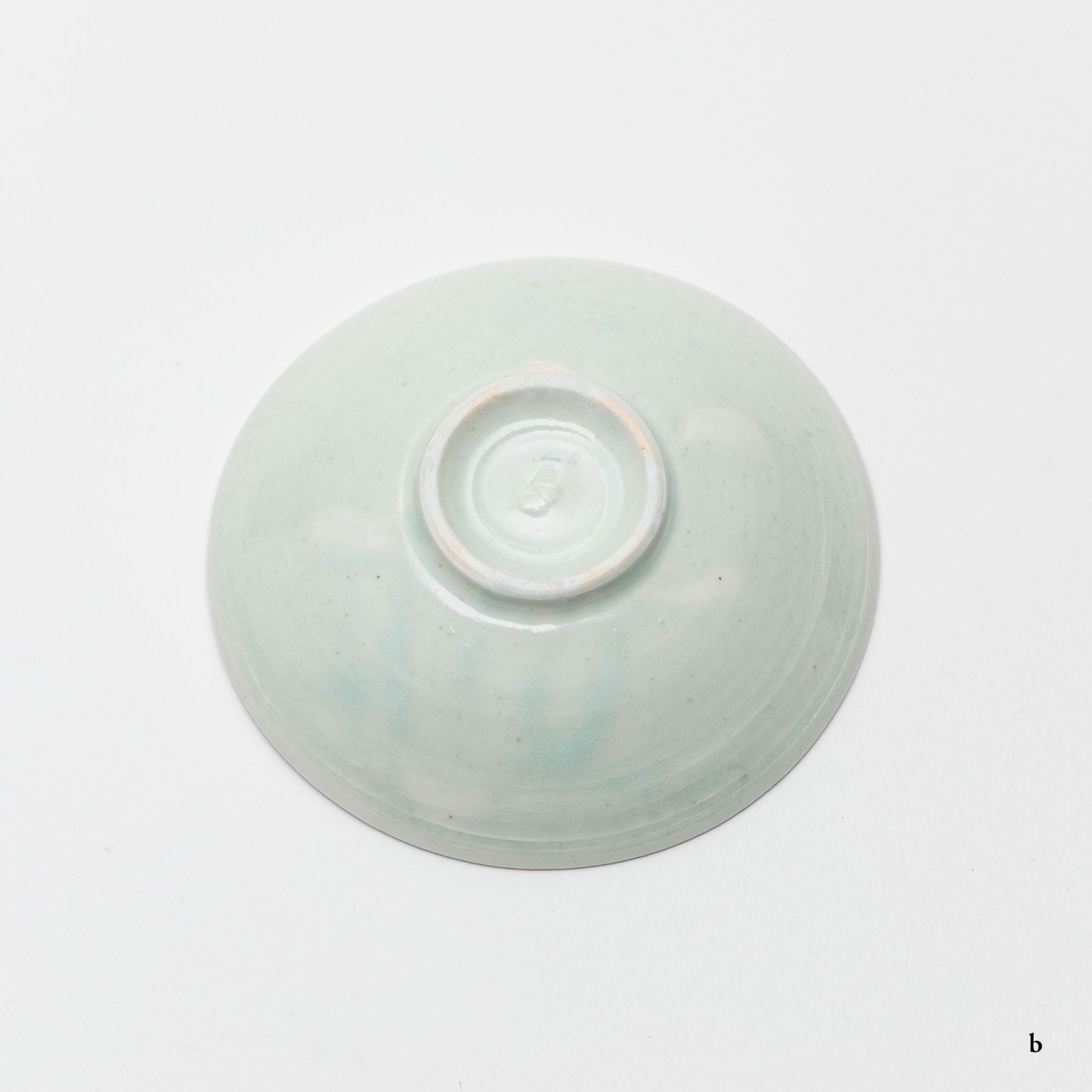 縁に向かって立ち上がっていて使い勝手のよい四寸皿です。さり気ない線刻と見込みに見られる砂目跡が魅力的です。