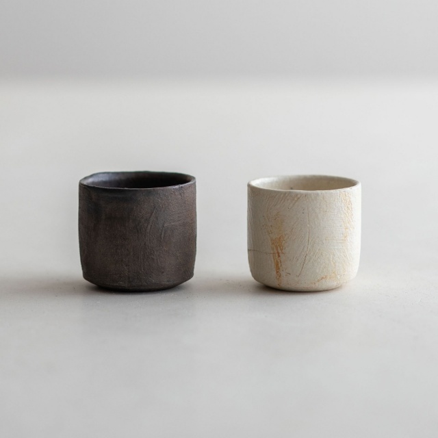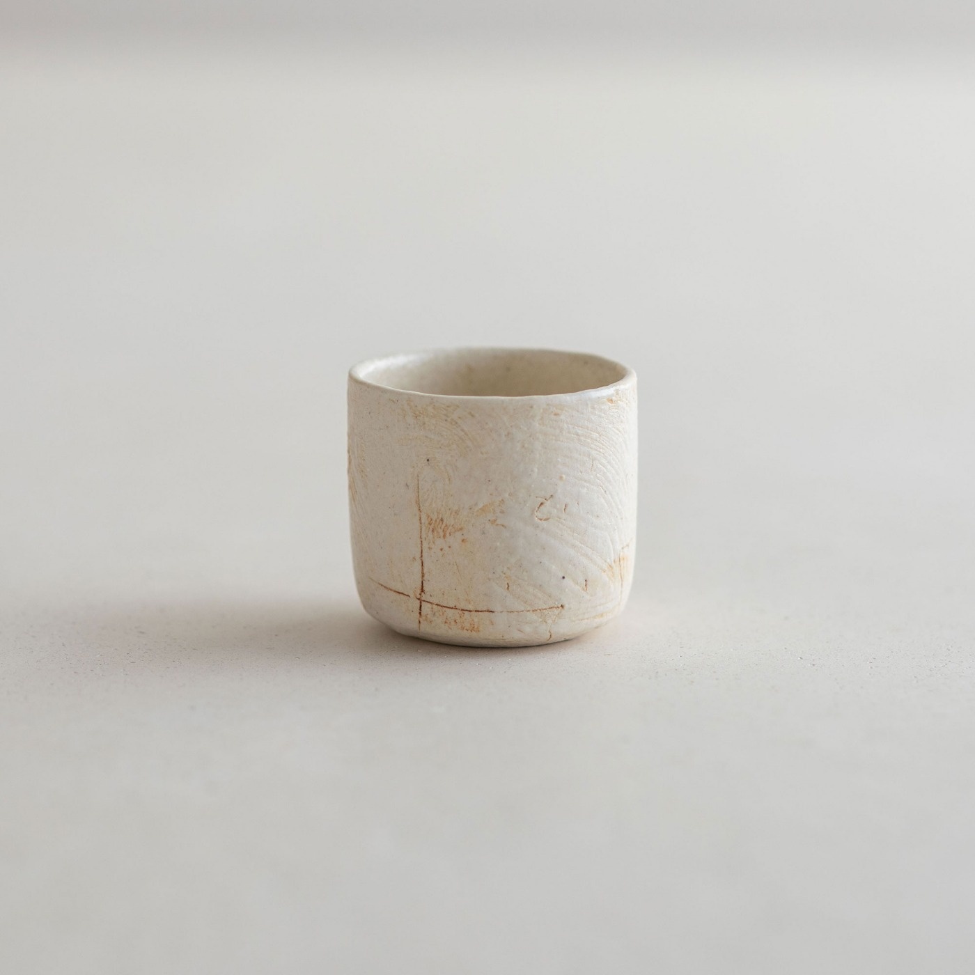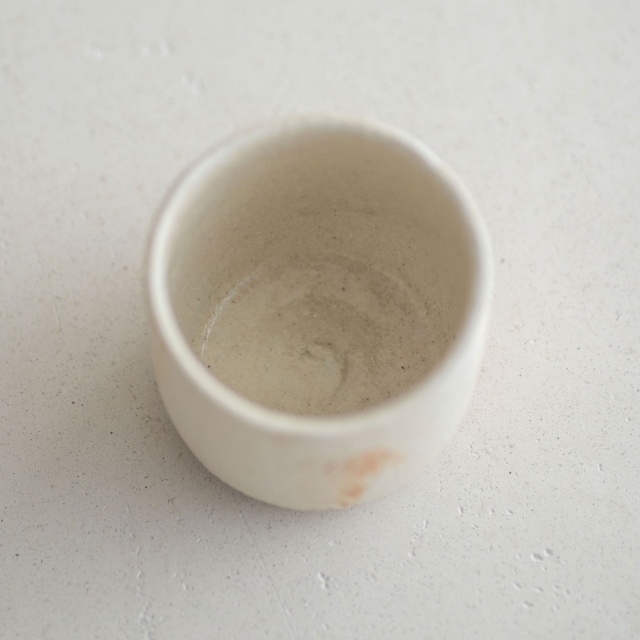 本焼きした後、外側に刷毛で化粧などを施し、焼成を重ねた、テクスチャーのあるやや小ぶりな酒盃です。クリームがかった白色の中に、ところどころ赤茶色の景色が見られます。