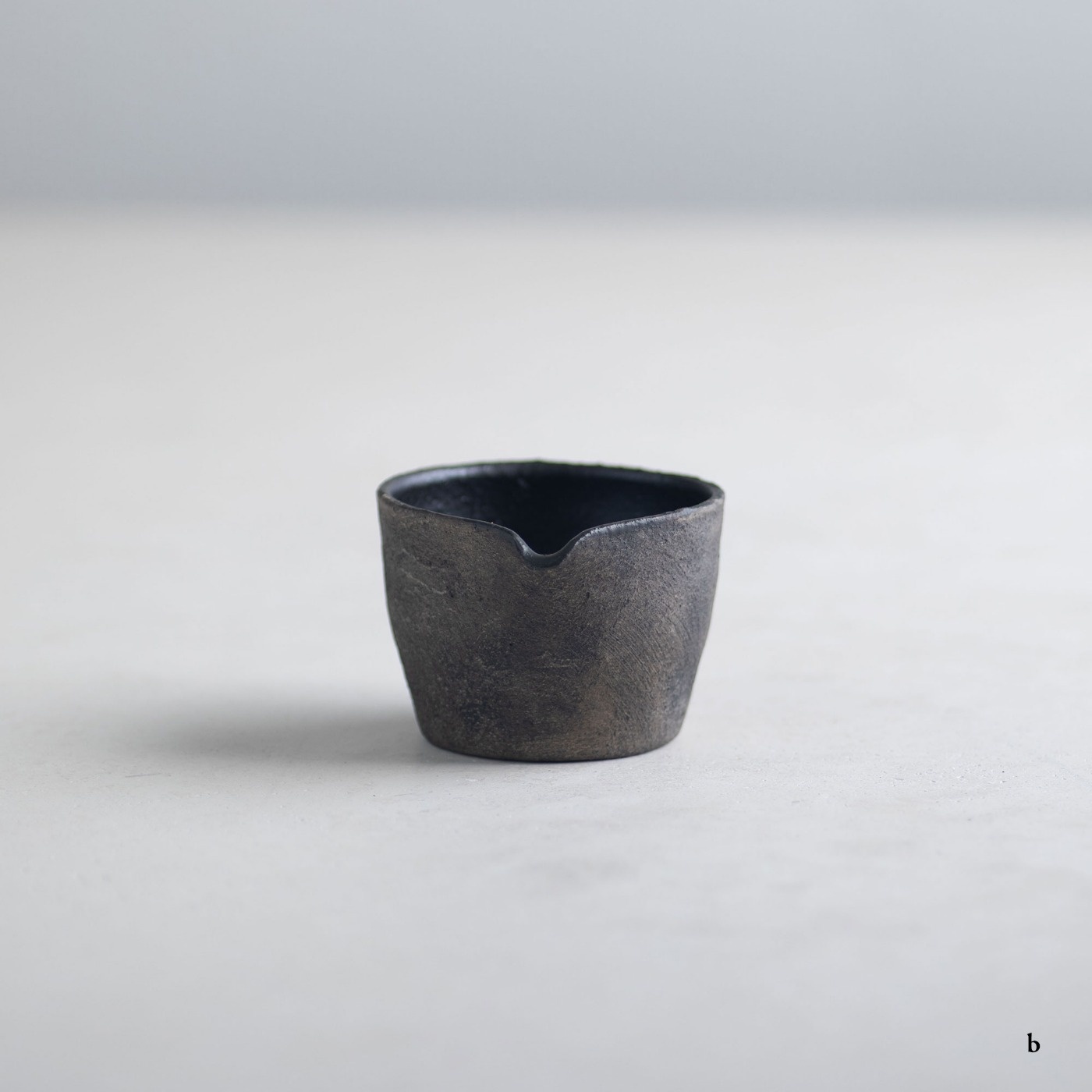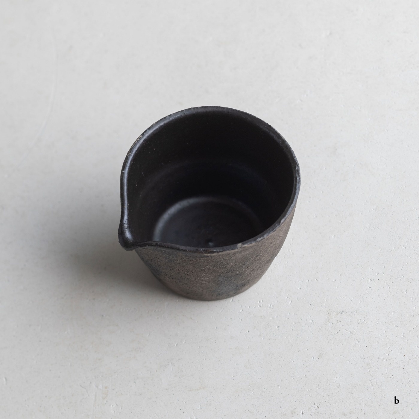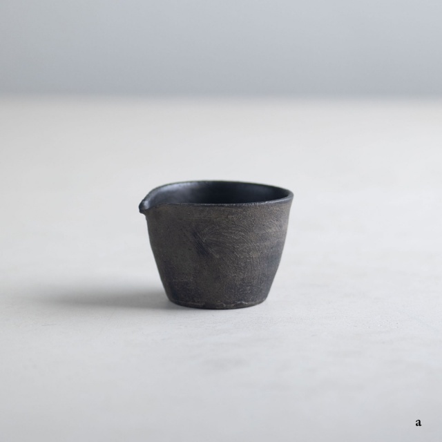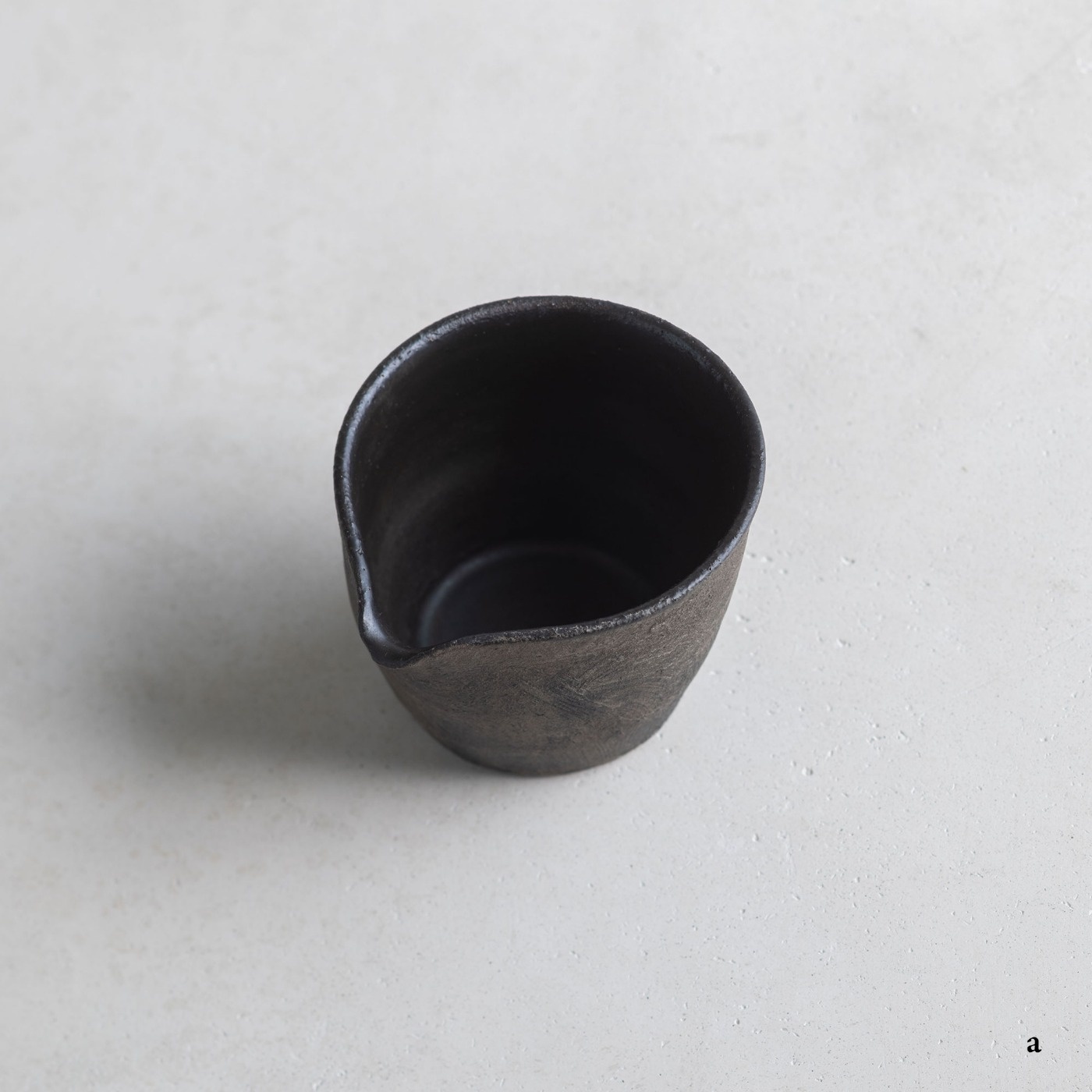 黒銀彩シリーズの小さな片口で、容量は約100cc。テクスチャーに色の奥行きや手触り感のある黒銀彩は、黒色を塗って本焼きした後、外側に刷毛で銀を塗って焼き付け、仕上げに漆を染み込ませています。内側は釉薬がかかっていて滑らかです。