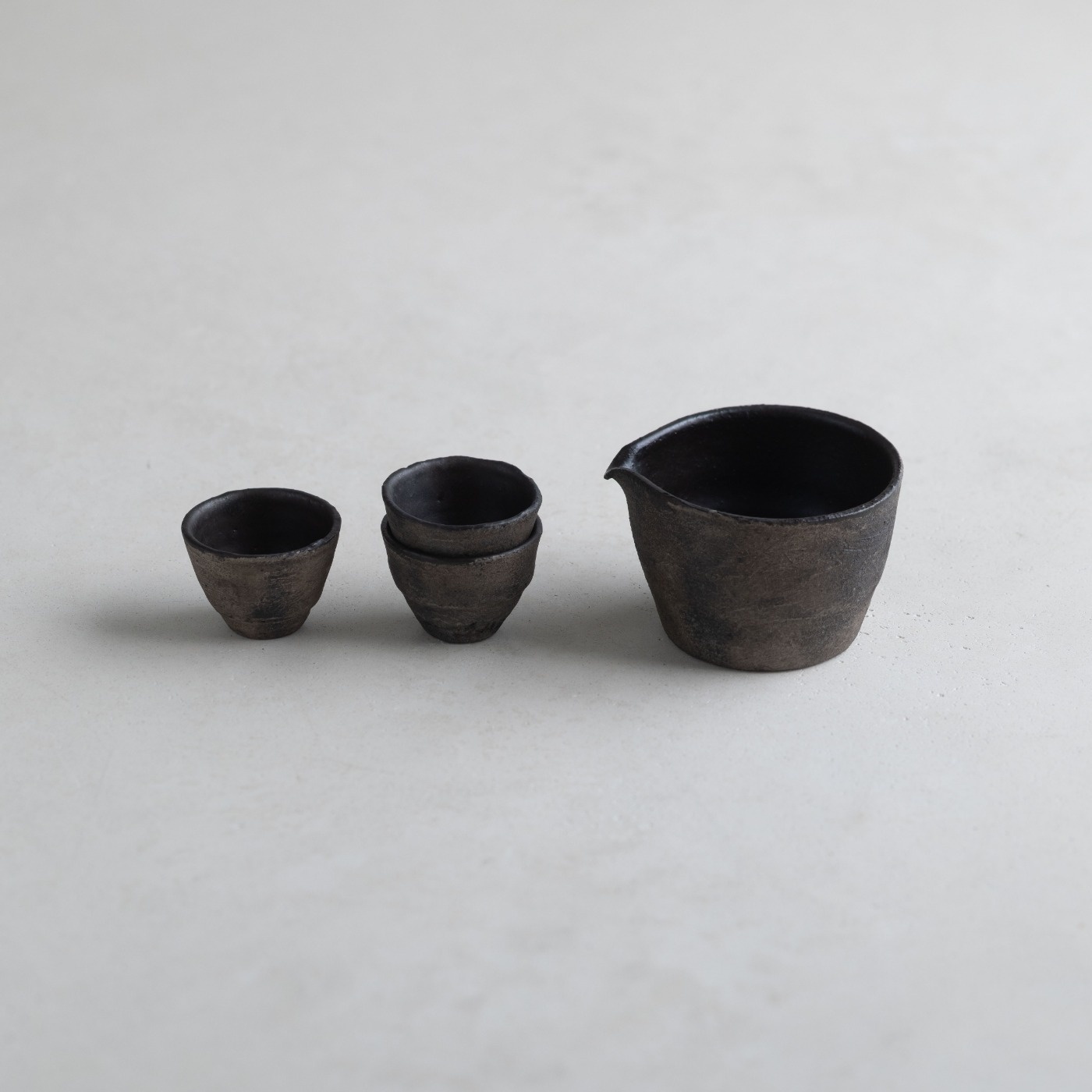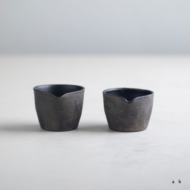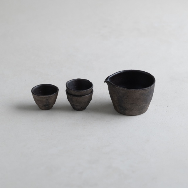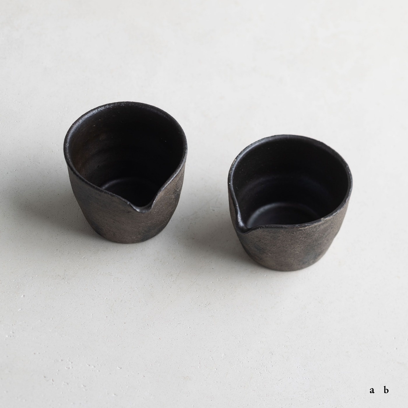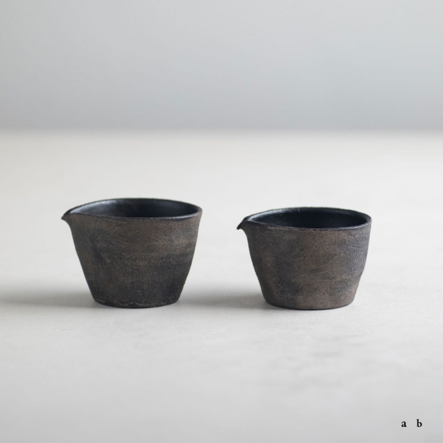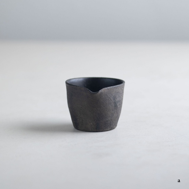 黒銀彩シリーズの小さな片口で、容量は約100cc。テクスチャーに色の奥行きや手触り感のある黒銀彩は、黒色を塗って本焼きした後、外側に刷毛で銀を塗って焼き付け、仕上げに漆を染み込ませています。内側は釉薬がかかっていて滑らかです。