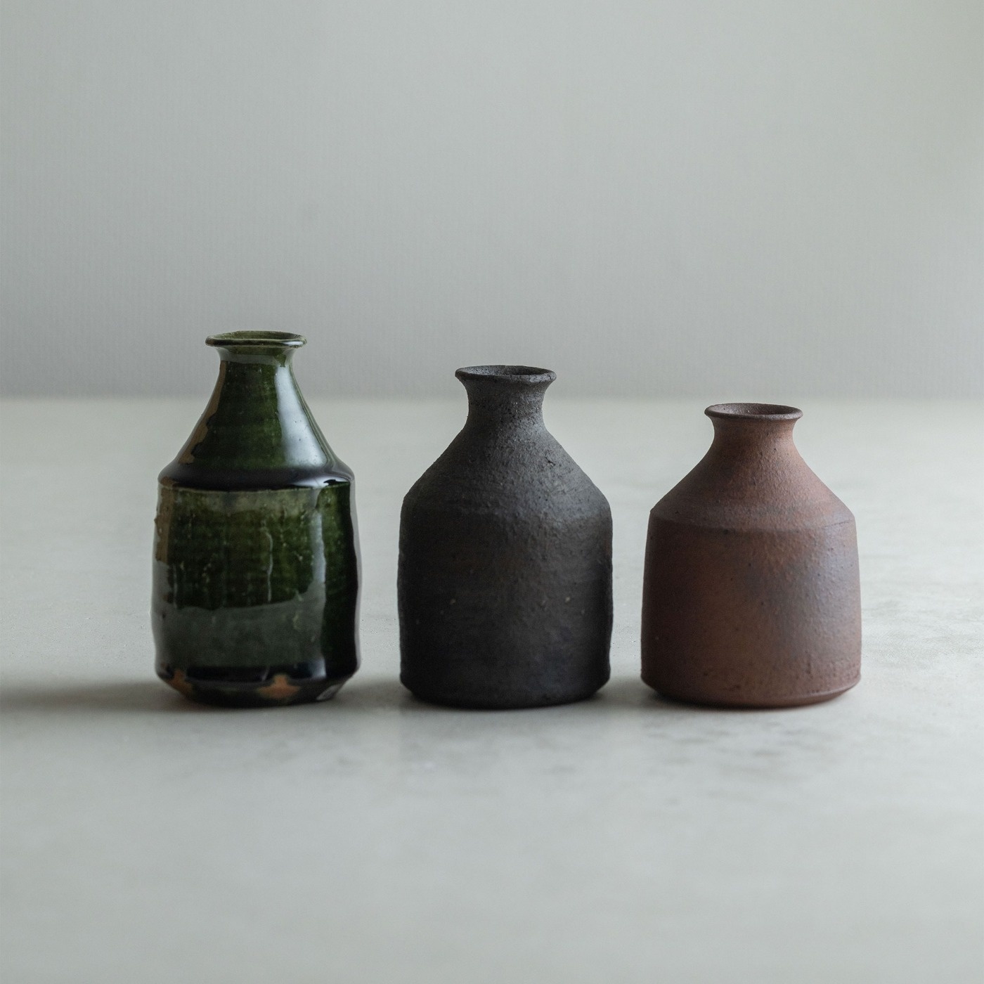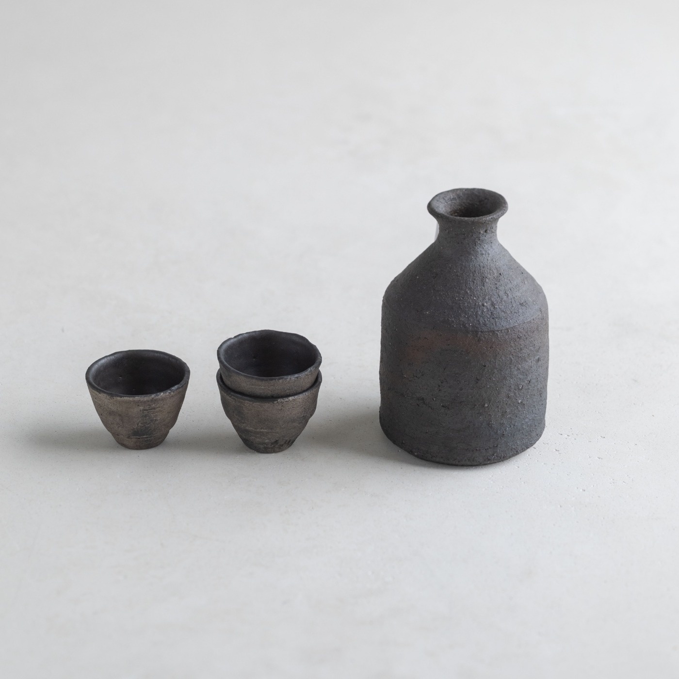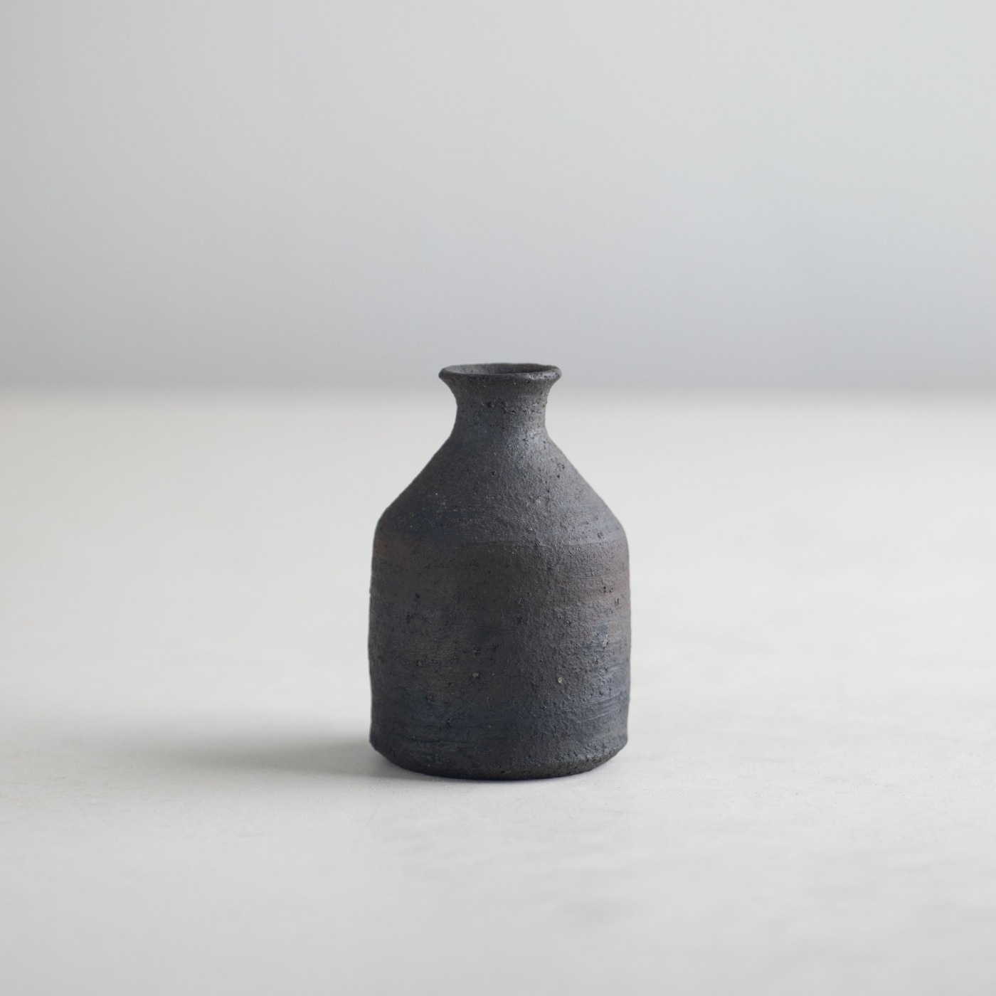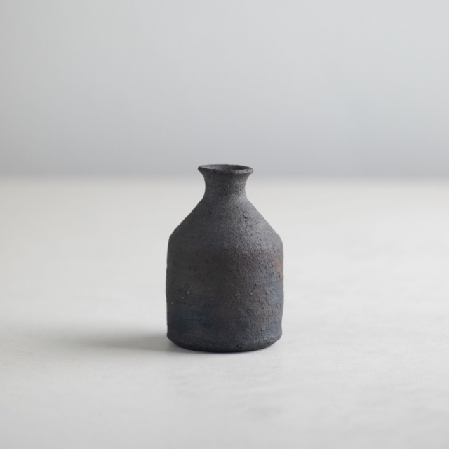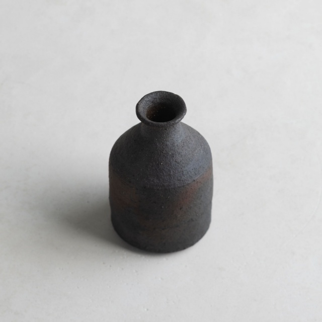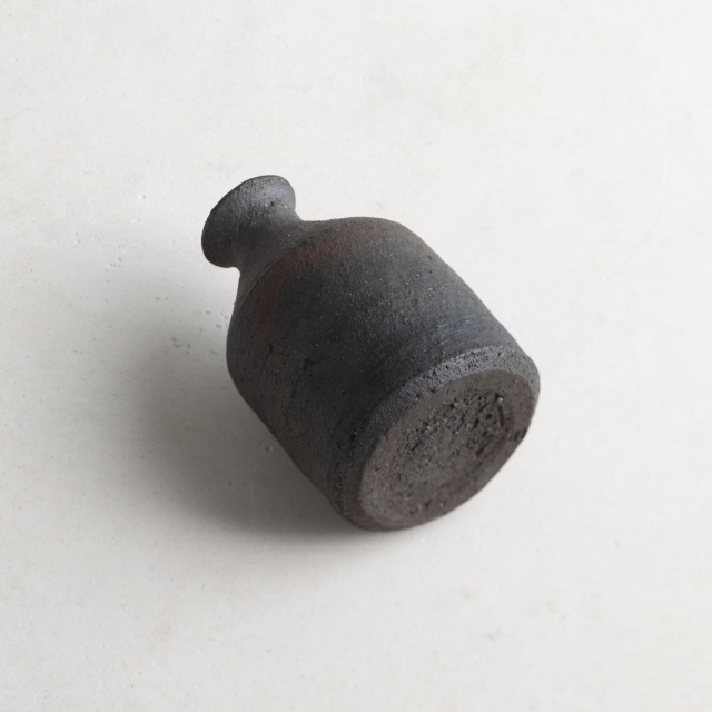 ずんぐりとした小ぶりのとっくり。炭化焼成後に漆をかけていて、マットなザラつきのある質感。とことどころ赤茶色が見え隠れします。容量は一合強の約200cc。