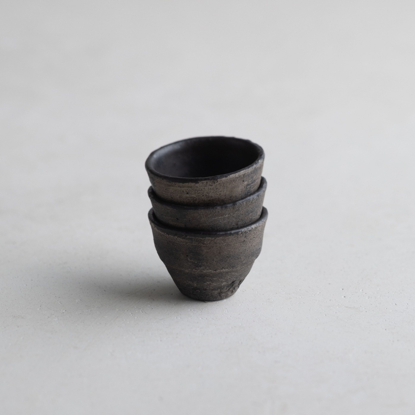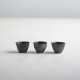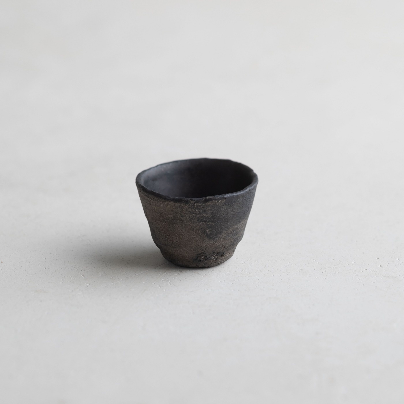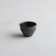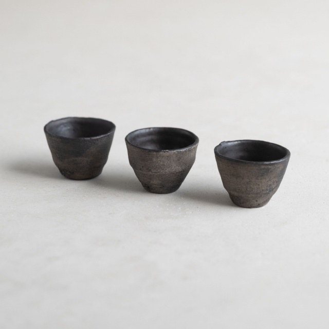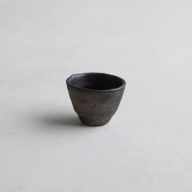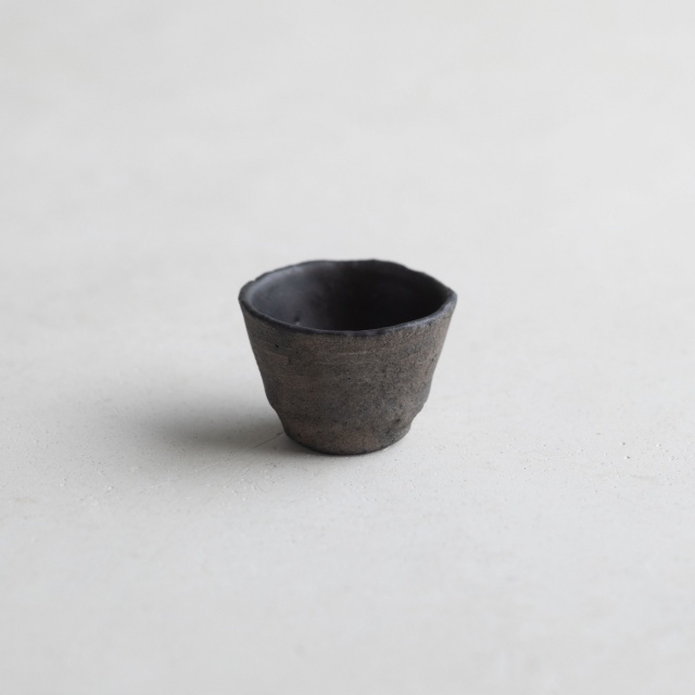 黒銀彩シリーズの小さな杯。テクスチャーに色の奥行きや手触り感のある黒銀彩は、黒色を塗って本焼きした後、外側に刷毛で銀を塗って焼き付け、仕上げに漆を染み込ませています。内側は釉薬がかかっていて滑らかです。