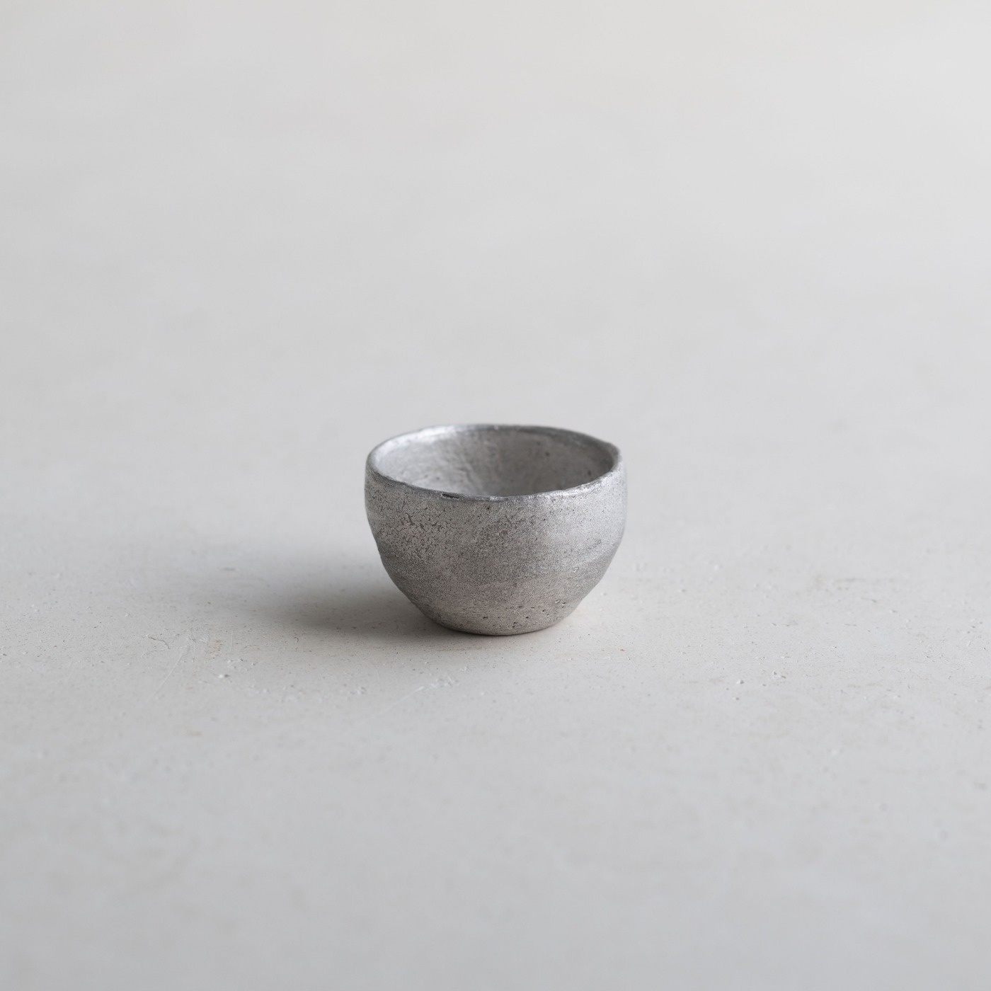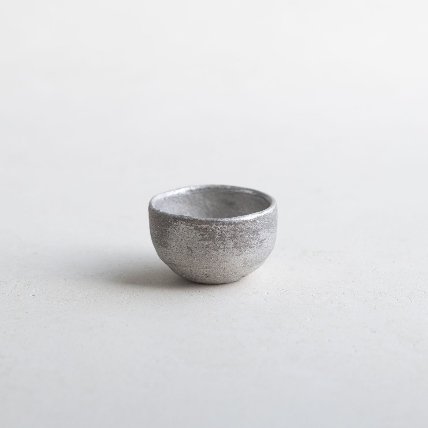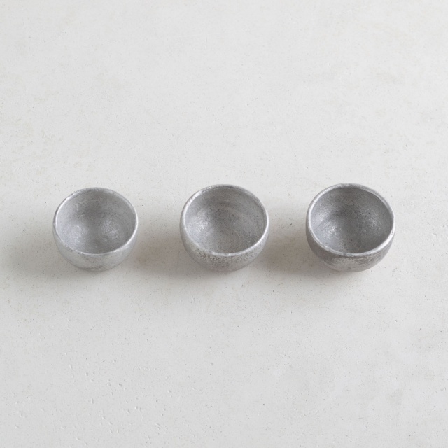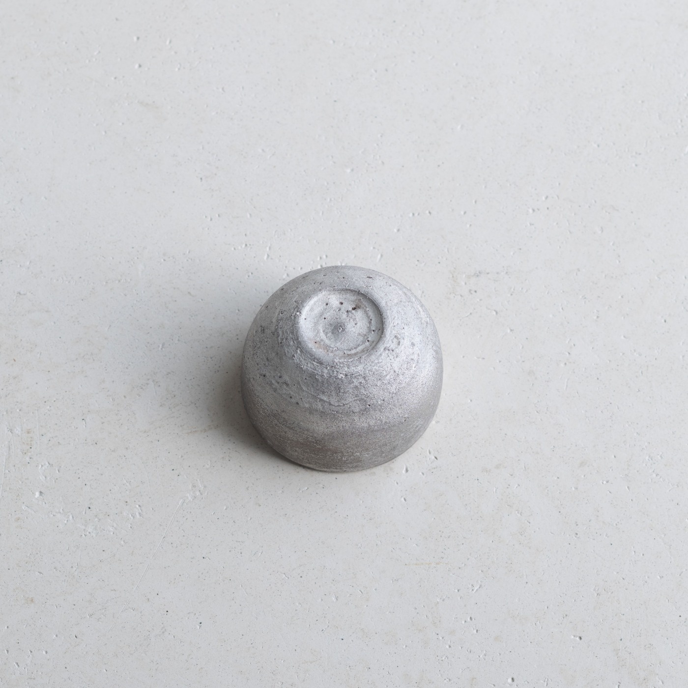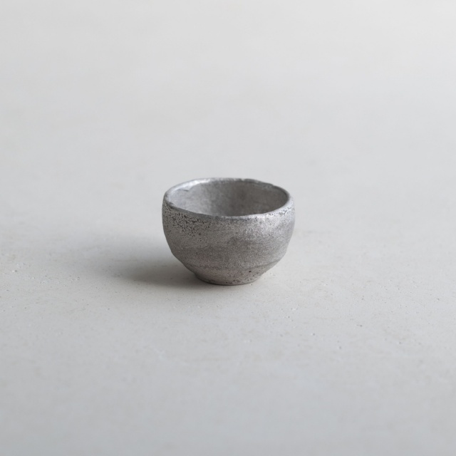 小さな銀彩杯。白い化粧土を施して焼いてから、純銀を塗って再び焼いているそうです。一つ一つの工程の積み重ねが、銀彩のテクスチャーとなっていて、西川さんらしい表情です。