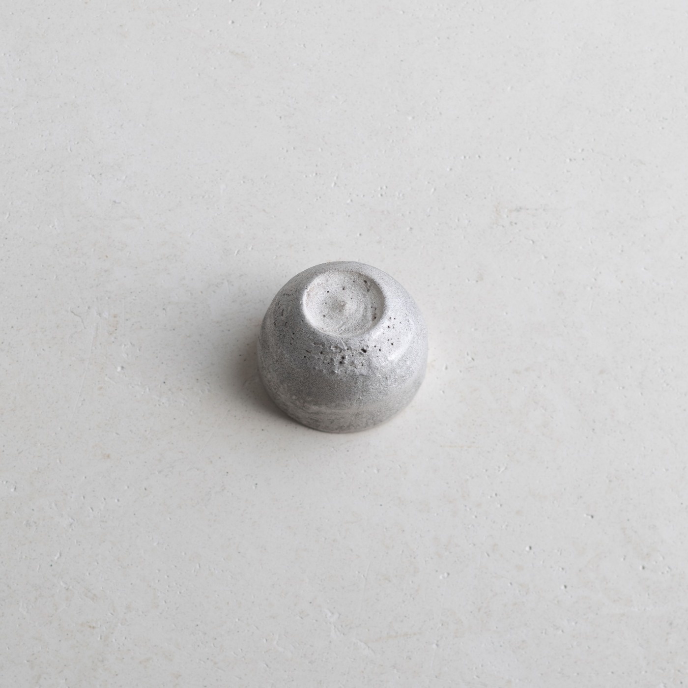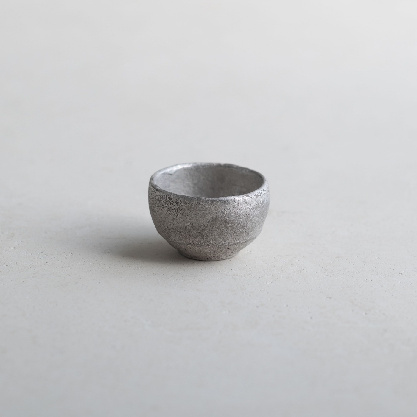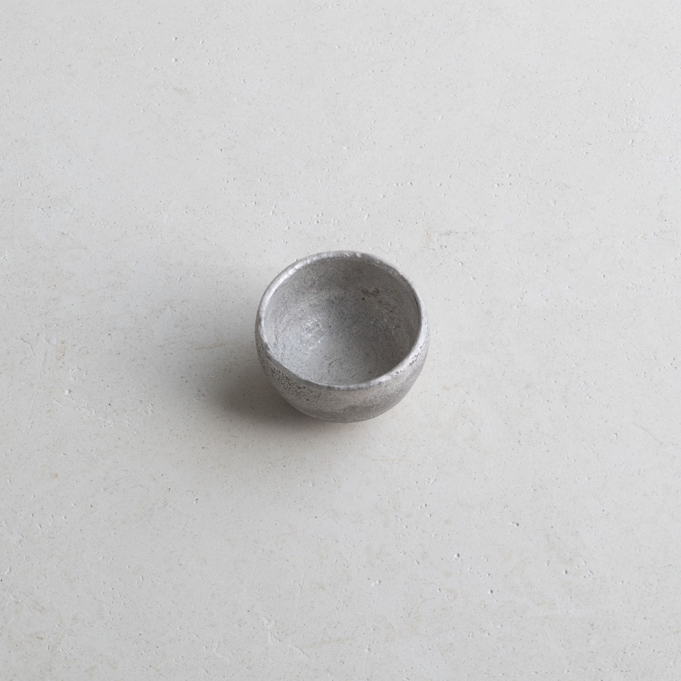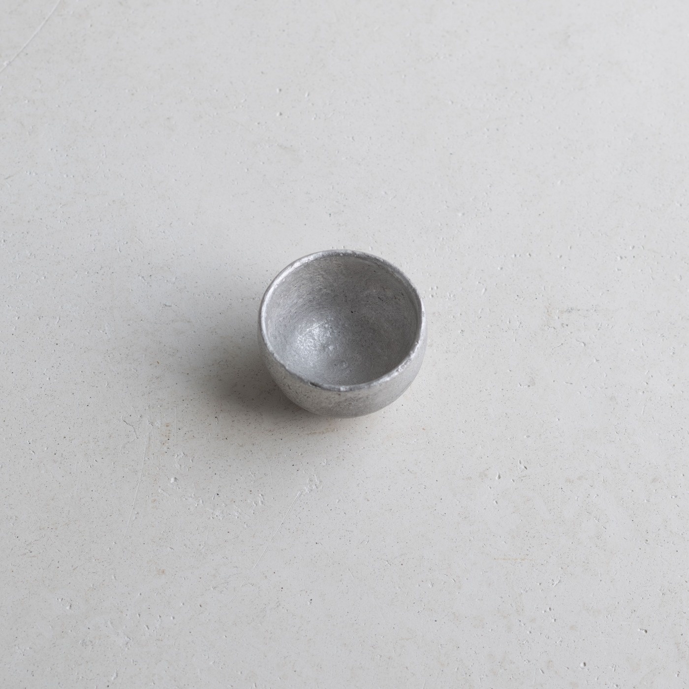 小さな銀彩杯。白い化粧土を施して焼いてから、純銀を塗って再び焼いているそうです。一つ一つの工程の積み重ねが、銀彩のテクスチャーとなっていて、西川さんらしい表情です。