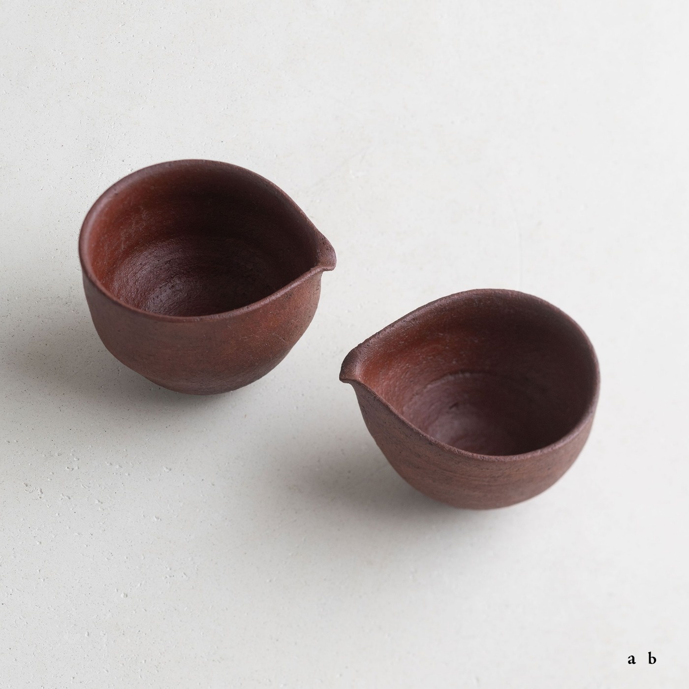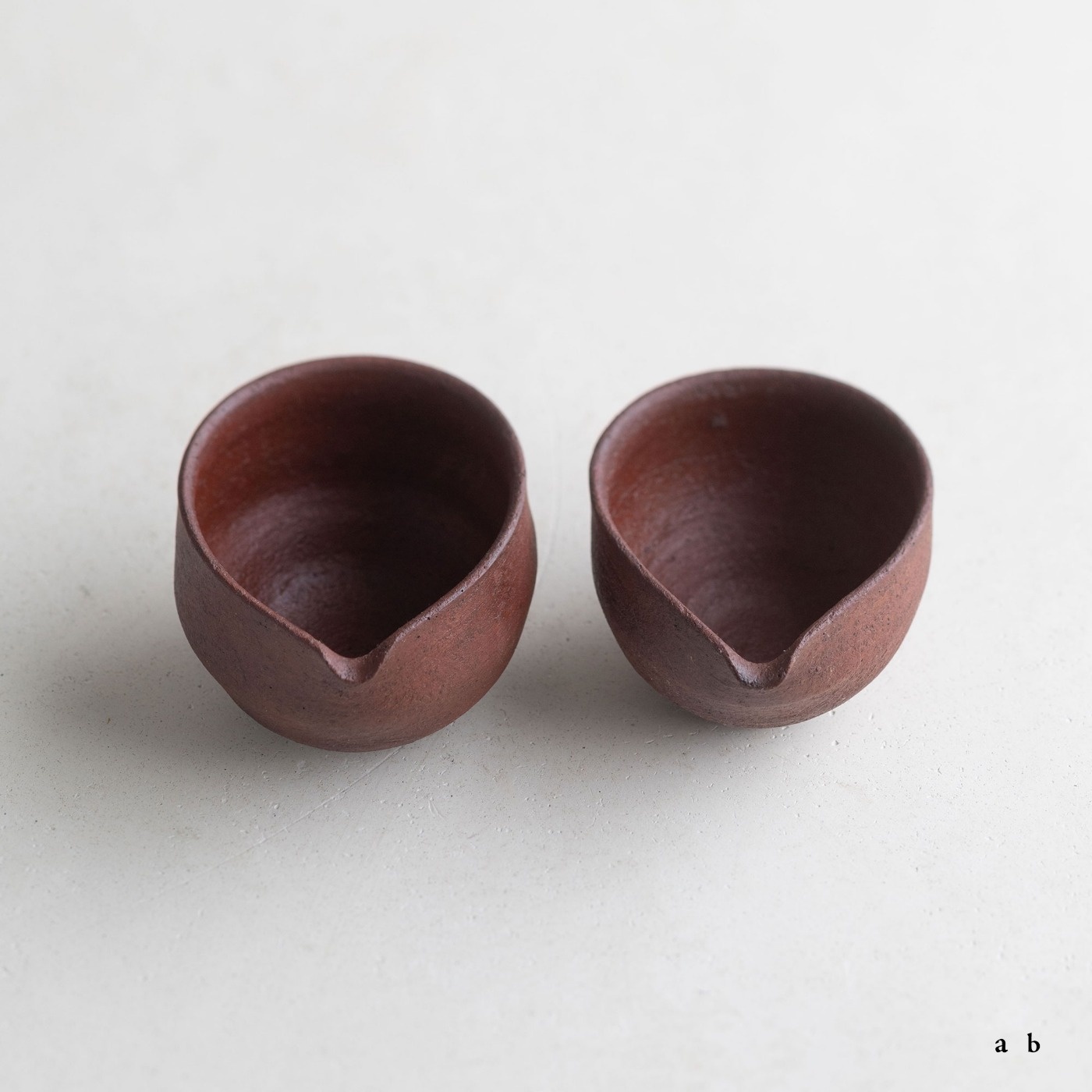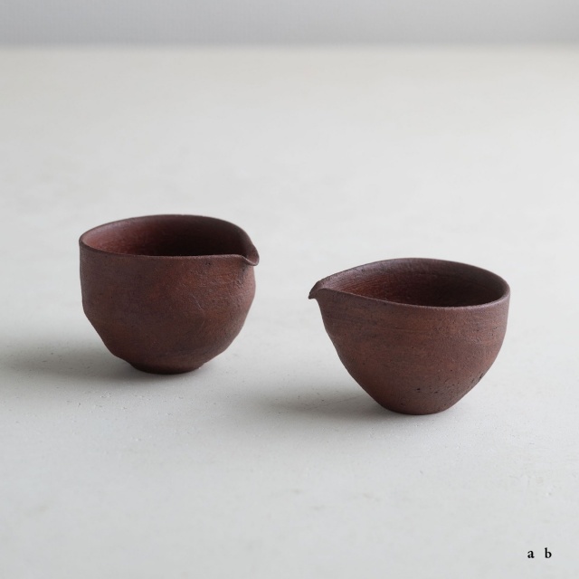 赤いシリーズの小さな片口で、容量は約80ccと60ccです。深みのある赤色の肌は、西川さんらしいテクスチャーがあって、表情や素材感を楽しめます。素焼き後に黒色を薄く塗って本焼きし、弁柄主体の赤絵を塗って再び焼き、最後に漆を染み込ませています。
