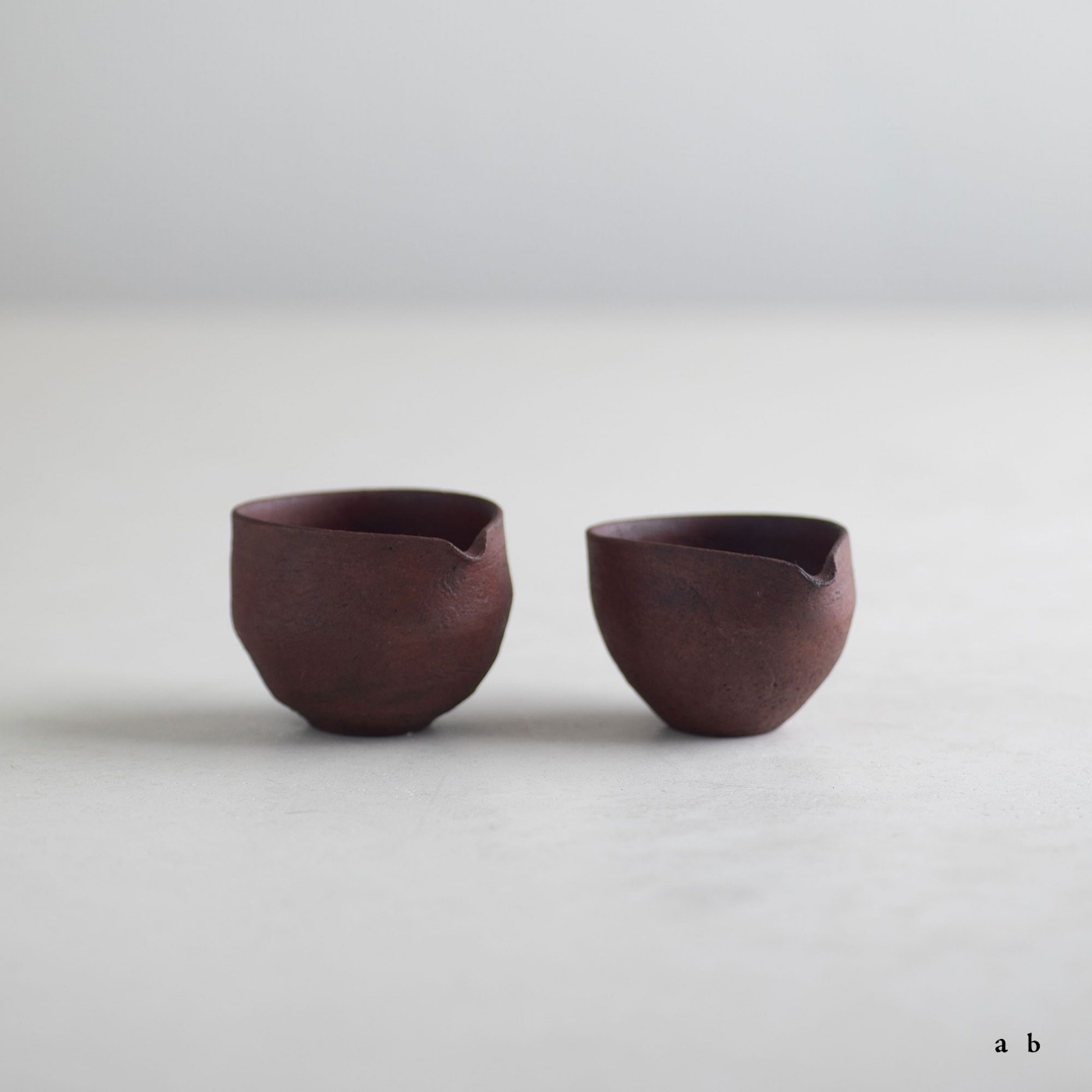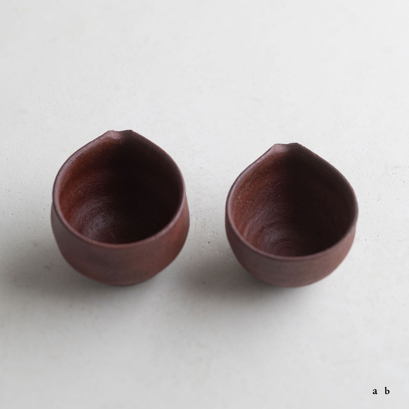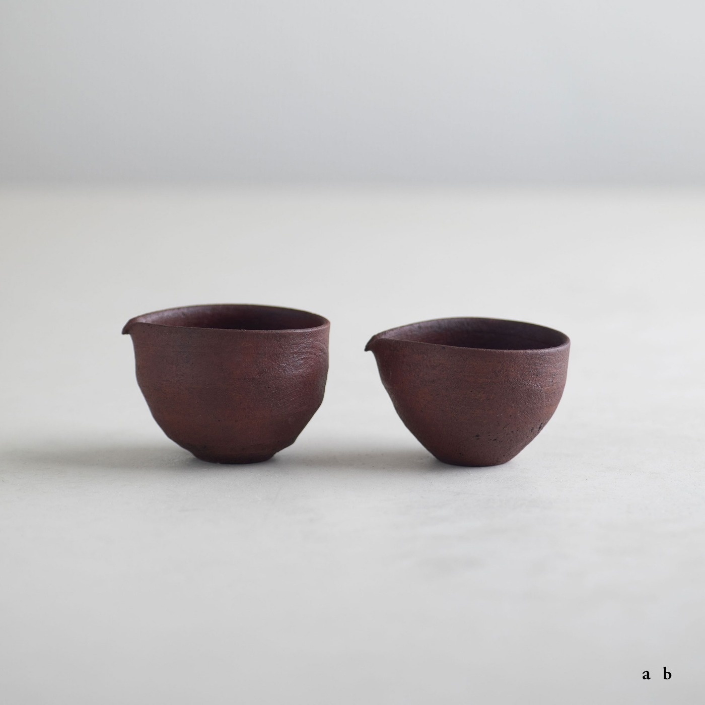 赤いシリーズの小さな片口で、容量は約80ccと60ccです。深みのある赤色の肌は、西川さんらしいテクスチャーがあって、表情や素材感を楽しめます。素焼き後に黒色を薄く塗って本焼きし、弁柄主体の赤絵を塗って再び焼き、最後に漆を染み込ませています。