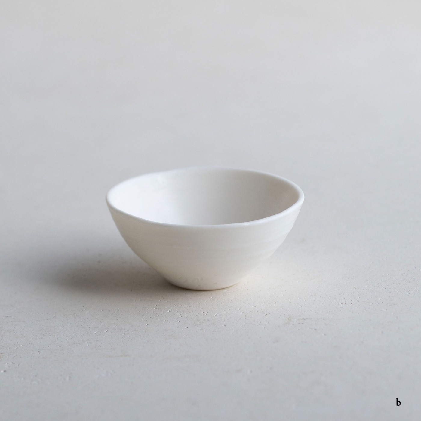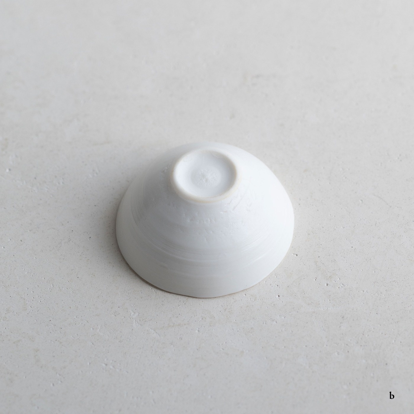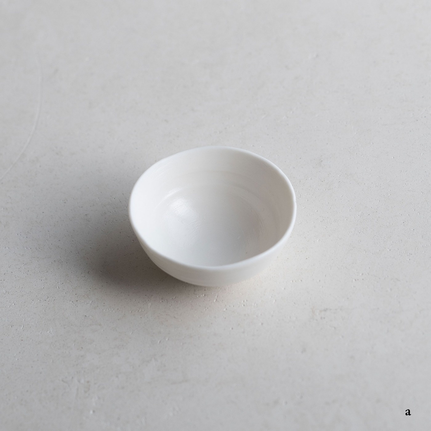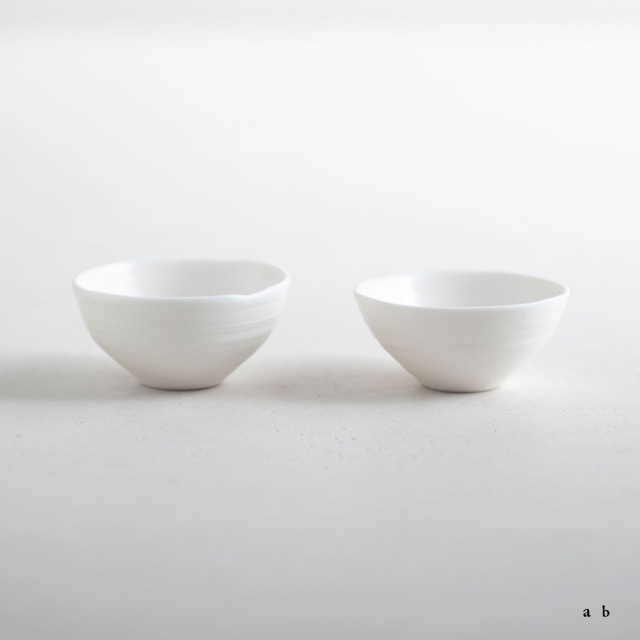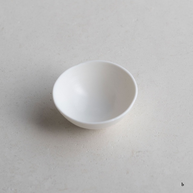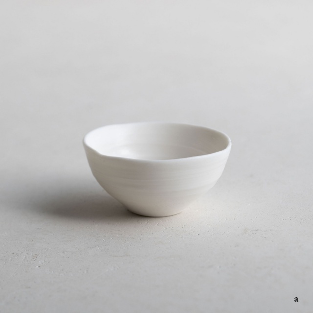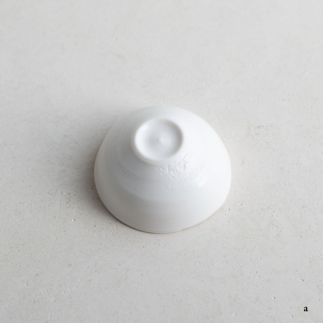 ボーンチャイナ特有の温かみのある乳白色の平杯。薄くて透明感のある白磁を求めて、ボーンチャイナを使用しているそうです。