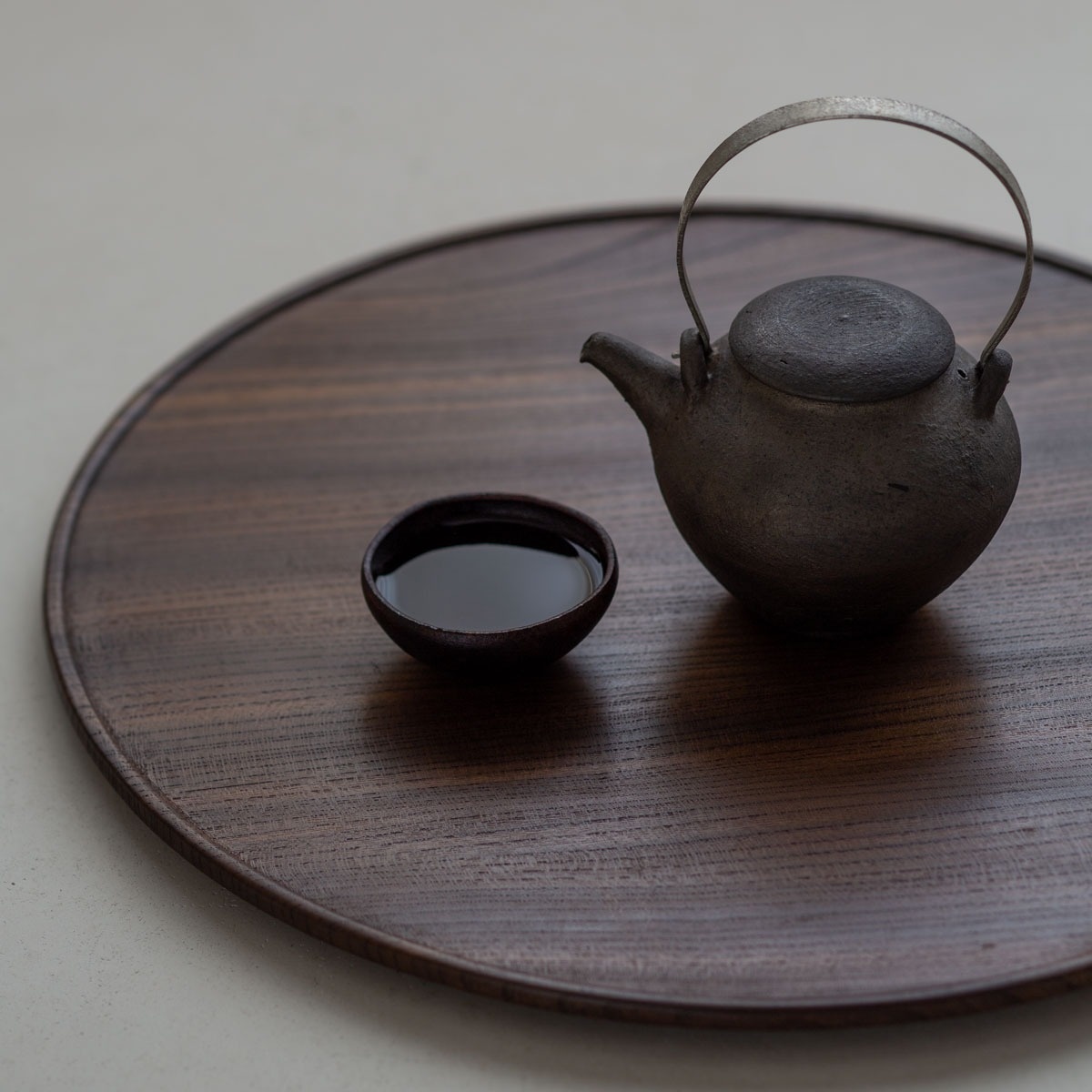 直径は約37センチ、大ぶりの丸盆です。千年以上埋もれていたとされる神代欅は、シックな色味が特徴的で、縁も上品な雰囲気です。縁の裏側は手が入りやすい角度になっていて、軽やかな佇まいです。