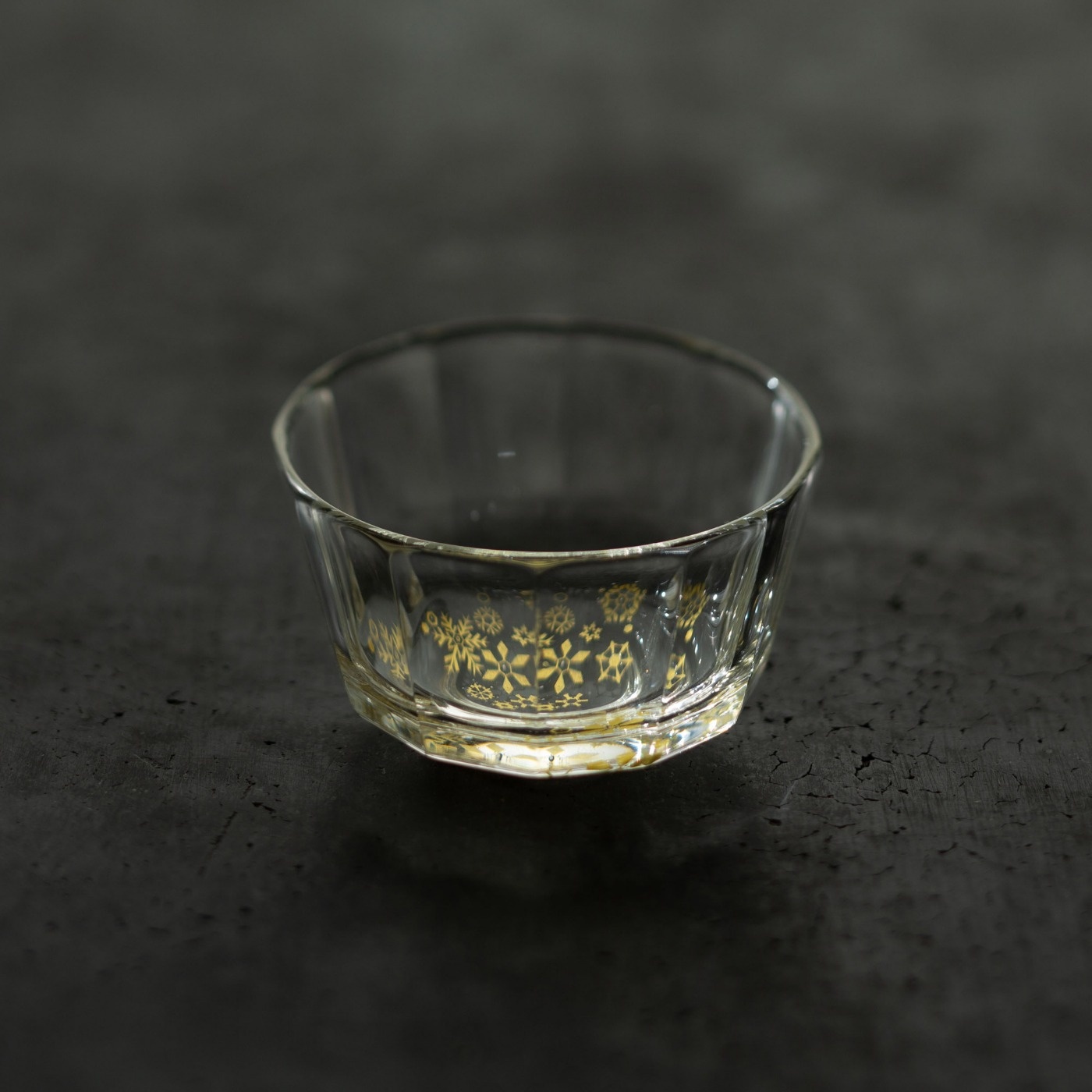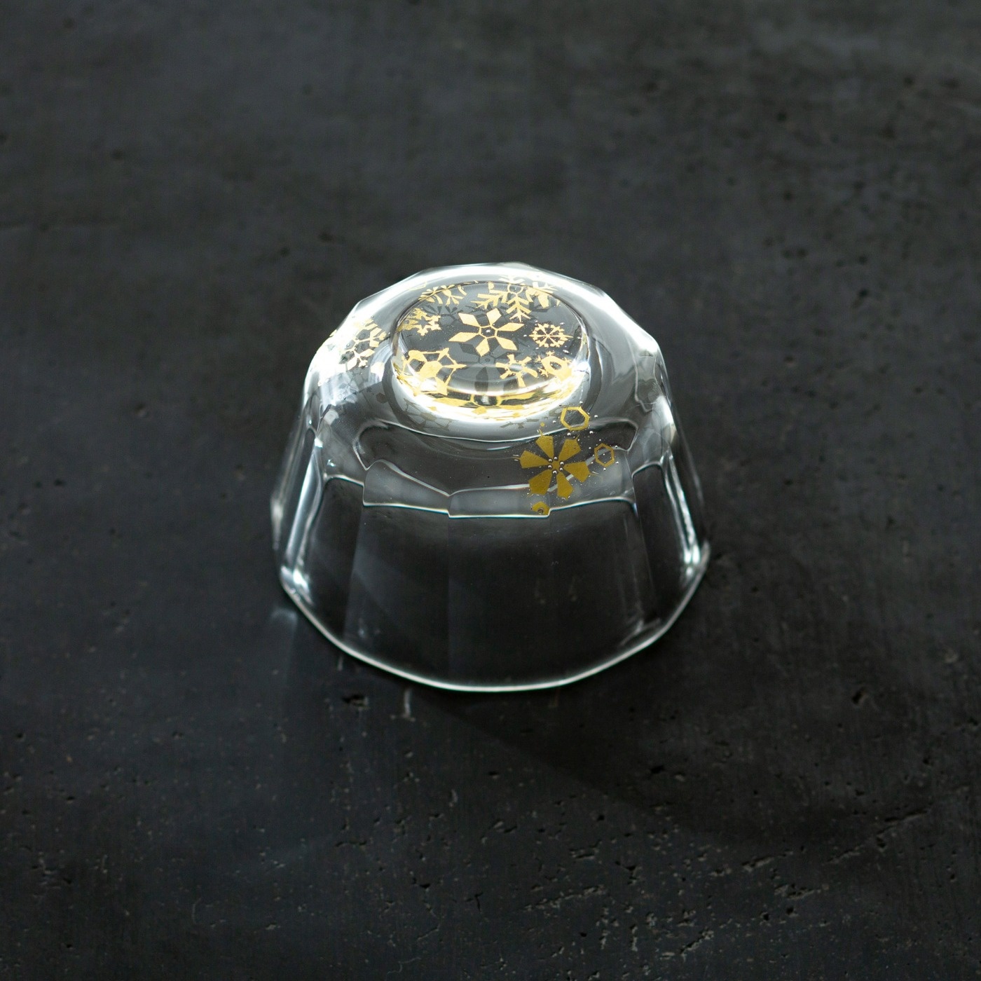 ガラスとガラスの間に金を挟むゴールドサンドイッチ技法をヒントに、由良さんが考案したオリジナル技法で制作。金箔(金澄)を熱で圧着して絵を彫り込み、自由で繊細な図案を実現しています。器の内側と口辺は宙吹きを活かし、お酒を注ぐと、カット面への金の写り込みが変わり、角度によってさまざまな表情を楽しめます。