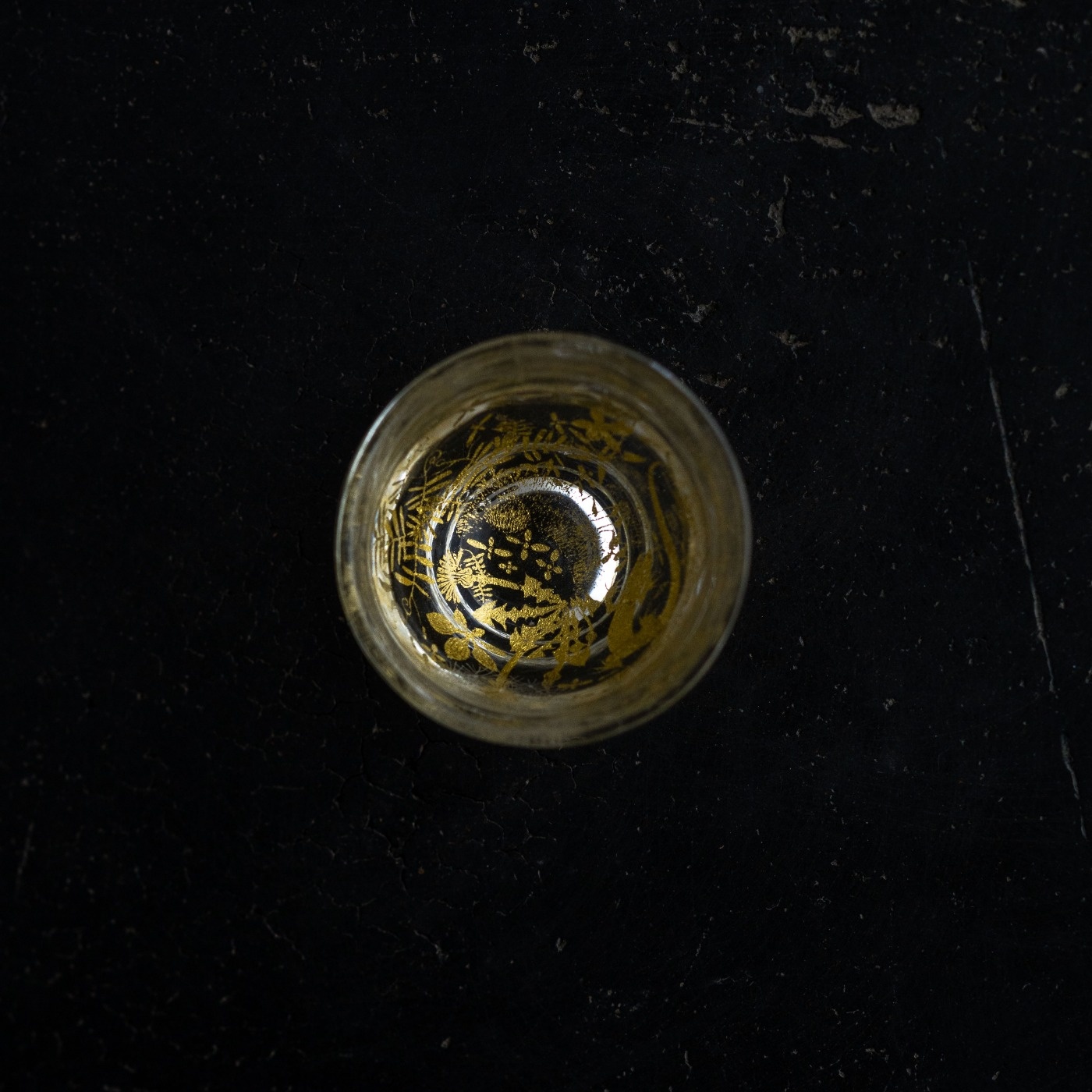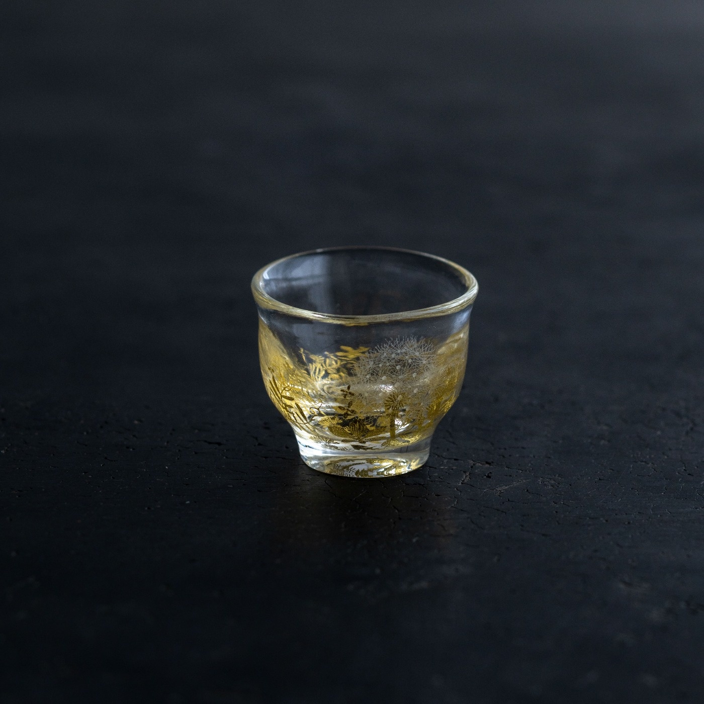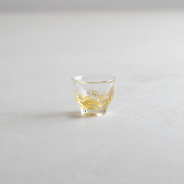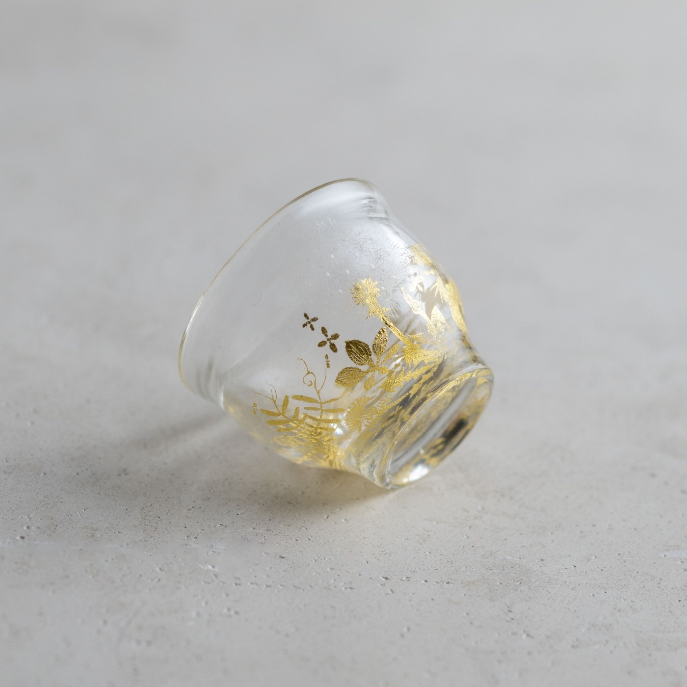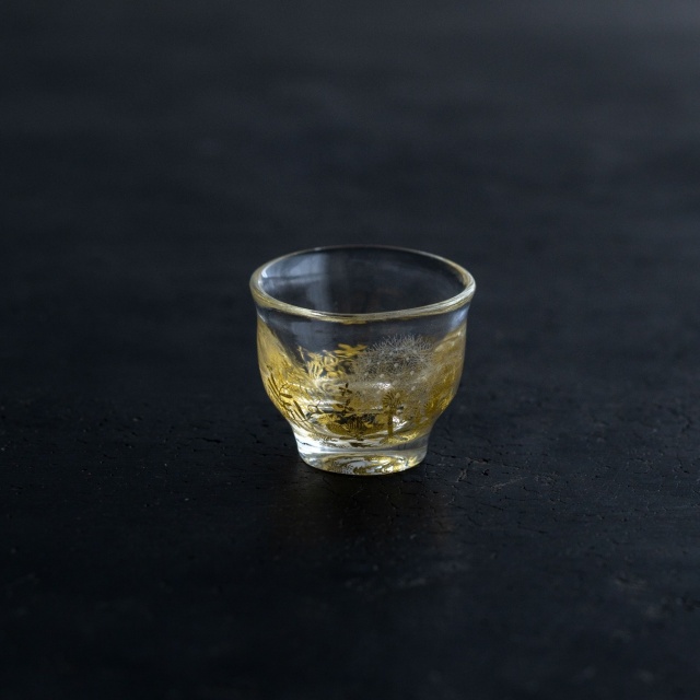 ガラスとガラスの間に金を挟むゴールドサンドイッチ技法をヒントに、由良さんが考案したオリジナル技法で制作。金箔(金澄)を熱で圧着して絵を彫り込み、自由で繊細な図案を実現しています。ガラスに挟まれているため、使用によって金が変色したり、擦れることがないのも特徴です。