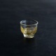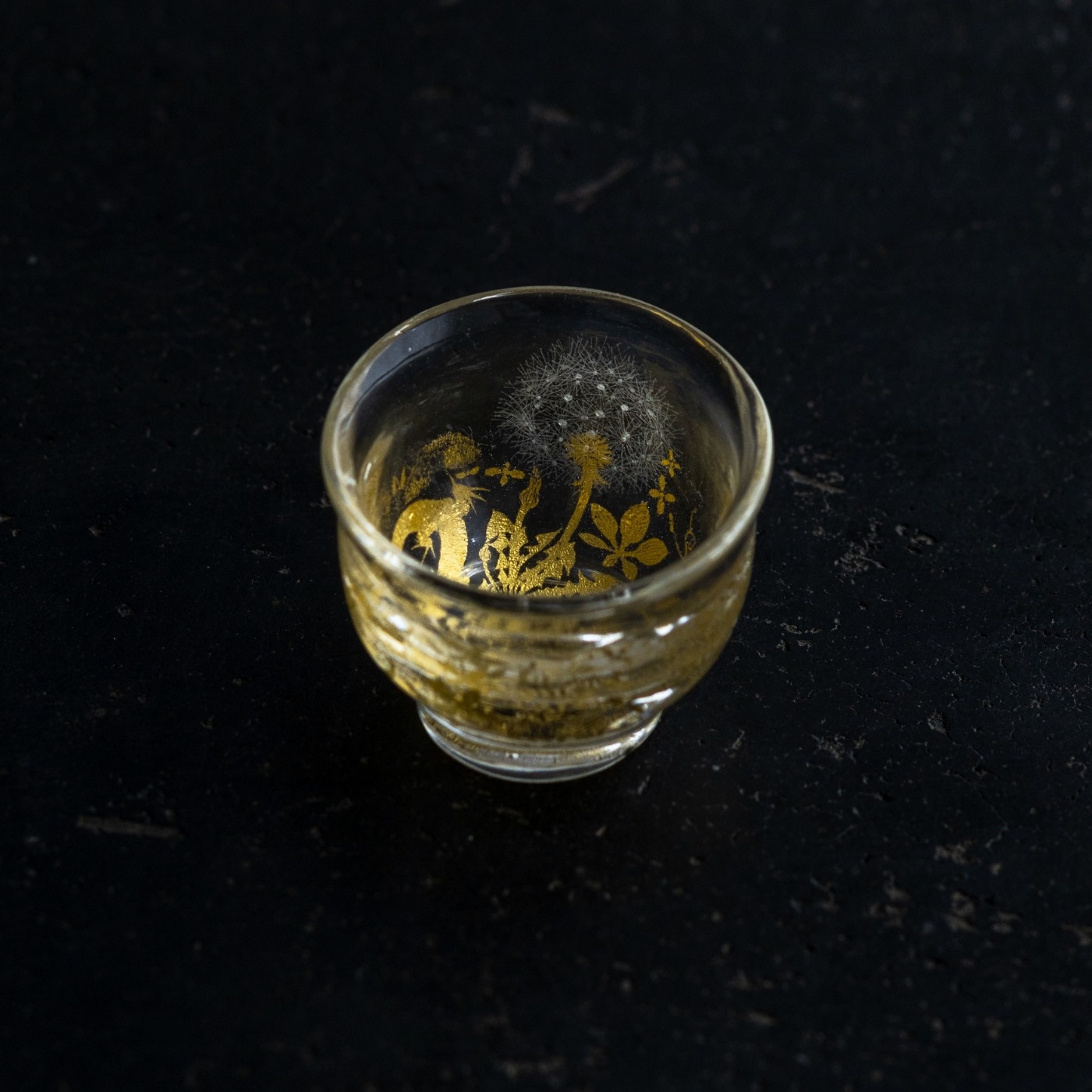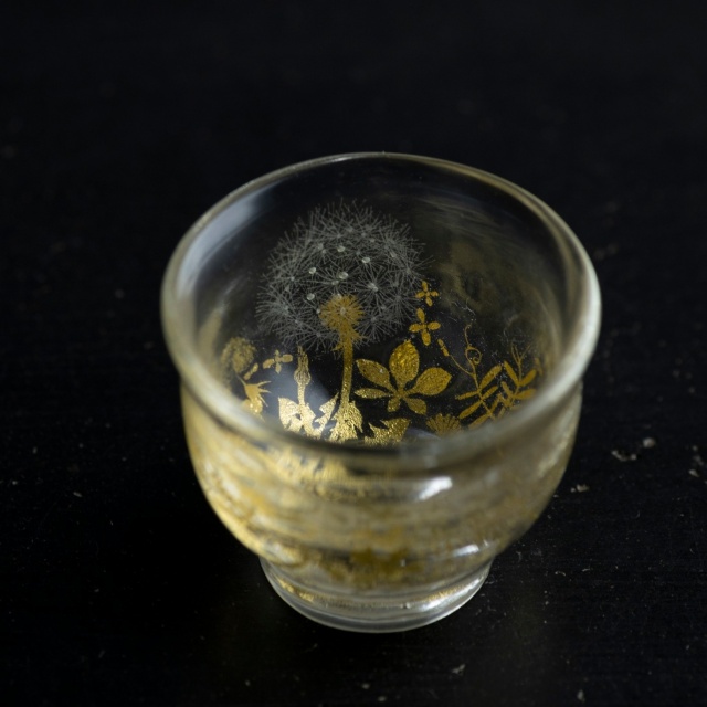 口径約4.5センチ、高さ約3.6センチの小さな猪口。口縁は外側だけでなく内側も削って薄くなめらかに、口当たり良く仕上げられています。形に沿って伸びやかな図案は、タンポポ、スミレ、カラスノエンドウ、コケ、トカゲなど春の生き物たち。図案上部の余白を利用して、タンポポの綿毛も繊細に彫り込まれています。この綿毛は、ガラスの内側と外側の両面から彫ることで、フワフワ感を表現。「内側を彫るのはとても大変な作業でした」と由良さん。目に見えるか見えないかの微細な点と線にも、小さな生命へのまなざしが感じられます。