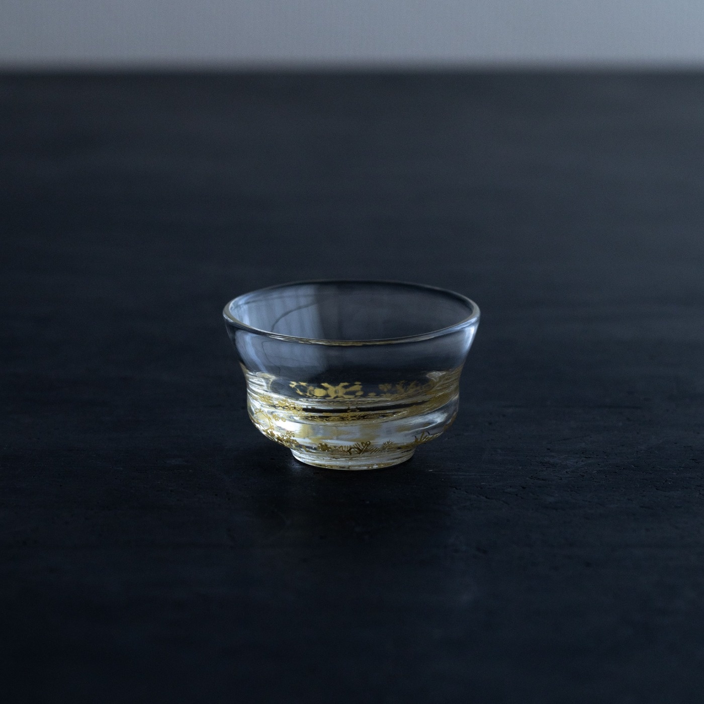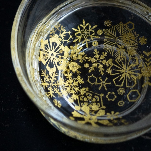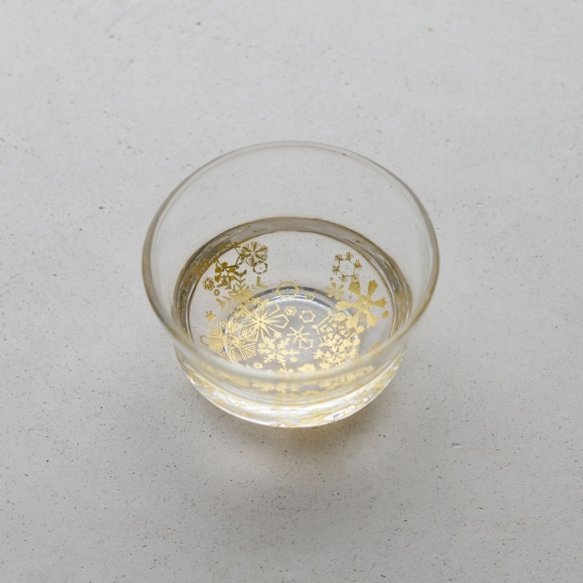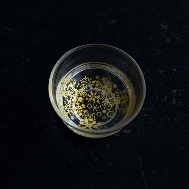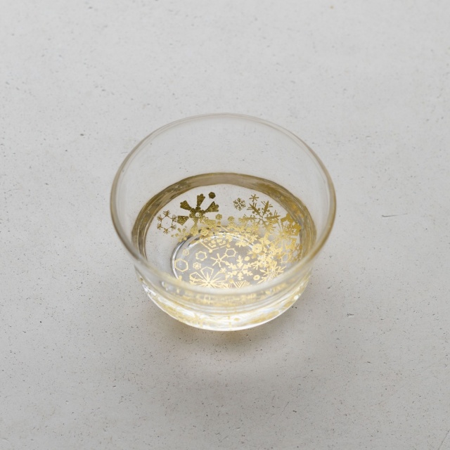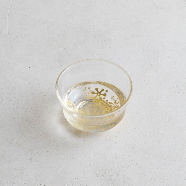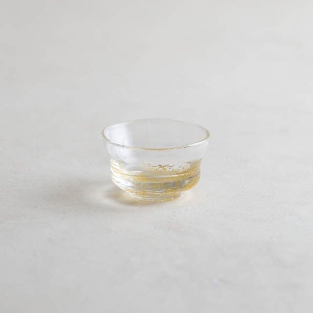 ガラスとガラスの間に金を挟むゴールドサンドイッチ技法をヒントに、由良さんが考案したオリジナル技法で制作。金箔(金澄)を熱で圧着してから、絵を残すように彫り込み、自由で繊細な図案を実現しています。宙吹きしたガラスの厚みを削ったり磨いたりと手を掛けて、持ちやすく口当たりも良いぐい呑みに仕上げています。