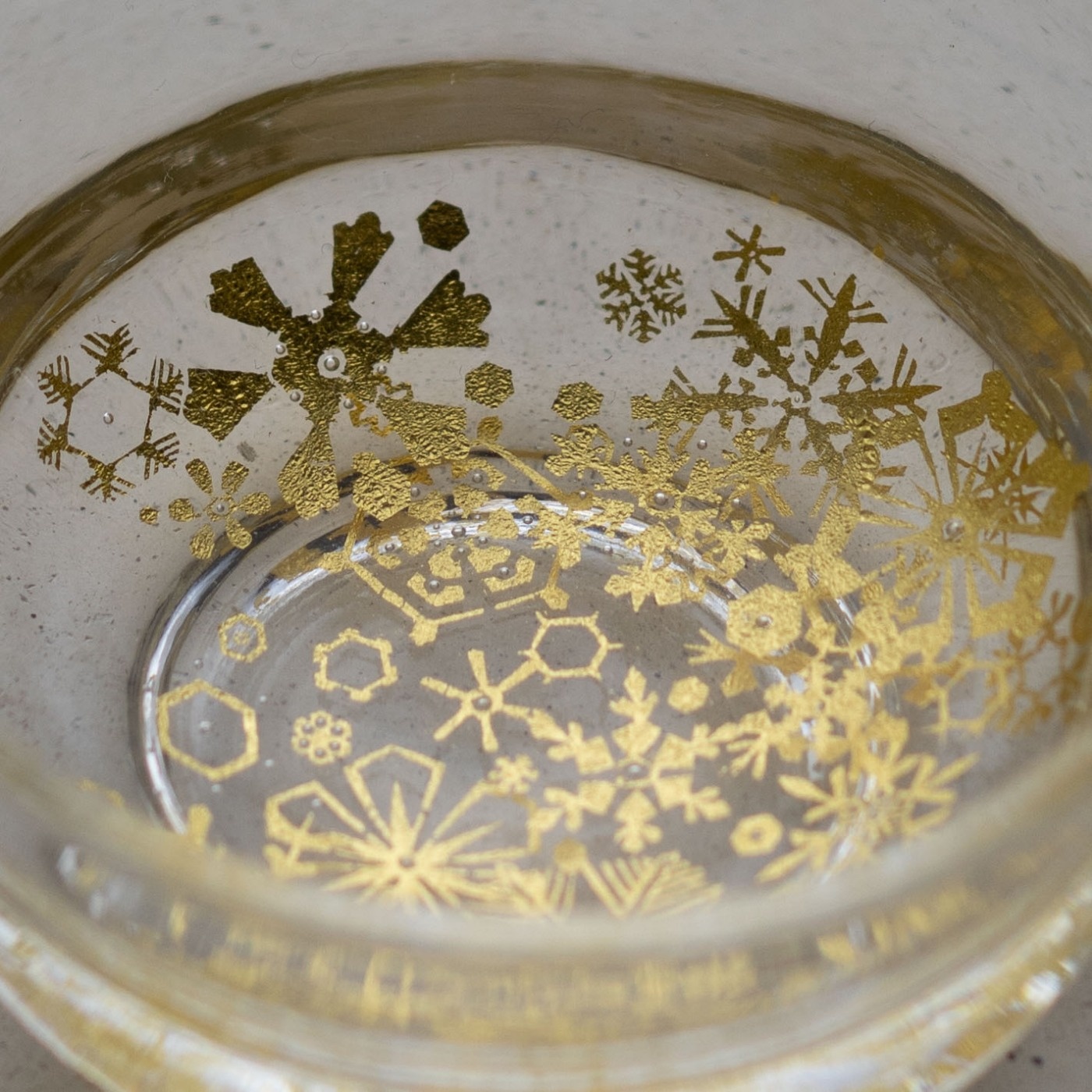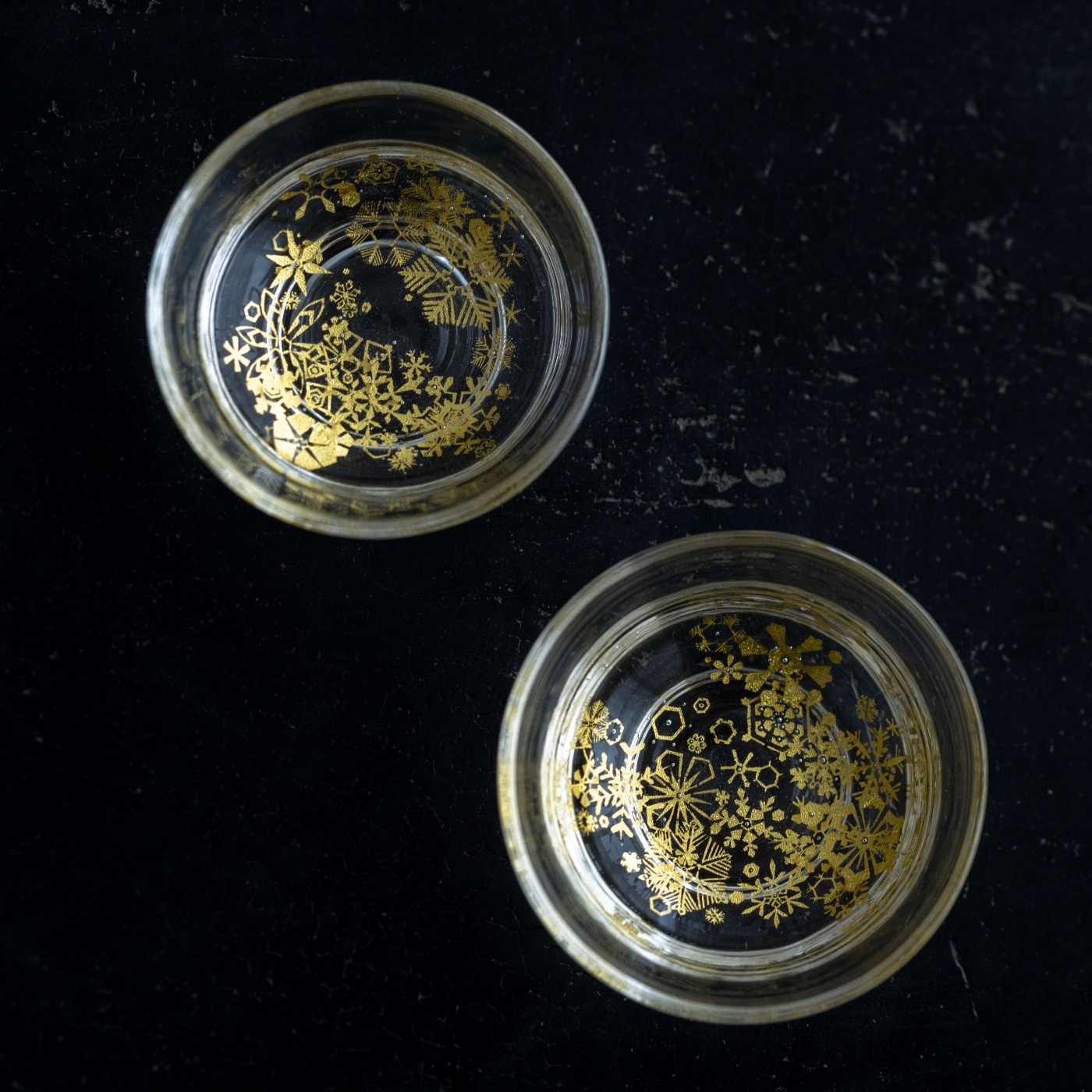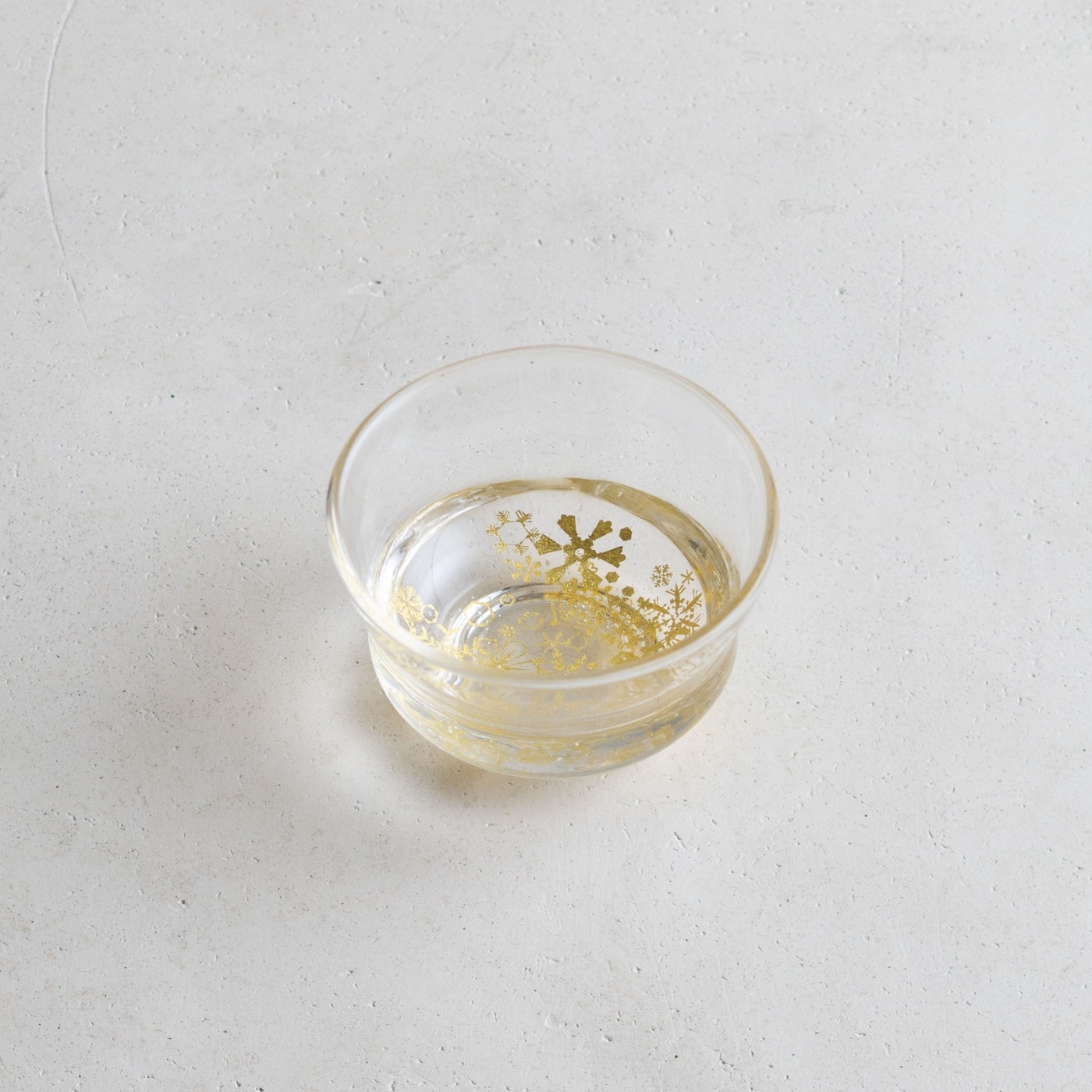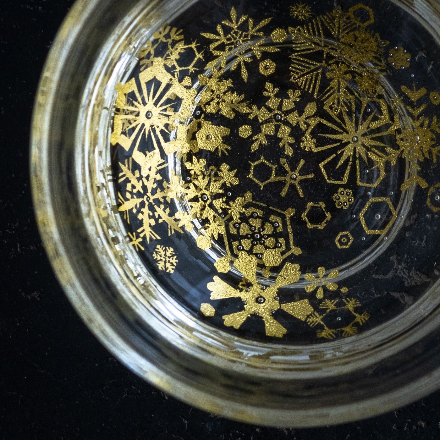 ガラスとガラスの間に金を挟むゴールドサンドイッチ技法をヒントに、由良さんが考案したオリジナル技法で制作。金箔(金澄)を熱で圧着してから、絵を残すように彫り込み、自由で繊細な図案を実現しています。宙吹きしたガラスの厚みを削ったり磨いたりと手を掛けて、持ちやすく口当たりも良いぐい呑みに仕上げています。