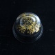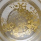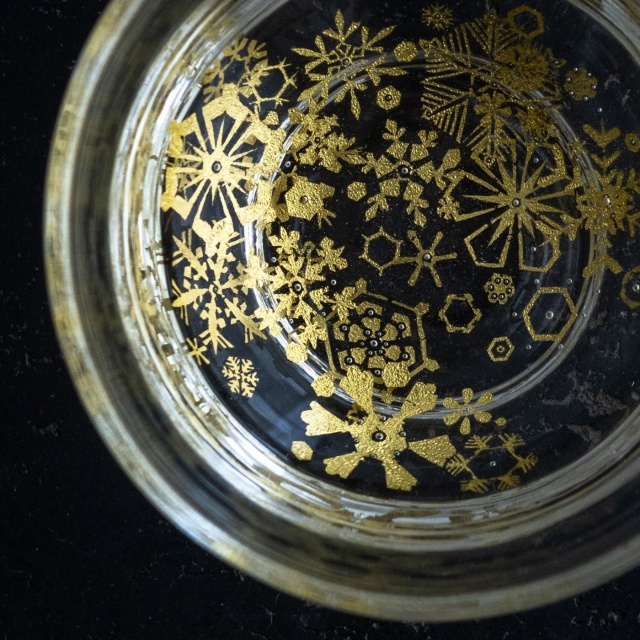 金の図案が二重になっていて、金の一層目と二層目の間に薄くガラスの層が仕込まれた新作です。「金と金の間で反射する様子や、光と影の具合で金の色味がより複雑に味わえると思います」