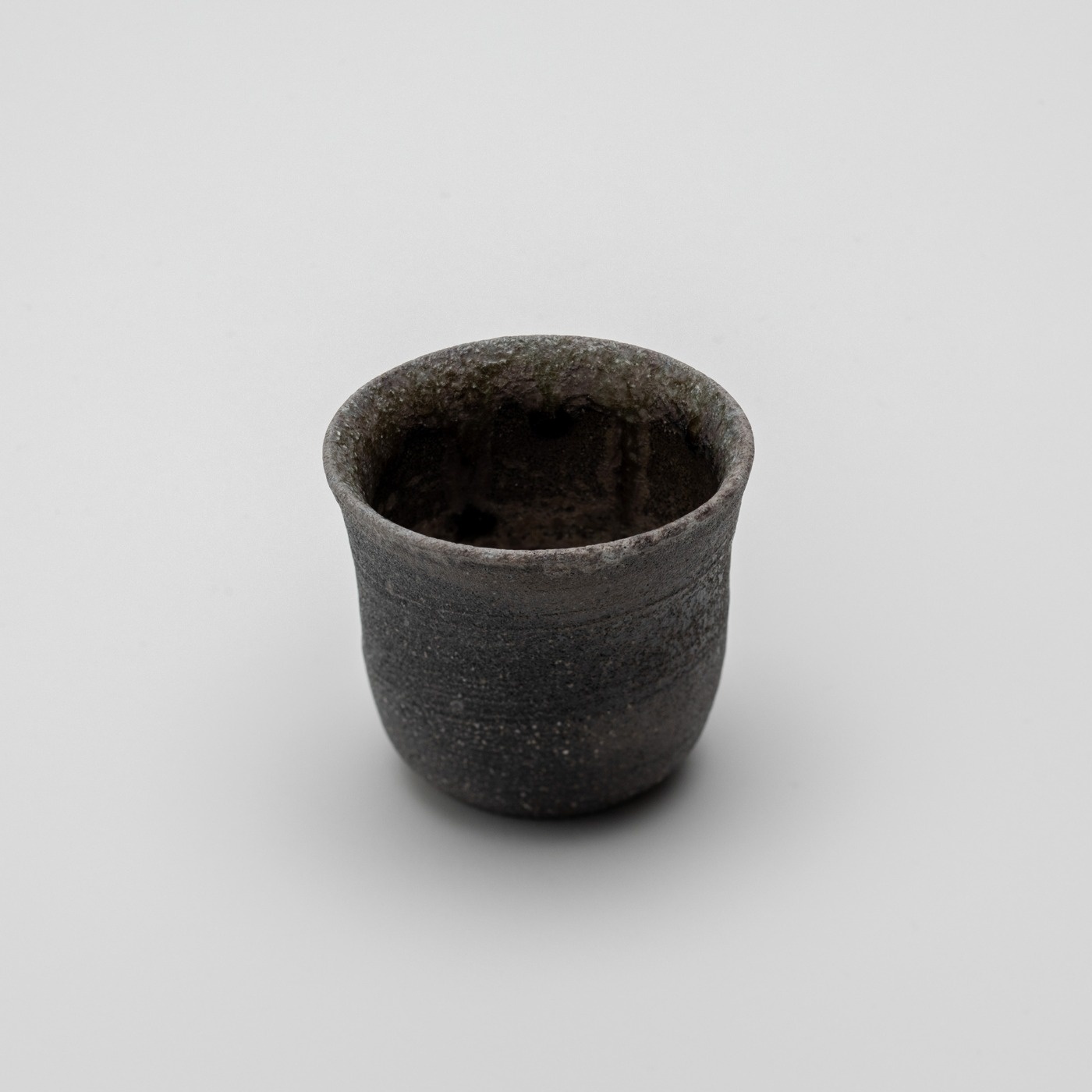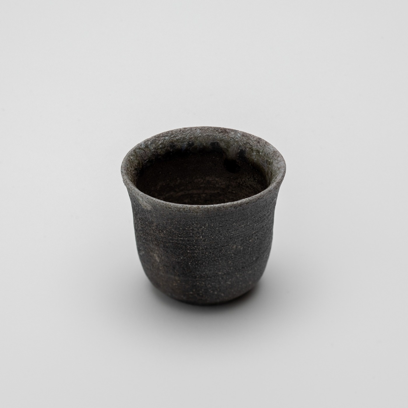 強還元焼成によって焼締められる珠洲焼。端反りタイプのぐい呑で、口縁は薄手です。外側は落ち着いた雰囲気ですが、内側は自然釉の流れや溜まりが表情豊かで、お酒を注いで覗いてみたくなります。